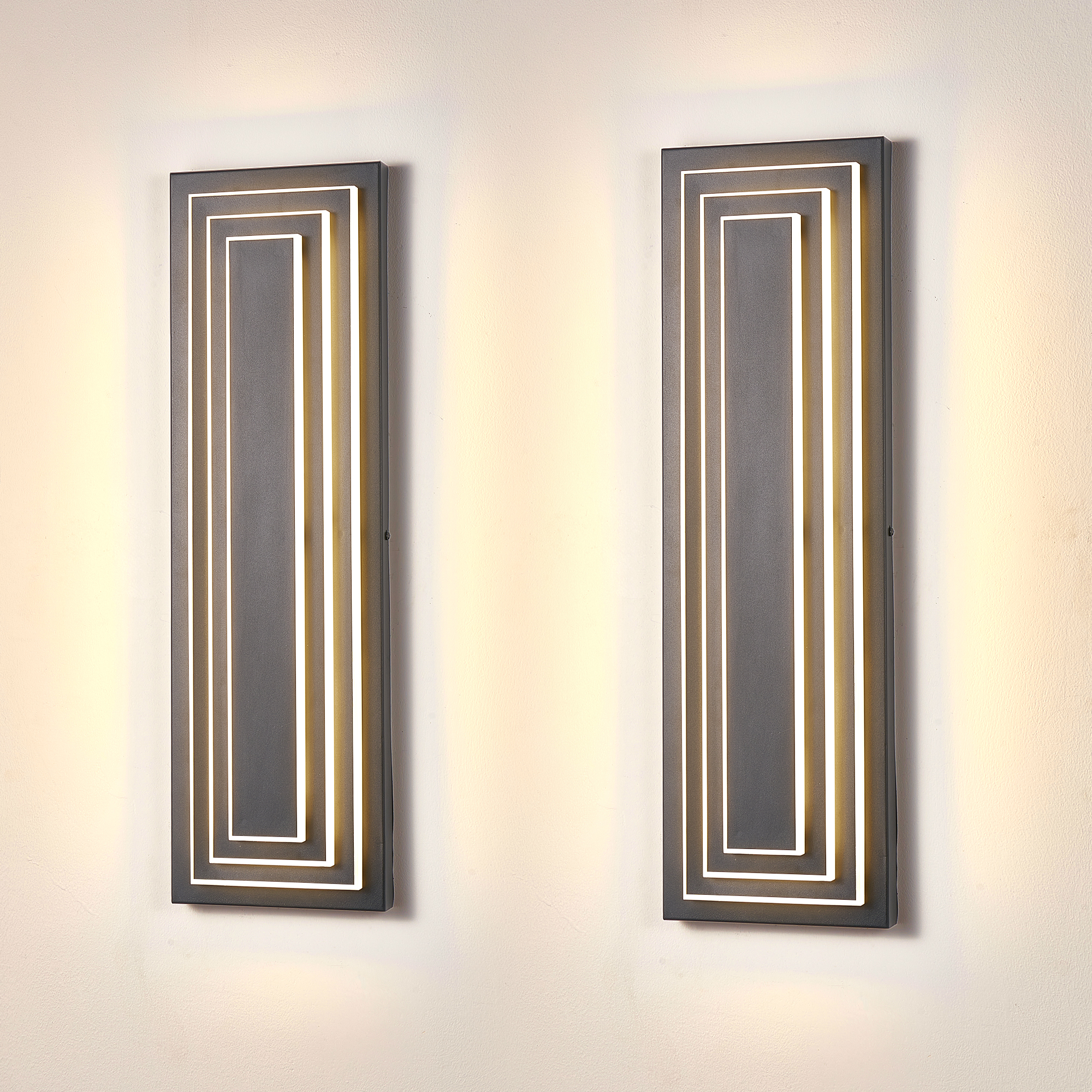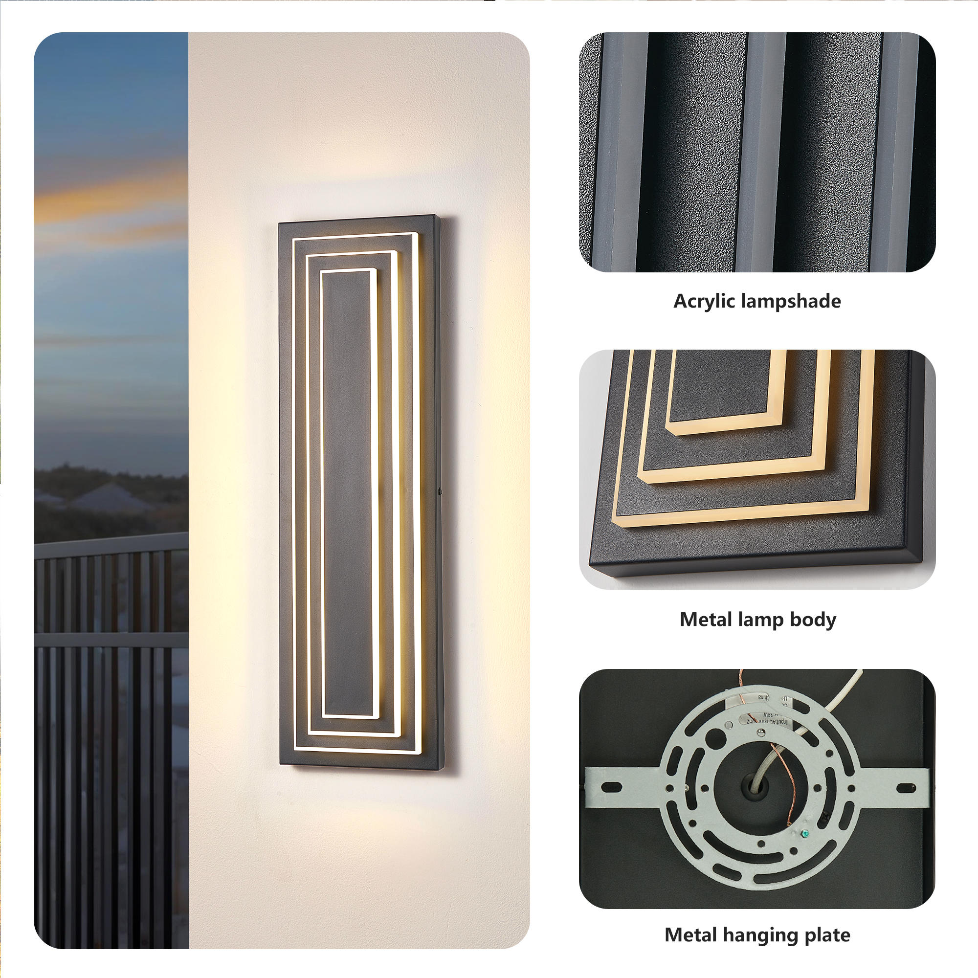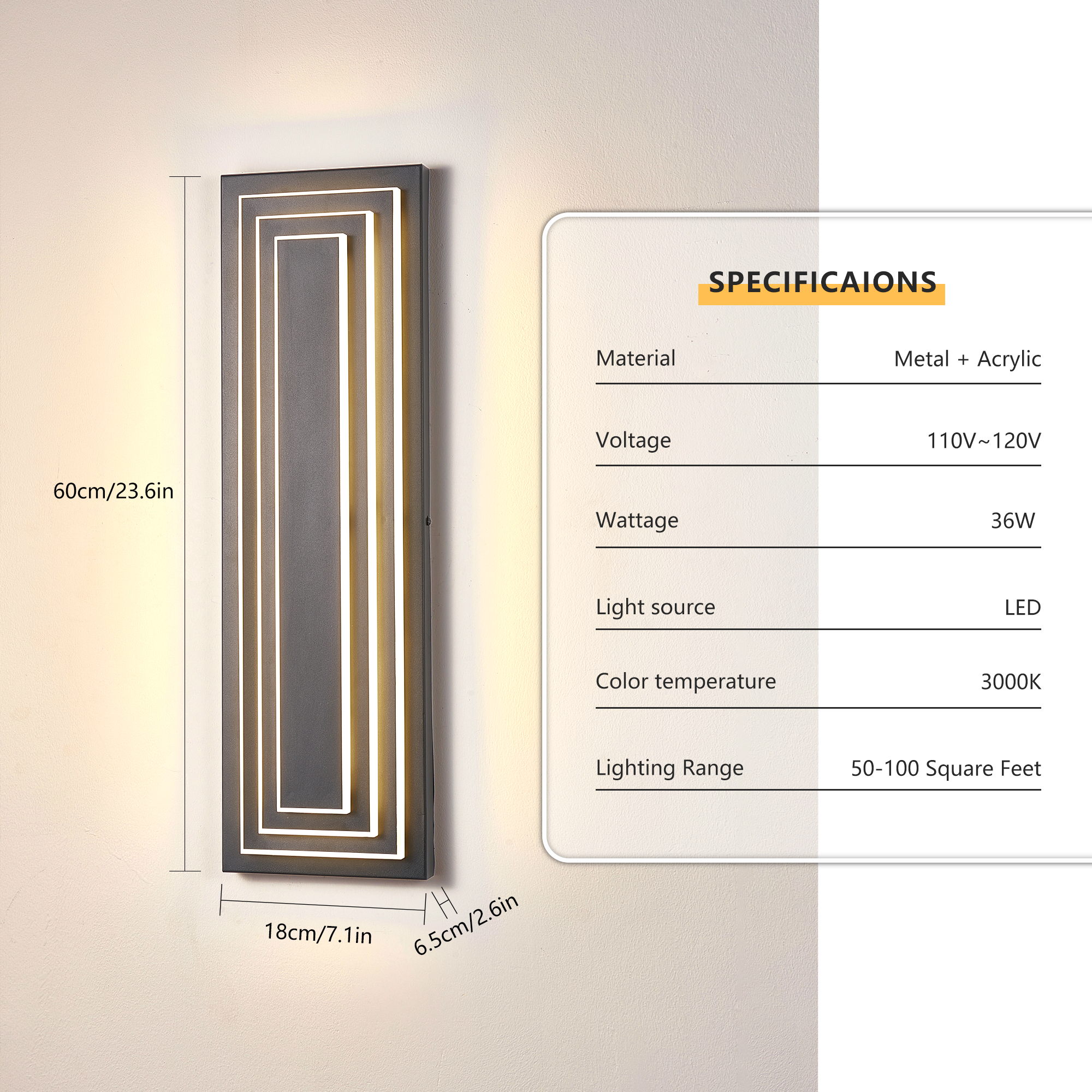 Elegant Modern Sconces Wall Lighting Design:Our outdoor long wall light 2 packs have a sleek and minimalism design that adds a touch of style to any exterior entryway.Excellent 3-tier Outdoor Light Sconce Decor: The long outdoor lights wall mount serve as excellent decorative additions to outdoor spaces. The stylish design of the three-layer acrylic lampshade reflects a brighter and warmer light.Making a complementary light source and decorative use in the interior and exteriorWaterproof & Rust-proof Up Down Wall Sconce: The black outdoor lights wall mount house meet a high standard of waterproof and performs exceptionally well even in wet conditions.Suitable For Outdoor & Indoor Use: Use large outdoor coach lights to add soft, ambient lighting to the front door,porch,garage,side terrace lighting, back patio wall lights, the foyer, entryway, courtyard,garden,as well as indoor halls, stairwells, corridors, living room,bedroom and other areas where a softer, ambient lighting is desired