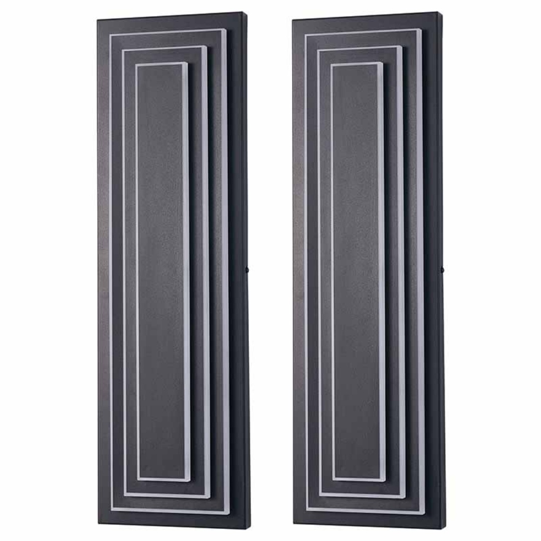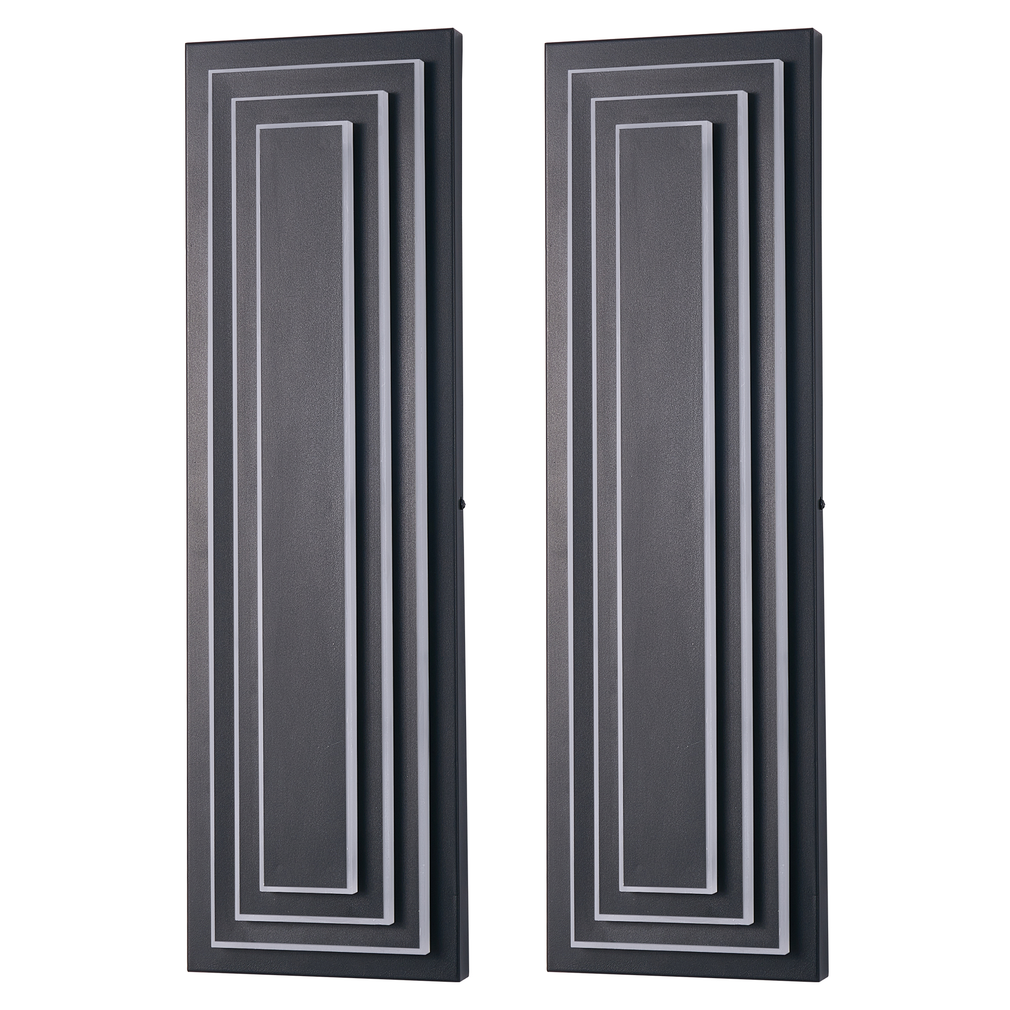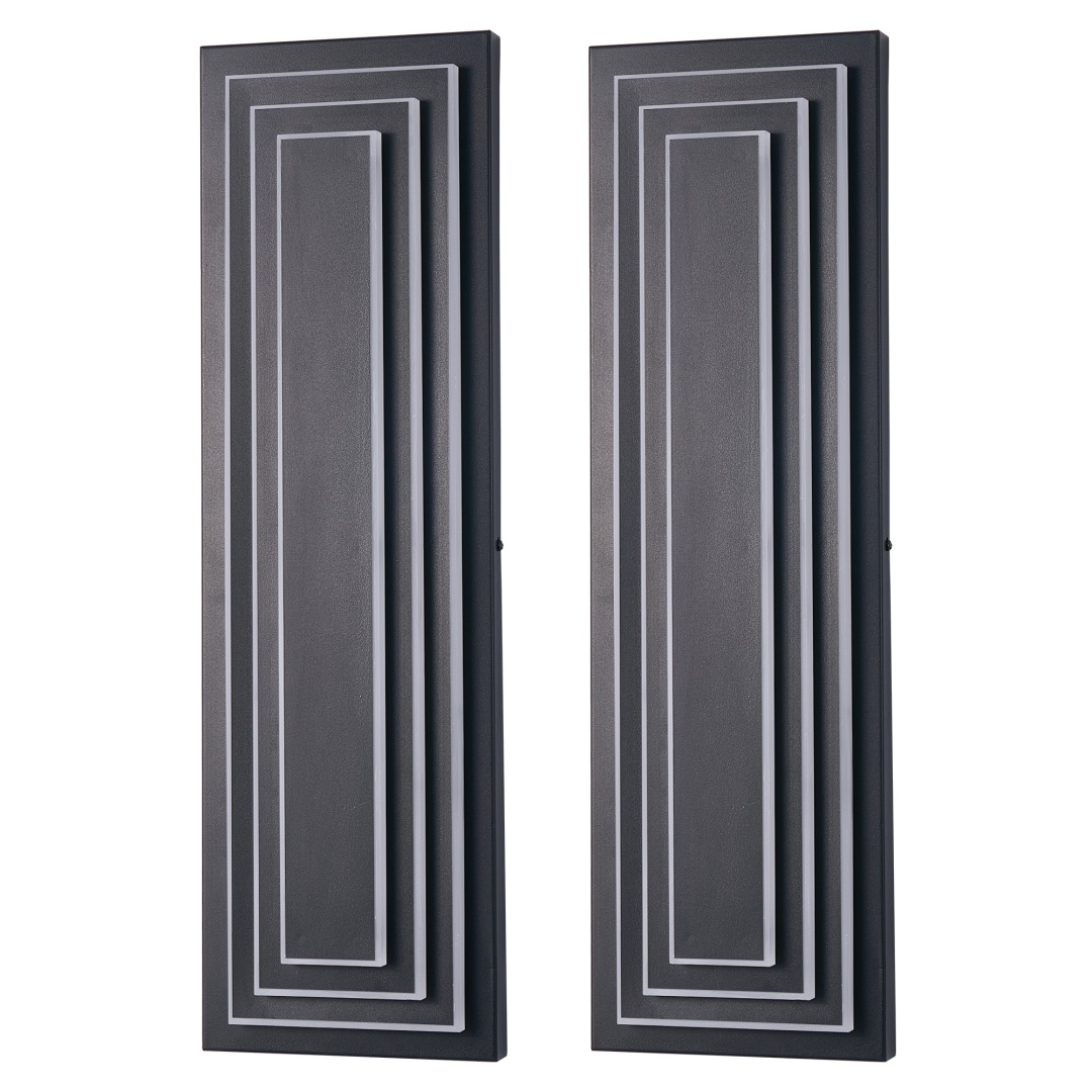 Elegant Modern Sconces Wall Lighting Design:Our outdoor long wall light 2 packs have a sleek and minimalism design that adds a touch of style to any exterior entryway.Excellent 3-tier Outdoor Light Sconce Decor: The long outdoor lights wall mount serve as excellent decorative additions to outdoor spaces. The stylish design of the three-layer acrylic lampshade reflects a brighter and warmer light.Making a complementary light source and decorative use in the interior and exteriorWaterproof & Rust-proof Up Down Wall Sconce: The black outdoor lights wall mount house meet a high standard of waterproof and performs exceptionally well even in wet conditions.Suitable For Outdoor & Indoor Use: Use large outdoor coach lights to add soft, ambient lighting to the front door,porch,garage,side terrace lighting, back patio wall lights, the foyer, entryway, courtyard,garden,as well as indoor halls, stairwells, corridors, living room,bedroom and other areas where a softer, ambient lighting is desired