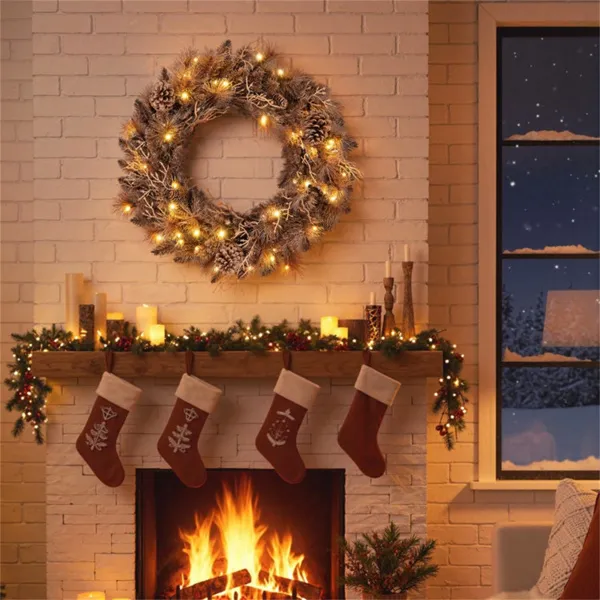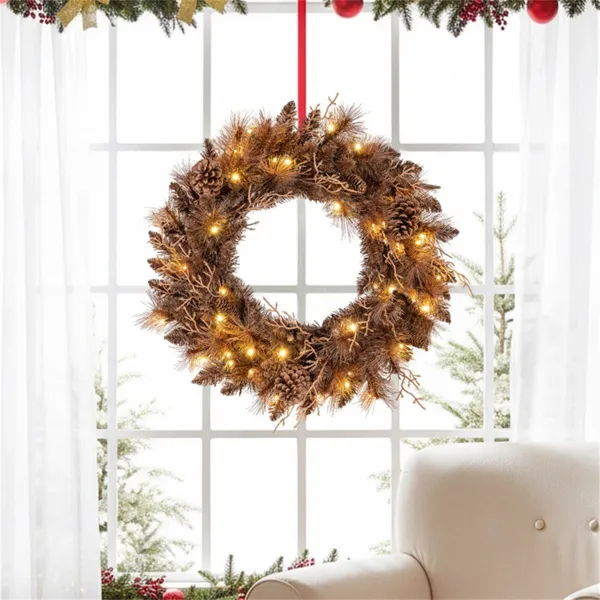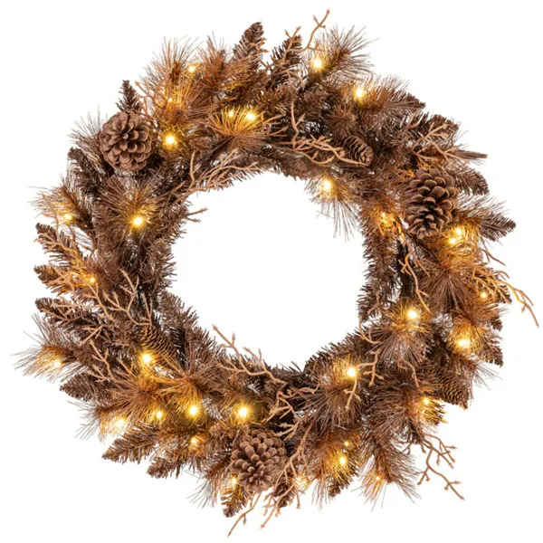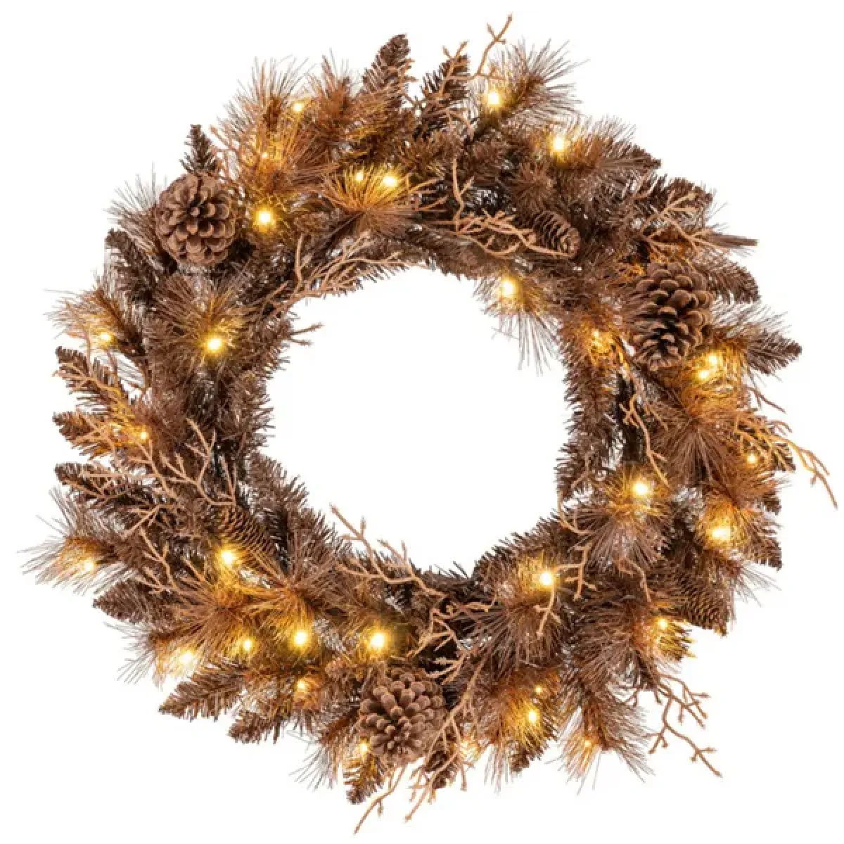 24" Pre-Lit Christmas Wreath - 35 Warm White LEDs+6 Pine Cones, 105 Branch Tips (Brown)