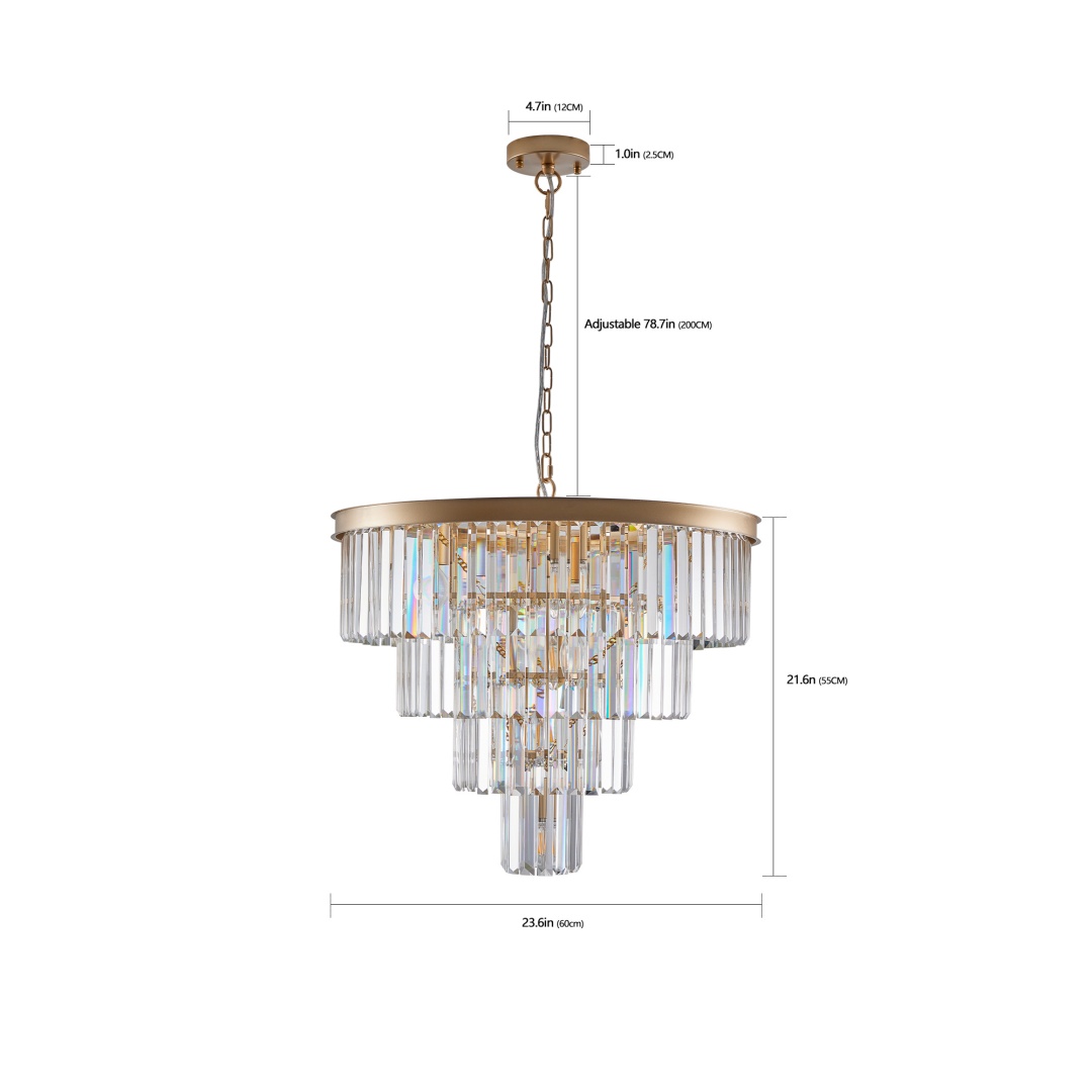Elegant and classic design -The golden crystal chandelier comes with a high-quality metal frame and K9 top-notch crystal.The overall size of modern K9 crystal chandelier is 23.60(W)×21.70(H) inch. Hanging chain is adjustable, you can change chandelier height according to your rooms height.E12 bulb base ×12 (bulb not included), compatible with energy saving, halogen bulbs etc. Maximum 60W Per Bulb.Applicable scenarios -This ceiling light fixture could light up your room extremely and widely to create a superior and classy atmosphere in your living room, dining room and bedroom,etc.