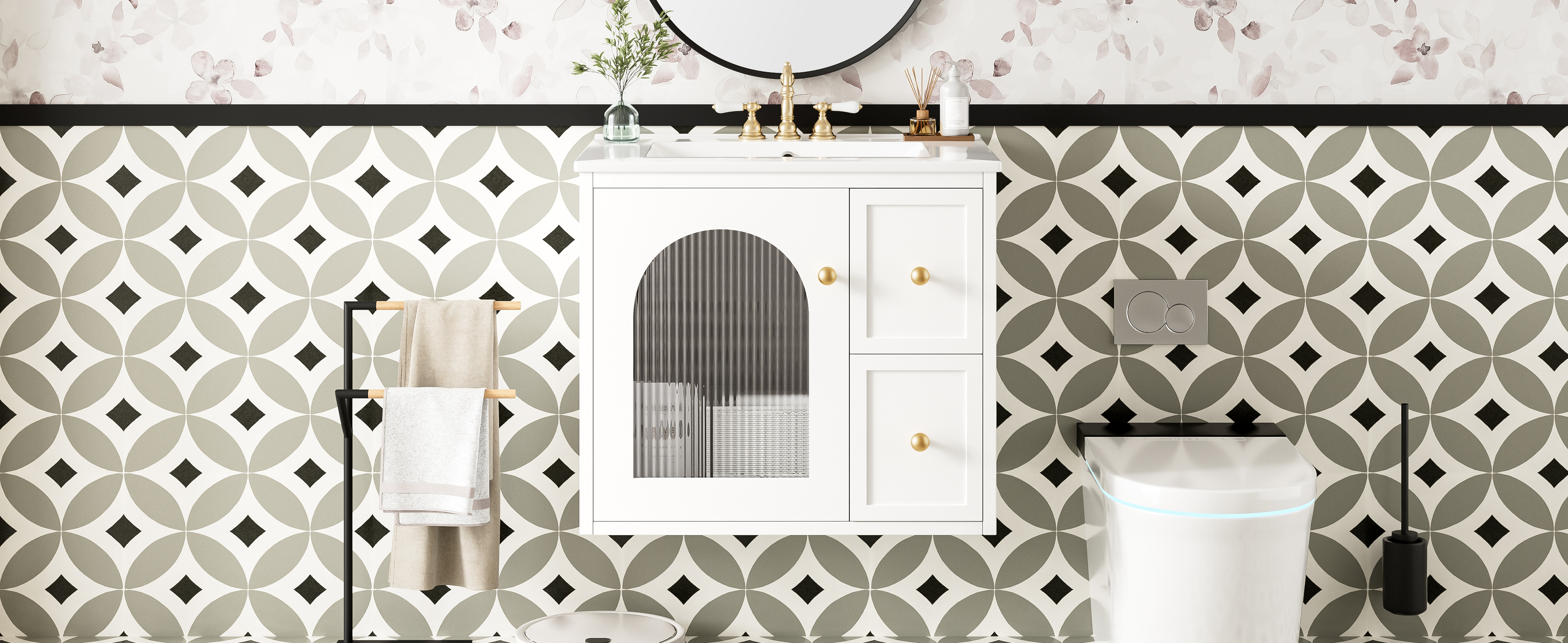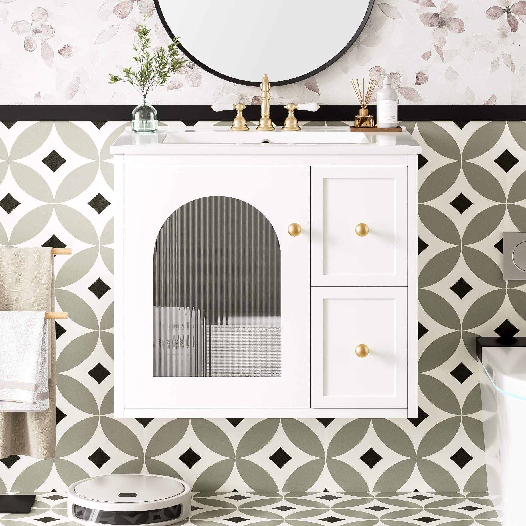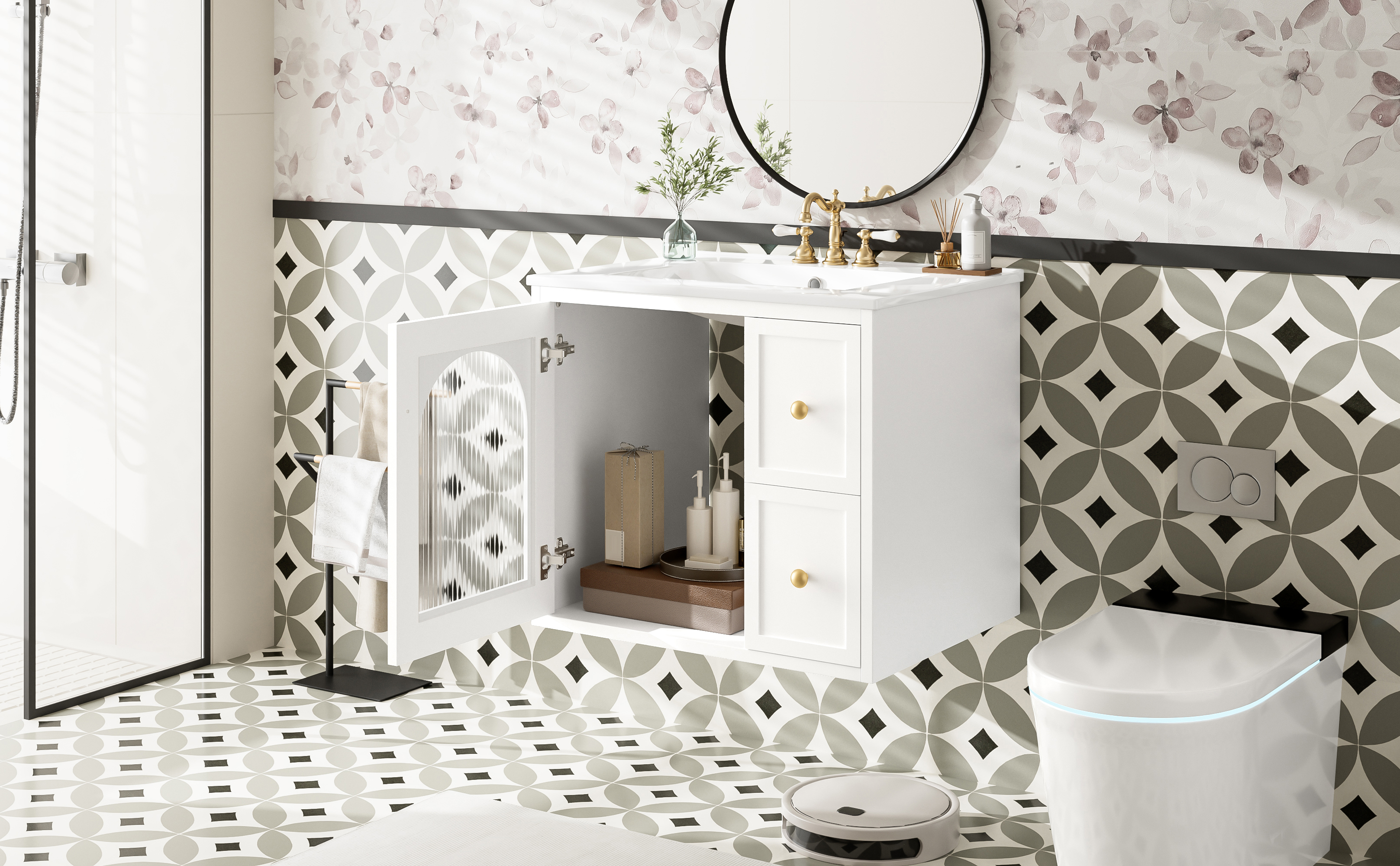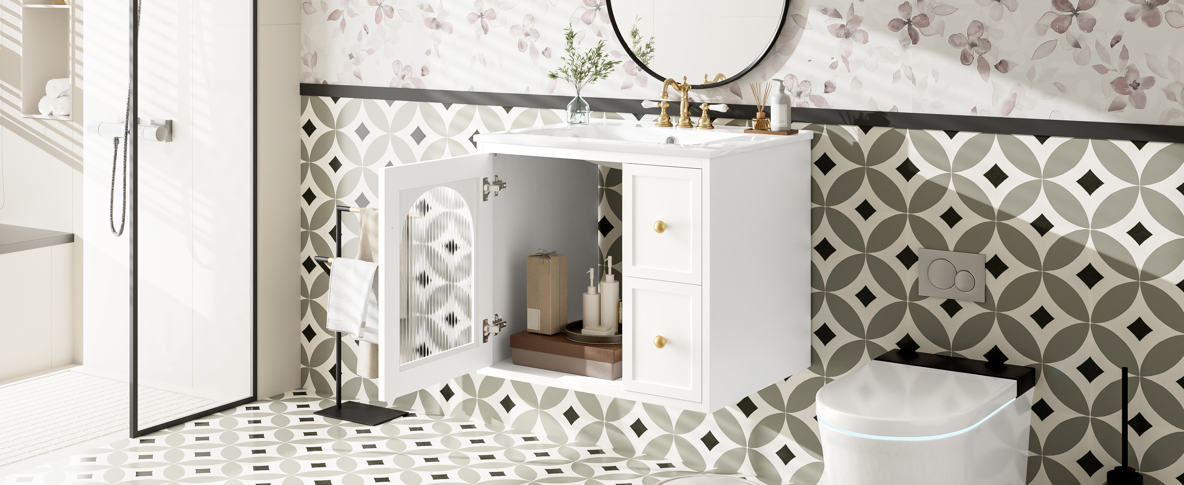 • [Smart & Spacious Storage] Designed for functionality, it includes a glass-door cabinet for elegant display storage and two deep drawers to keep toiletries organized, maximizing your bathroom’s storage potential.