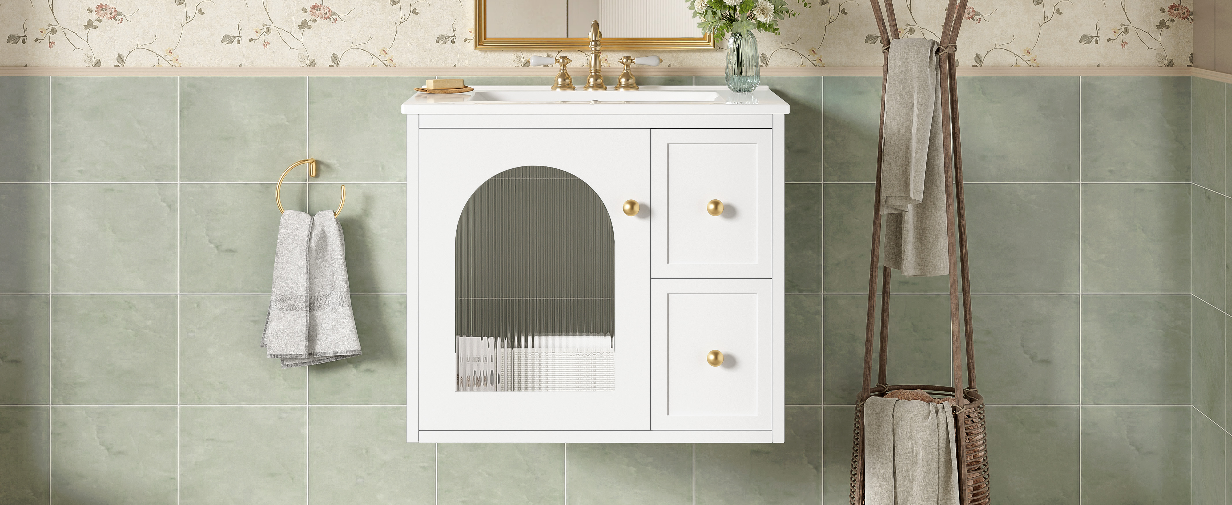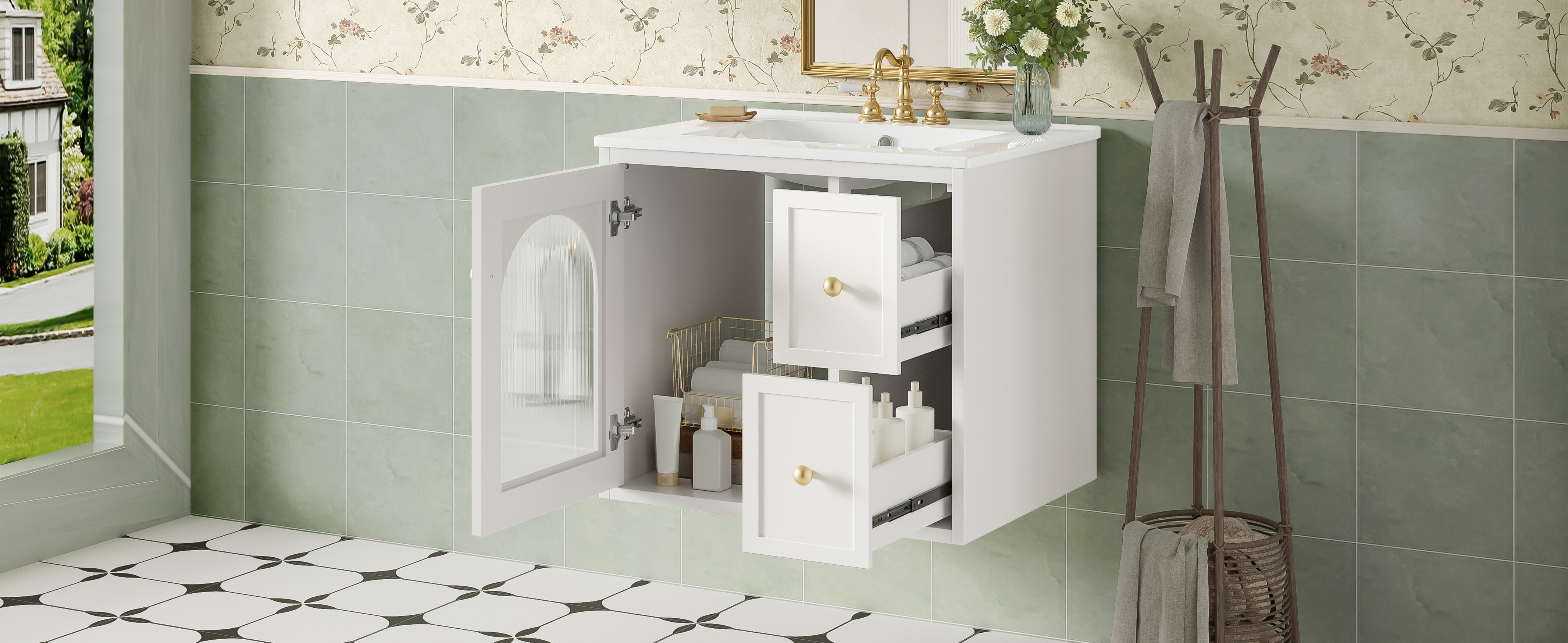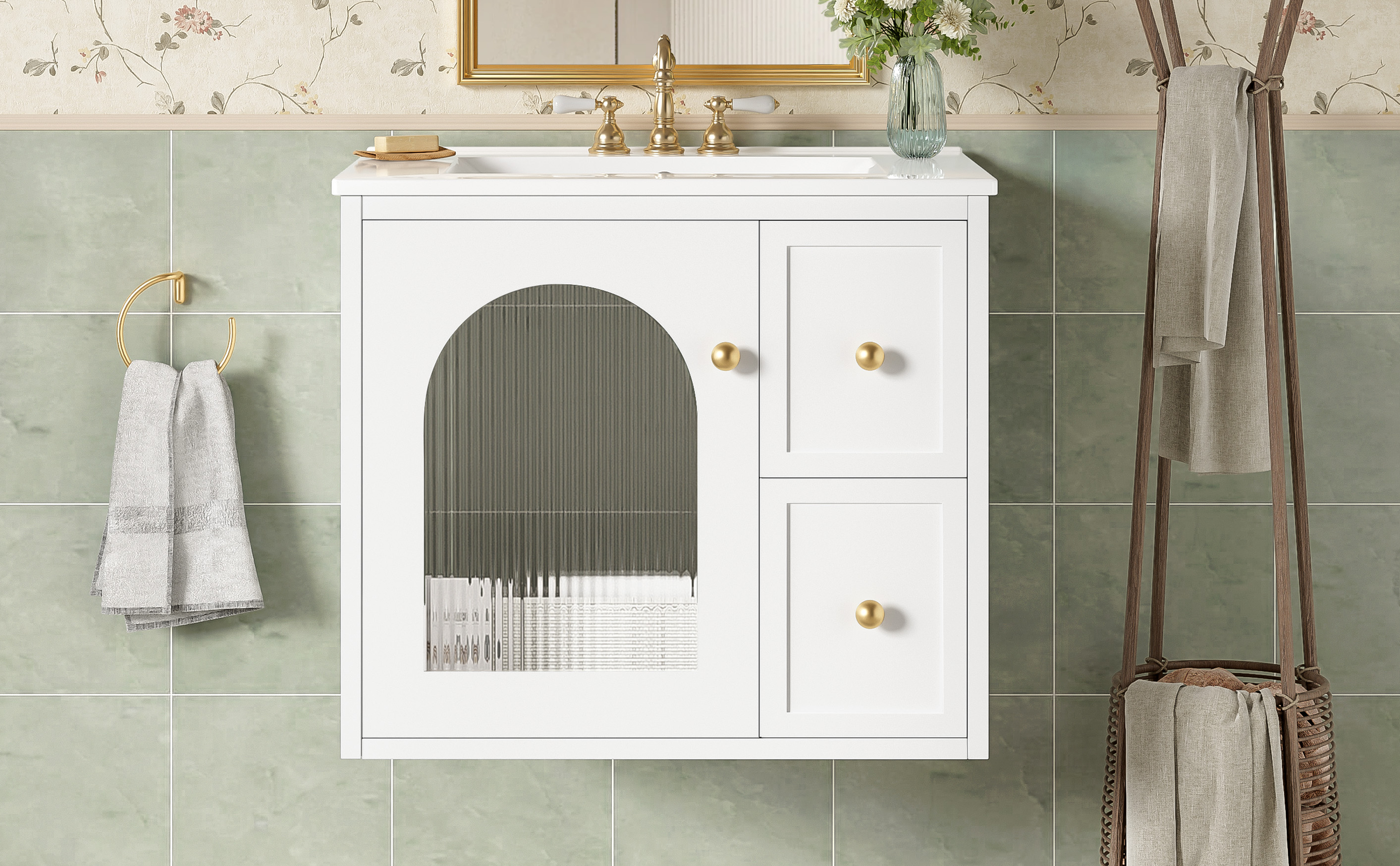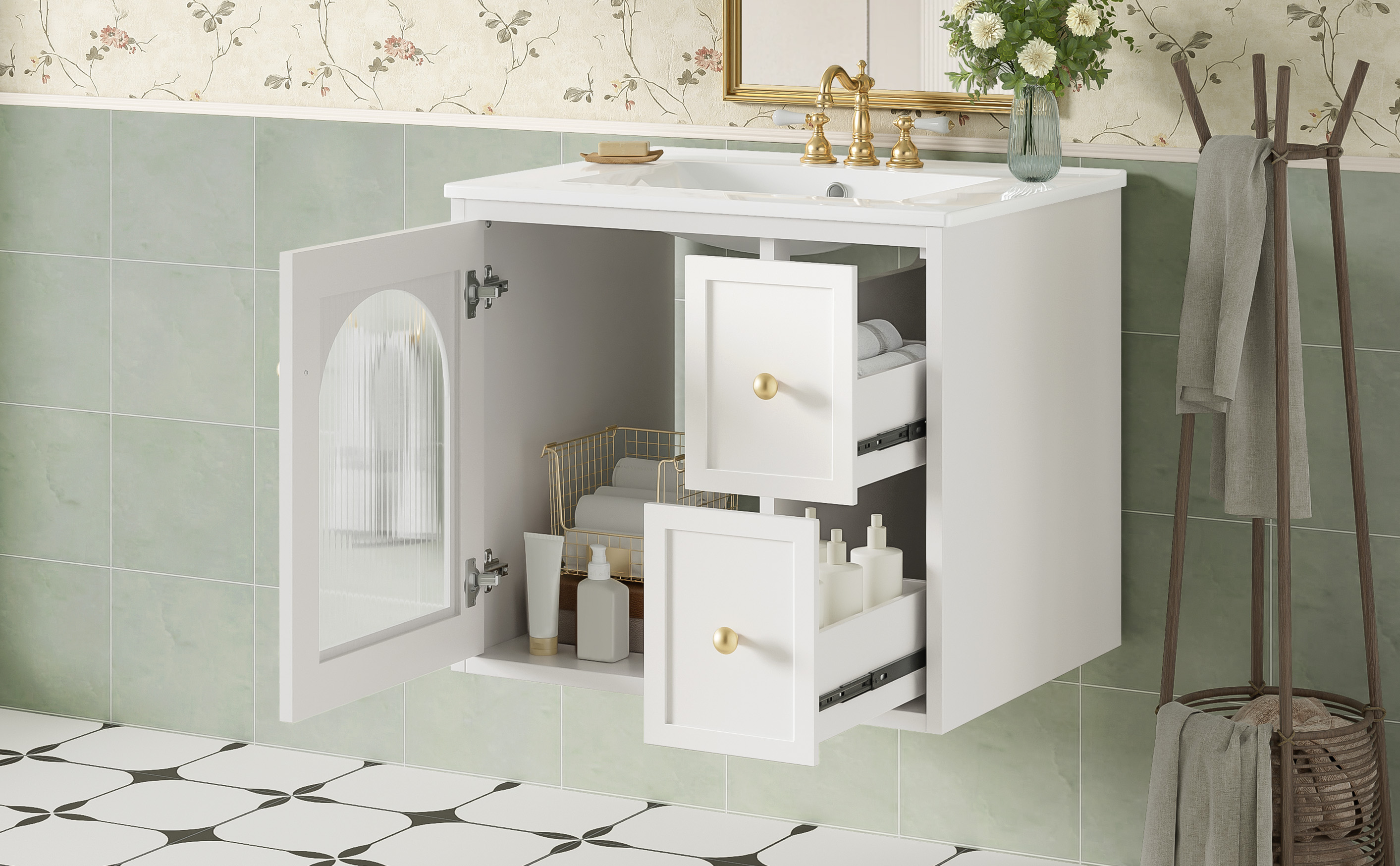 This modern wall-mount vanity combines space-saving design with premium functionality, featuring easy installation and a waterproof painted finish for lasting durability. The elegant glass-door cabinet and two deep drawers offer smart storage solutions, while the smooth ceramic sink with chrome overflow and 4" faucet compatibility (faucet not included) ensures both style and practicality. Enhanced by a delicate metal handle, this vanity delivers a perfect blend of contemporary design and everyday convenience.