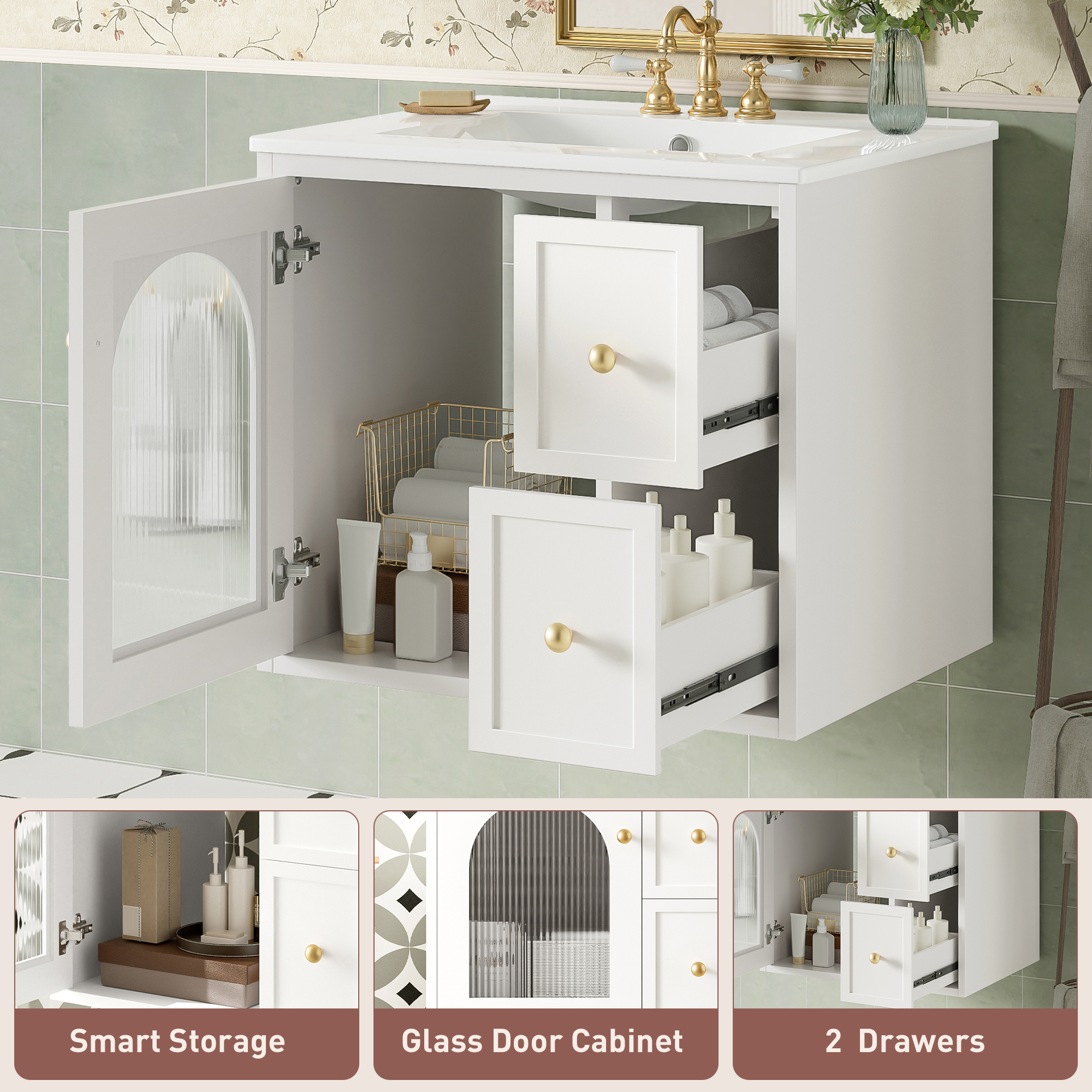 Product Name:24" Bathroom Vanity Set Wall Mounted for Small Space, Bathroom Cabinet with Ceramic Sink, 2 Drawers and 1 Soft-Close Door