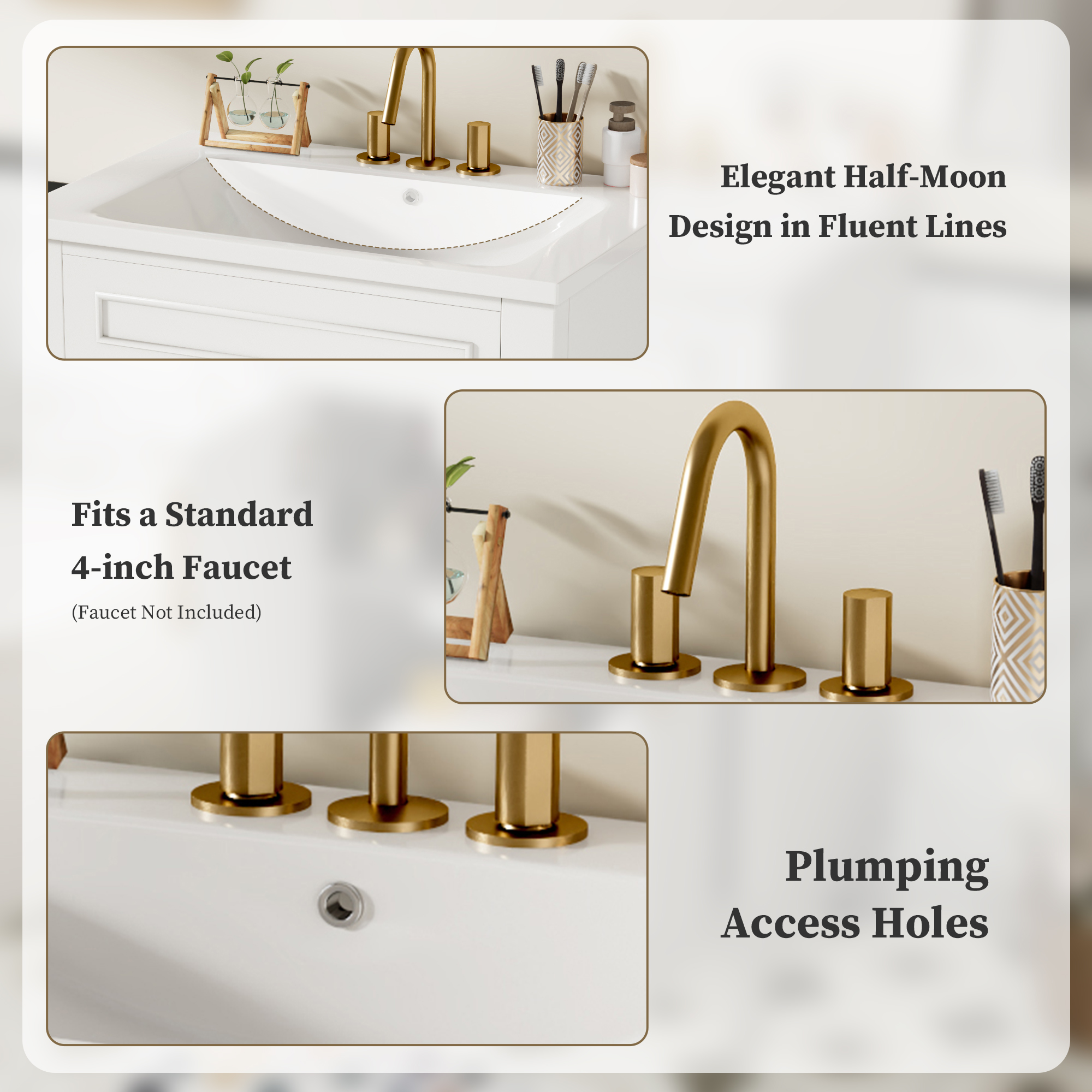 This elegant bathroom vanity combines smart functionality with timeless design. It features a spacious storage cabinet with an adjustable shelf and vintage-style hardware for flexible organization. The graceful half-moon sink basin offers both visual appeal and practicality, designed to fit standard 4-inch faucets (not included) with convenient pre-drilled plumbing access. Easy to assemble with clearly labeled components and included hardware, this compact vanity delivers both style and convenience, making it perfect for small spaces while complementing various bathroom décors.