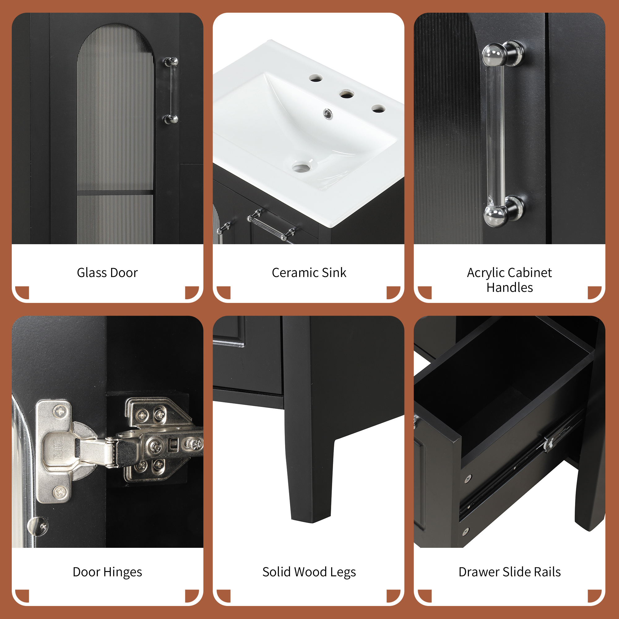 1. 24" Bathroom Vanity with Sink 2. Solid Wood & High-quality MDF Board & Ceramic Sink & Moru Glass & Painted Finish 3. Cabinet with Door & Two Drawers & Adjustable Shelf 4. One Package Details 1. Two Drawers with Sildes 2. Acrylic Bar Handles 3. Stainless Steel Hinges