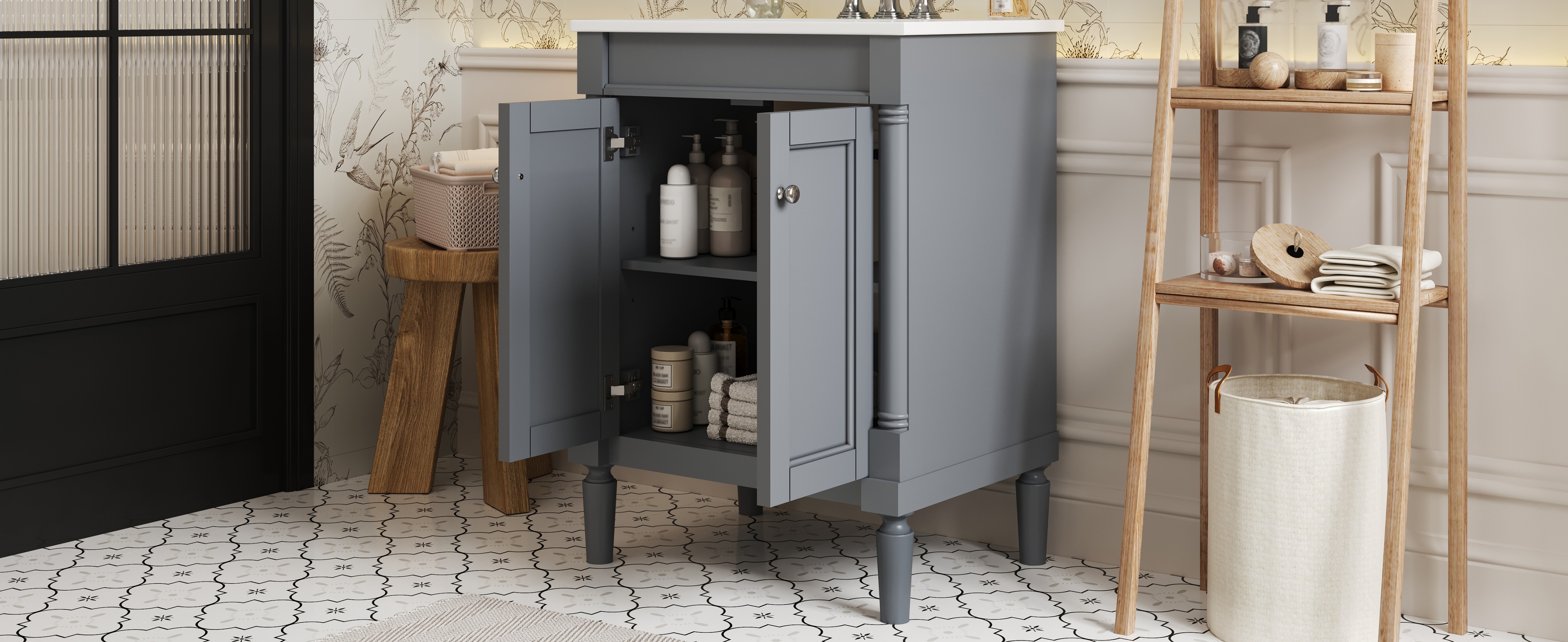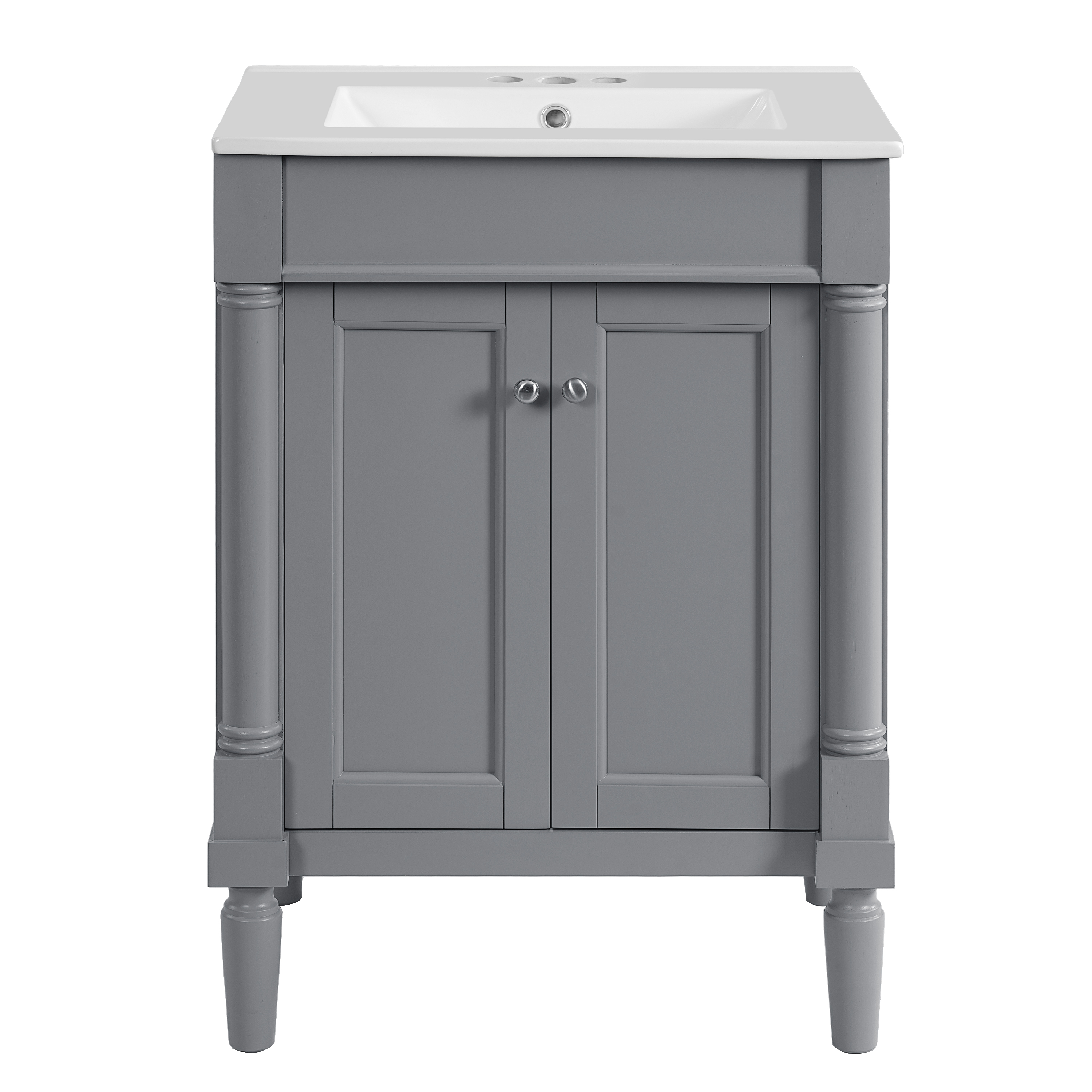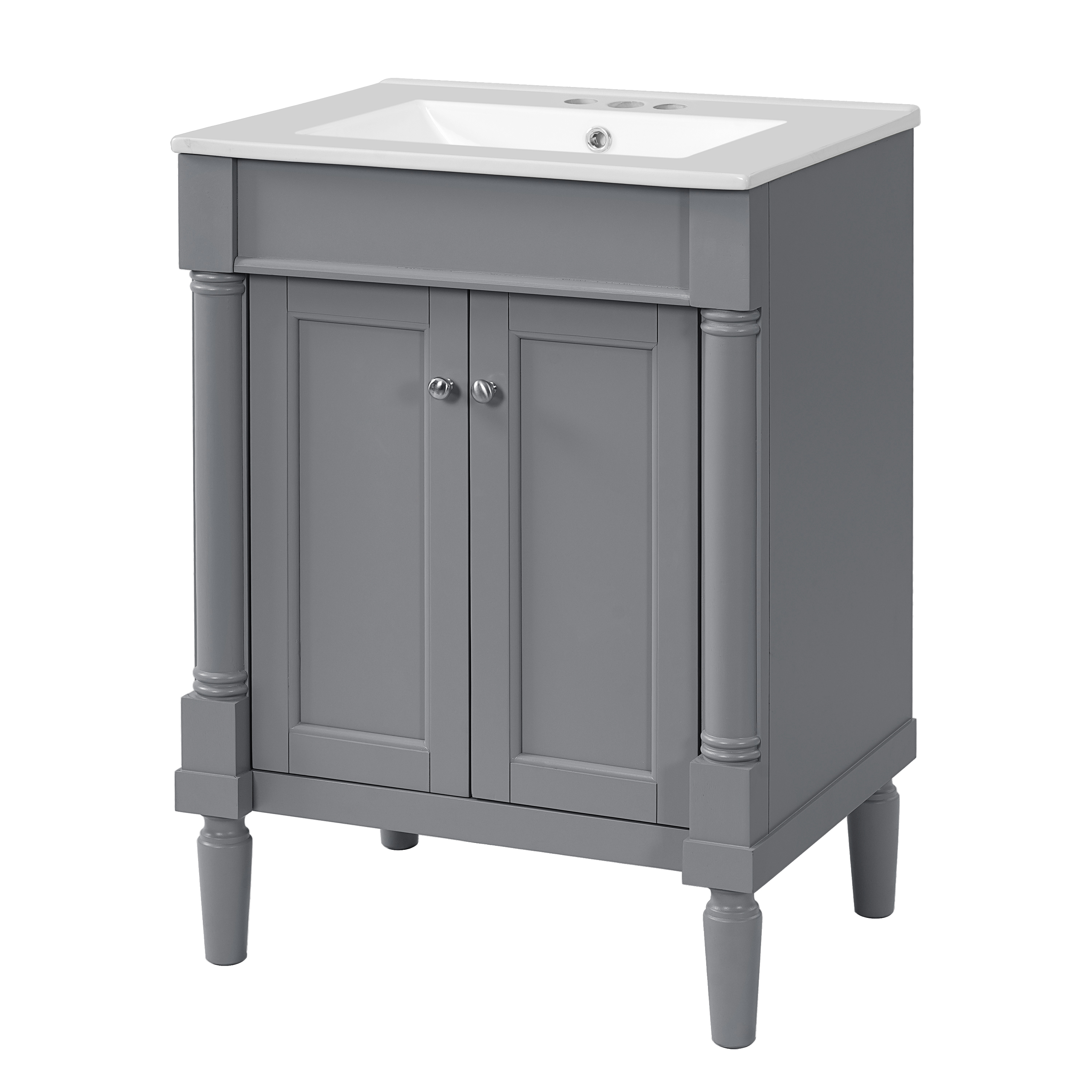 This 24-inch ceramic basin bathroom vanity is a perfect blend of modern simplicity and practicality. Made of high-quality MDF and solid wood frame, it is durable and elegant. The smooth surface of the ceramic basin is not only easy to clean, but also adds a sense of fashion to the bathroom. The cabinet is compact and equipped with two exquisite cabinet doors, providing ample storage space to help you organize bathroom supplies and keep the space neat and tidy. Whether it is a modern or minimalist style bathroom, this bathroom cabinet can become a highlight in your home, enhancing the overall quality and comfort.