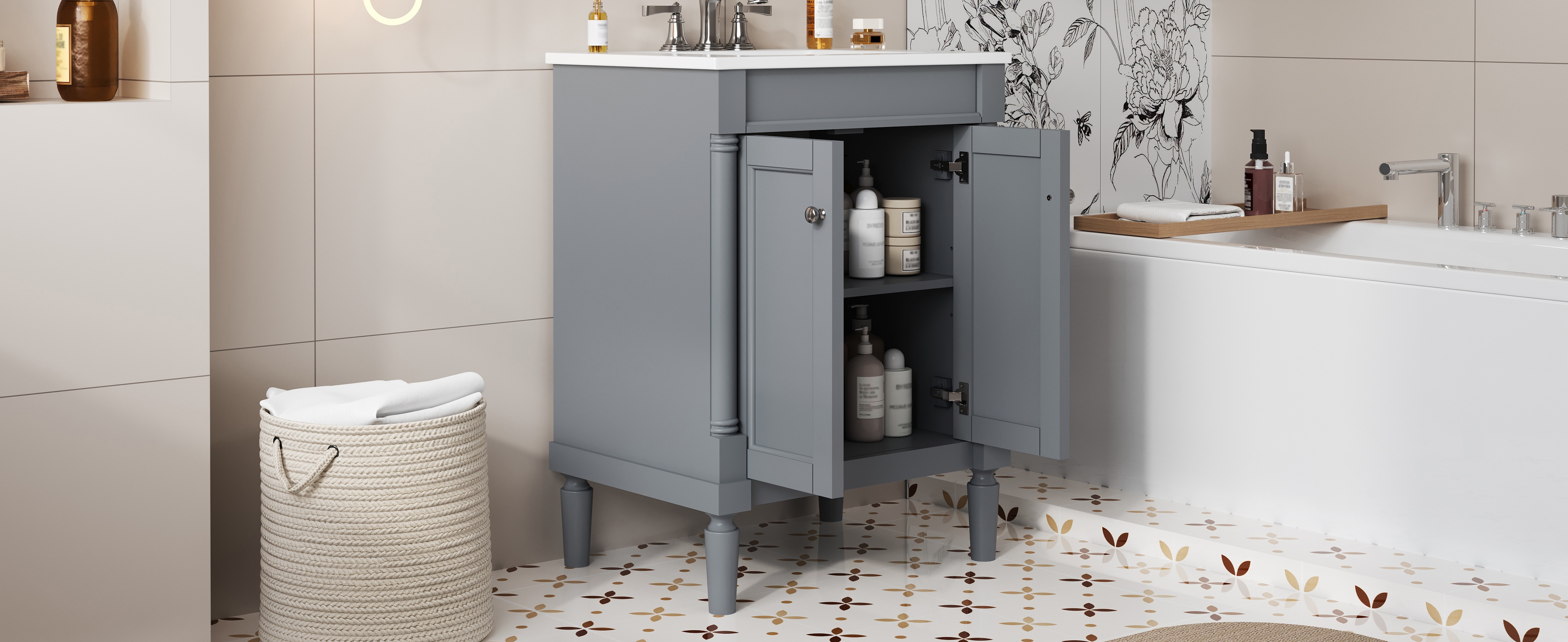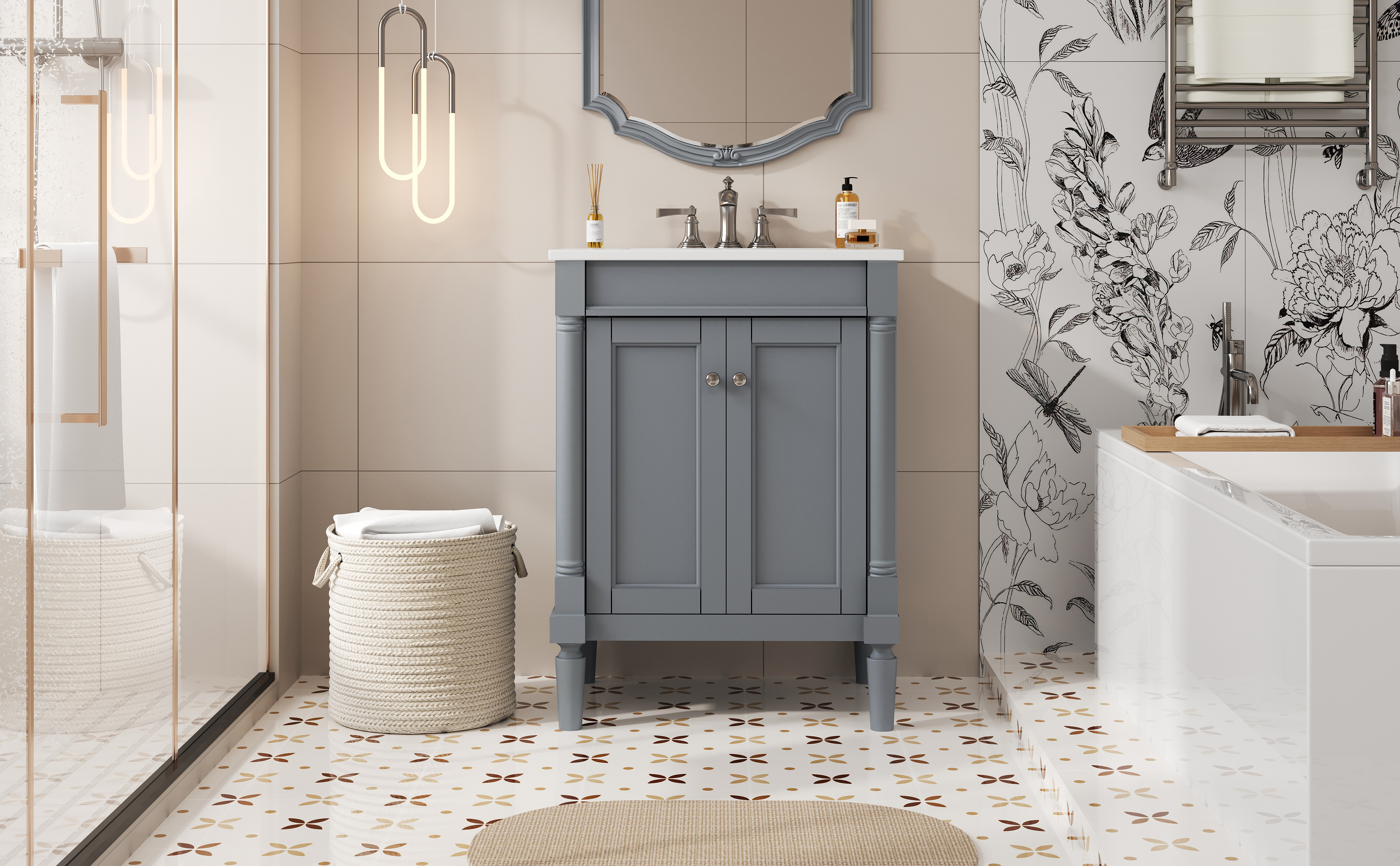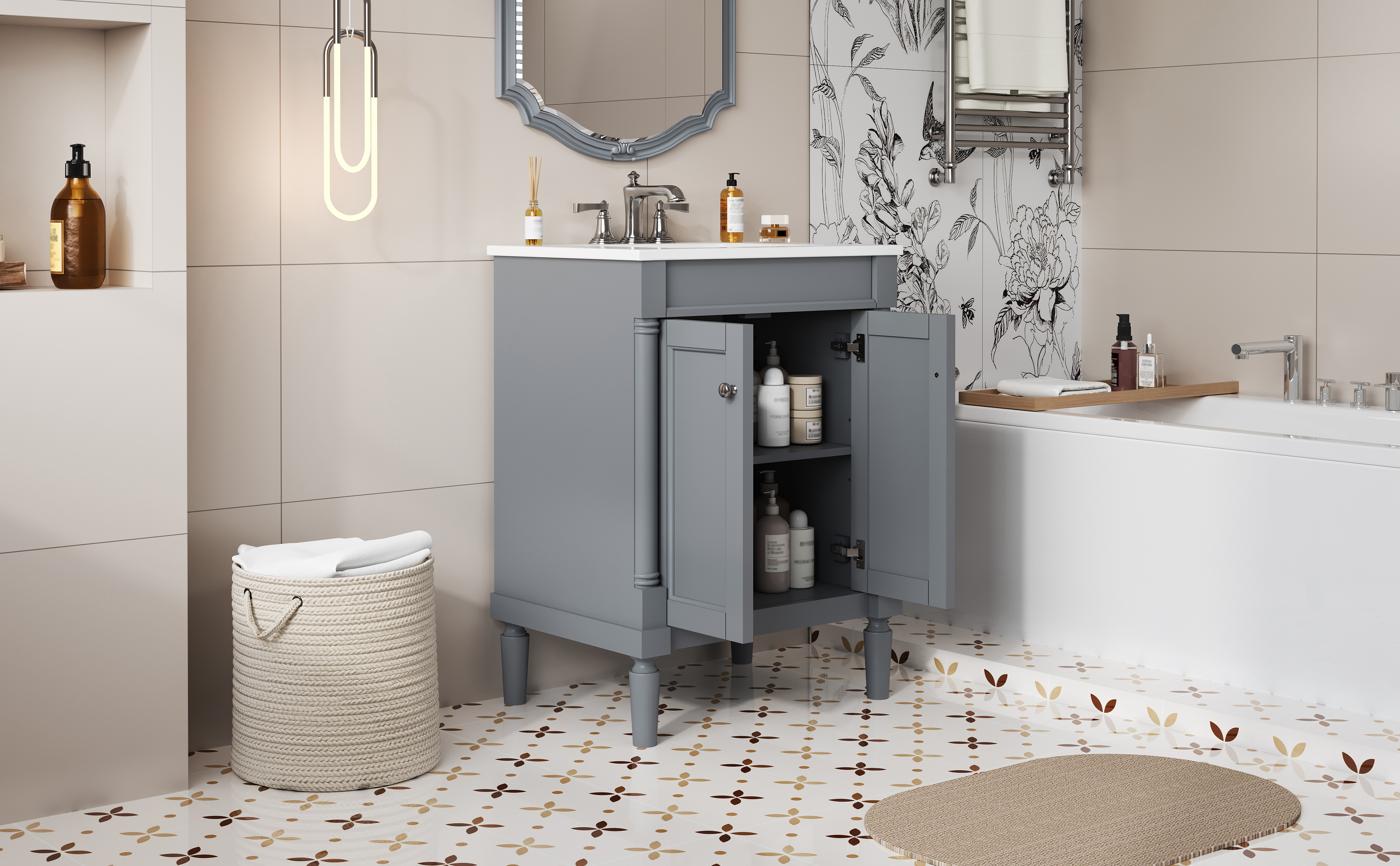 This 24-inch ceramic basin bathroom vanity is a perfect blend of modern simplicity and practicality. Made of high-quality MDF and solid wood frame, it is durable and elegant. The smooth surface of the ceramic basin is not only easy to clean, but also adds a sense of fashion to the bathroom. The cabinet is compact and equipped with two exquisite cabinet doors, providing ample storage space to help you organize bathroom supplies and keep the space neat and tidy. Whether it is a modern or minimalist style bathroom, this bathroom cabinet can become a highlight in your home, enhancing the overall quality and comfort.