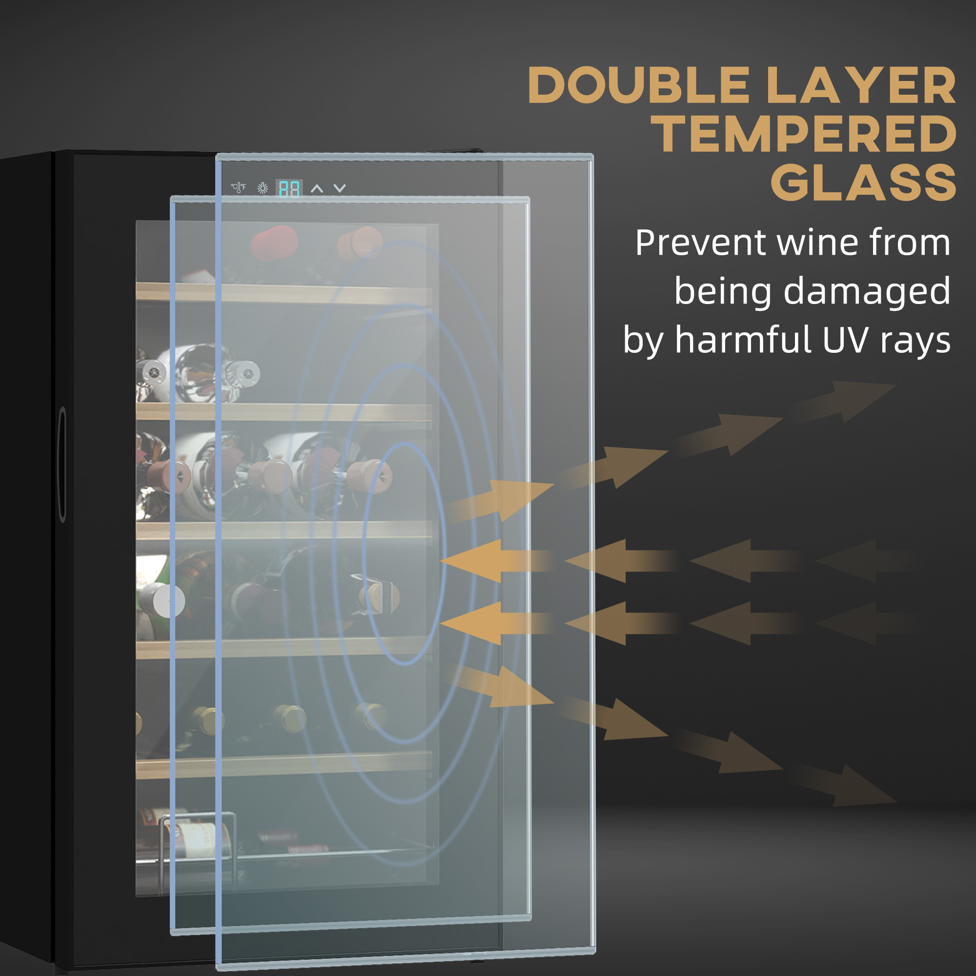 Chill your favourite tipples to perfection with the Wine Fridge with glass door. Precision temperature control from 5-20℃ lets you cater to whites, prosecco. A simple touch control and LED display ensure hassle-free operation, while the large capacity holds up to 24 bottles on stylish wood finish racks. Great for any spot from home bars to kitchens!