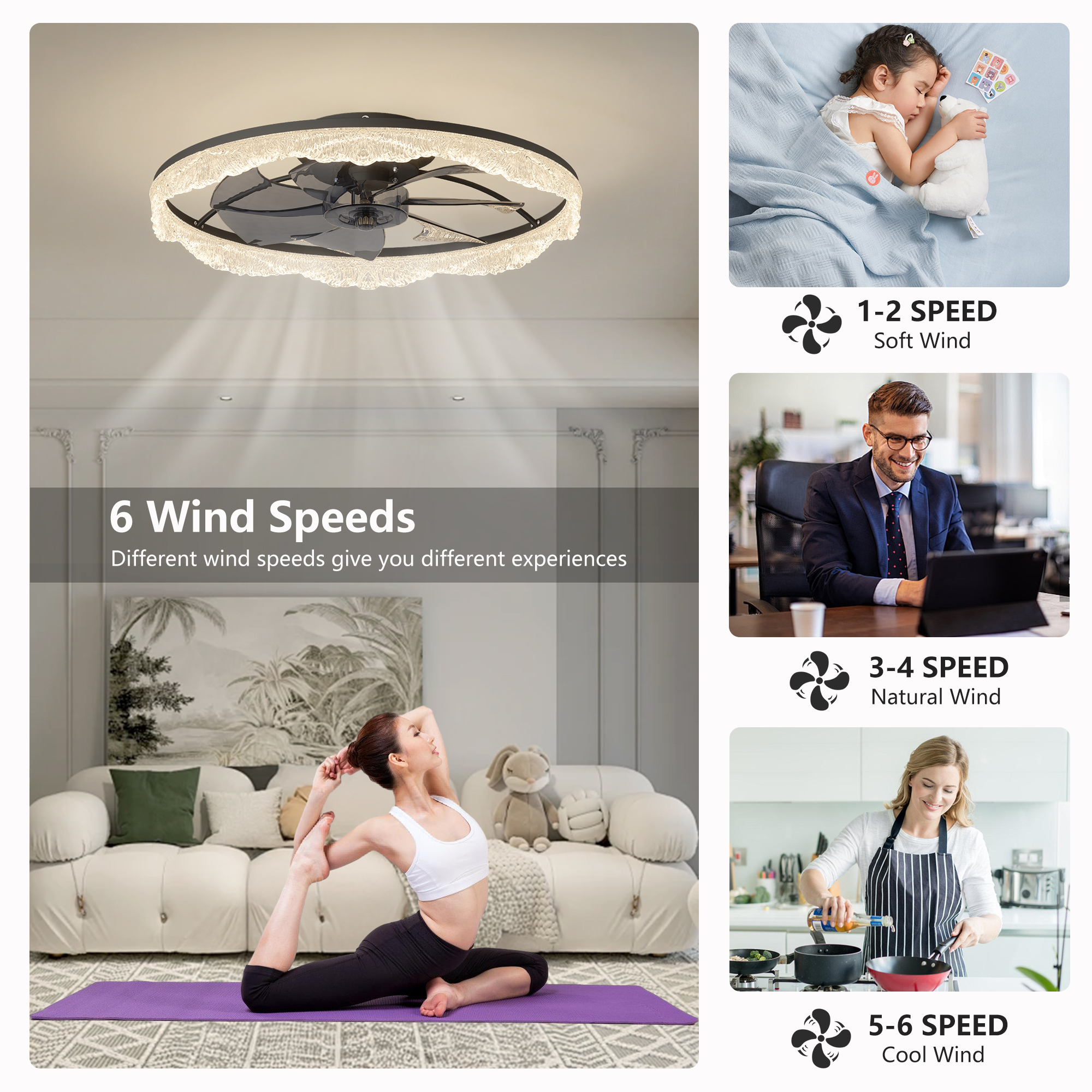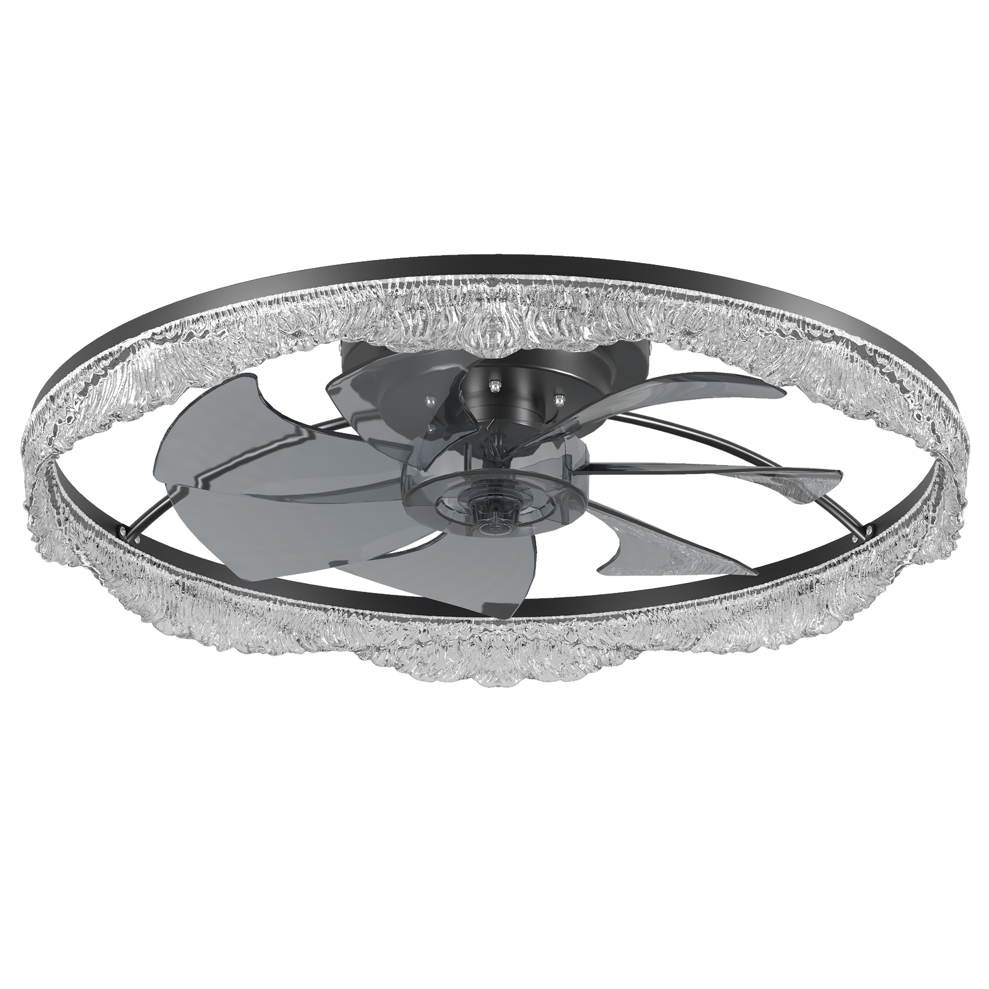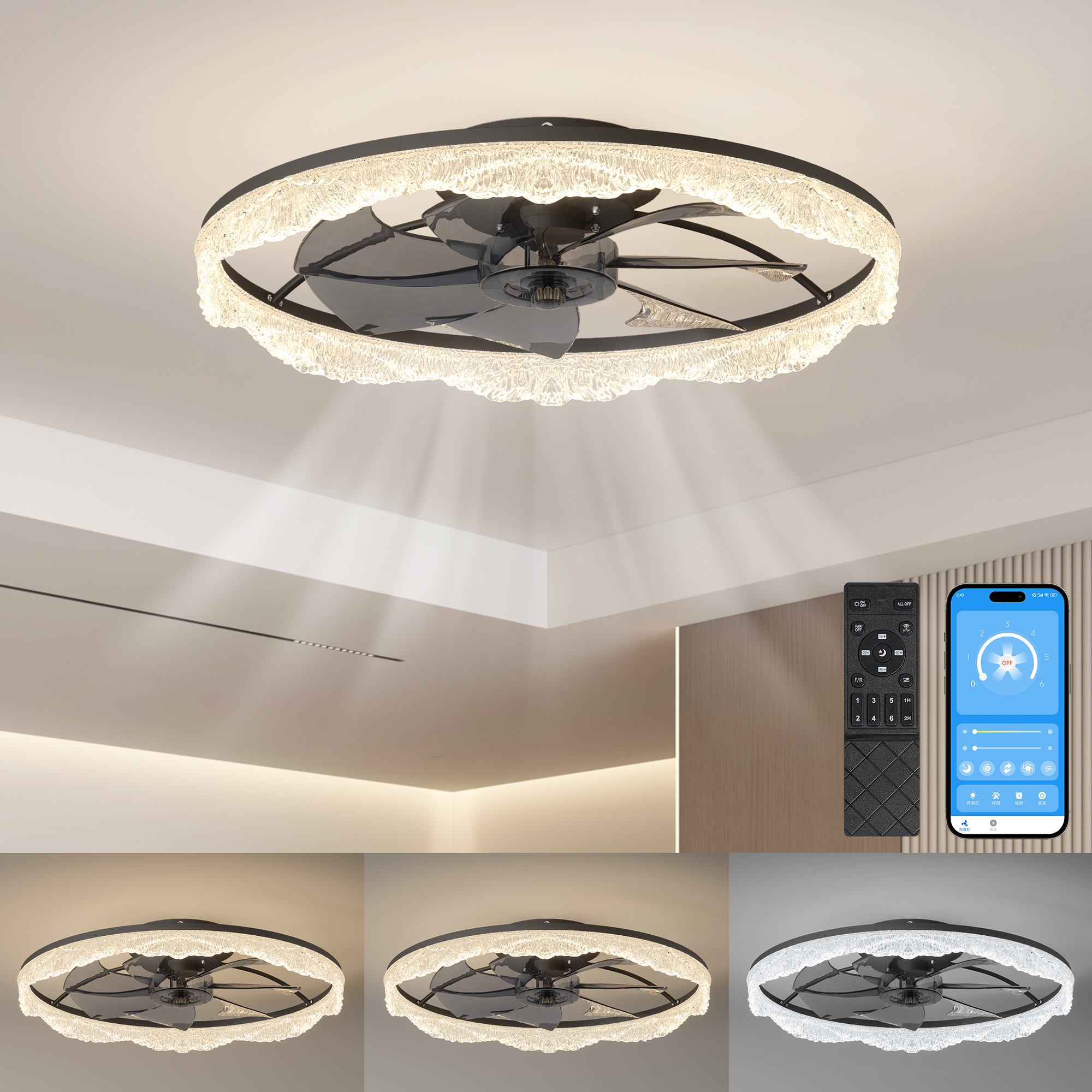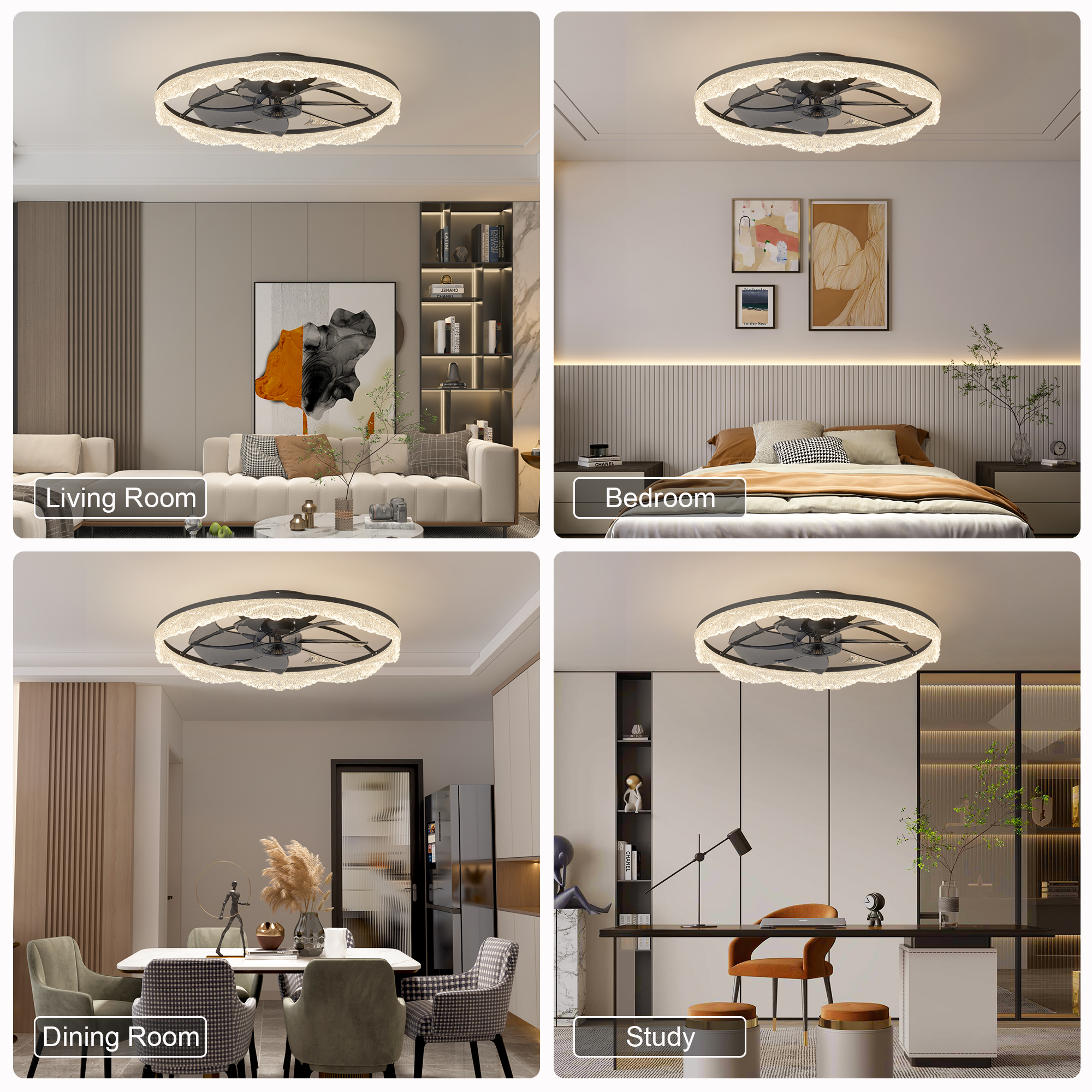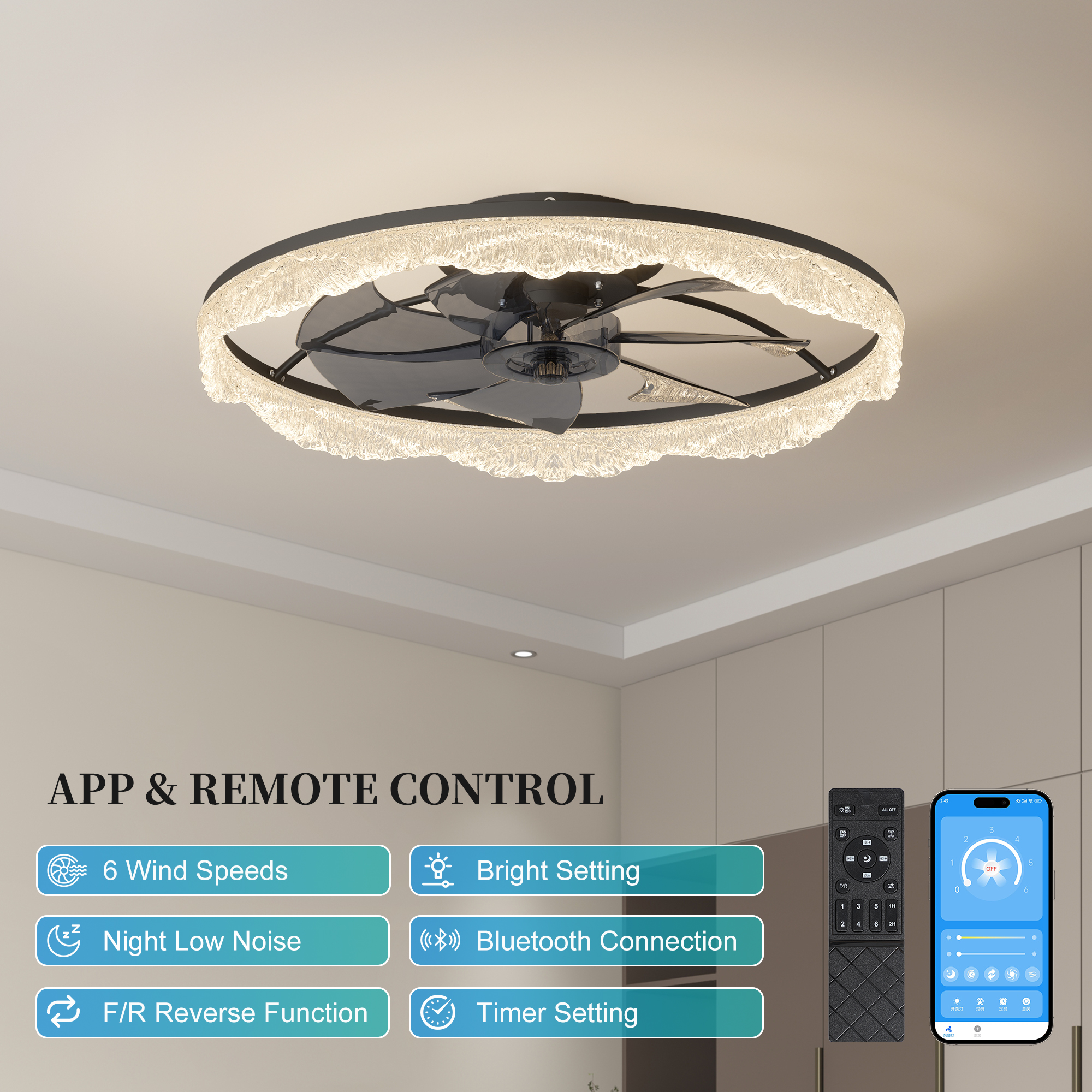 2-in-1 Modern Design – Lighting Meets Airflow: This ceiling fan light combines a powerful fan and elegant LED lighting in one sleek design. Perfect for modern homes looking to save space without sacrificing style or function.Decorative Acrylic Light Ring: The unique frosted acrylic ring mimics the appearance of glistening crystal, adding a touch of luxury and sophistication. When lit, it produces a soft, ambient glow that's both eye-catching and cozy.Hidden Blades for a Sleek, Minimalist Look: Equipped with invisible fan blades made from high-quality ABS, the fan blends seamlessly into the ceiling fixture. Enjoy a clutter-free look while still benefiting from strong airflow.Whisper-Quiet Operation with Remote Control: Enjoy silent comfort with a quiet motor and easy-to-use remote control. Adjust fan speed, light brightness, and power with the touch of a button-no noise, no hassle.Ideal for Low Ceilings & Stylish Interiors: With its flush mount, low-profile design, this fan light is perfect for rooms with lower ceilings. Whether it's a bedroom, living room, dining area, or office, it enhances the space with both function and flair.