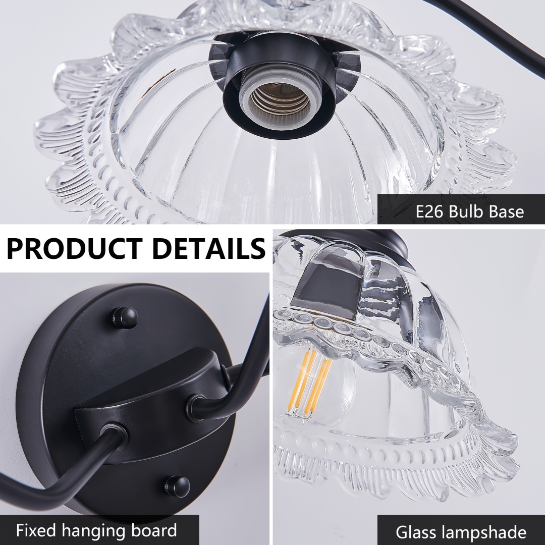 Elegant Vintage Design: The combination of clear glass shades with a black finish provides a timeless, vintage aesthetic that suits both traditional and modern home décor styles.Clear Glass Shades: The beautifully designed glass shades not only enhance the look of the fixture but also provide clear, bright lighting that adds warmth and character to any room.3-Light Fixture: Equipped with three lights (bulbs not included), this sconce offers ample lighting, ideal for brightening up your bathroom, hallway, or bedroom with elegant illumination.Versatile Use: Perfect for a variety of spaces including bathrooms, bedrooms, hallways, or as accent lighting in living rooms or entryways, adding both style and function to your home.Easy to Install: The sconce comes with all the necessary hardware and instructions for a quick and hassle-free installation, making it easy to update your space with minimal effort.