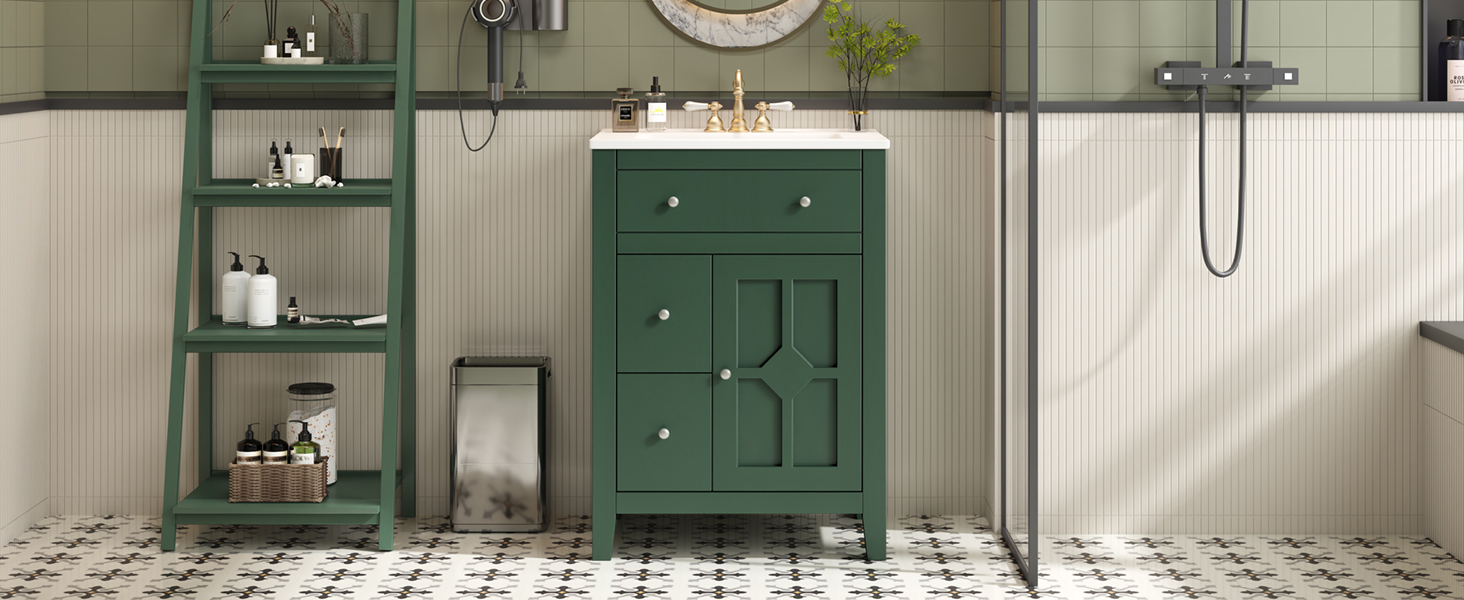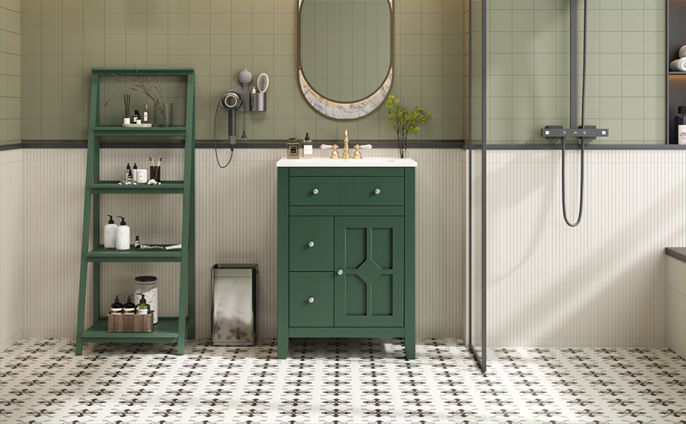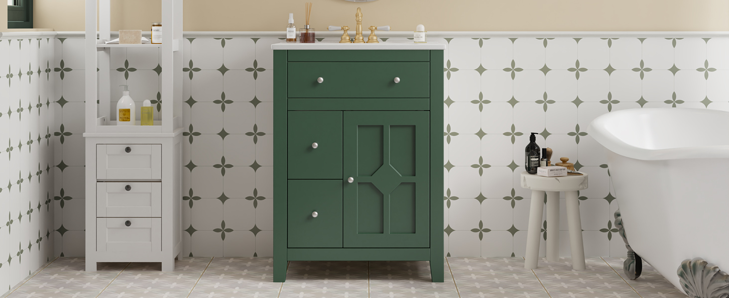 This elegant bathroom vanity combines French country charm with practical functionality, featuring a delicate cross-grid pattern and premium metal knobs for rustic sophistication. Its compact design is perfect for smaller spaces, offering versatile storage including a one-door cabinet with adjustable shelf and two deep drawers to organize all your essentials. The high-quality ceramic basin provides durable elegance while being compatible with standard 4-inch faucets (not included), and thoughtful details like soft-closing hinges and smooth-gliding drawers ensure quiet, effortless operation. With its perfect balance of timeless style and smart storage solutions, this vanity brings both beauty and convenience to your bathroom space.