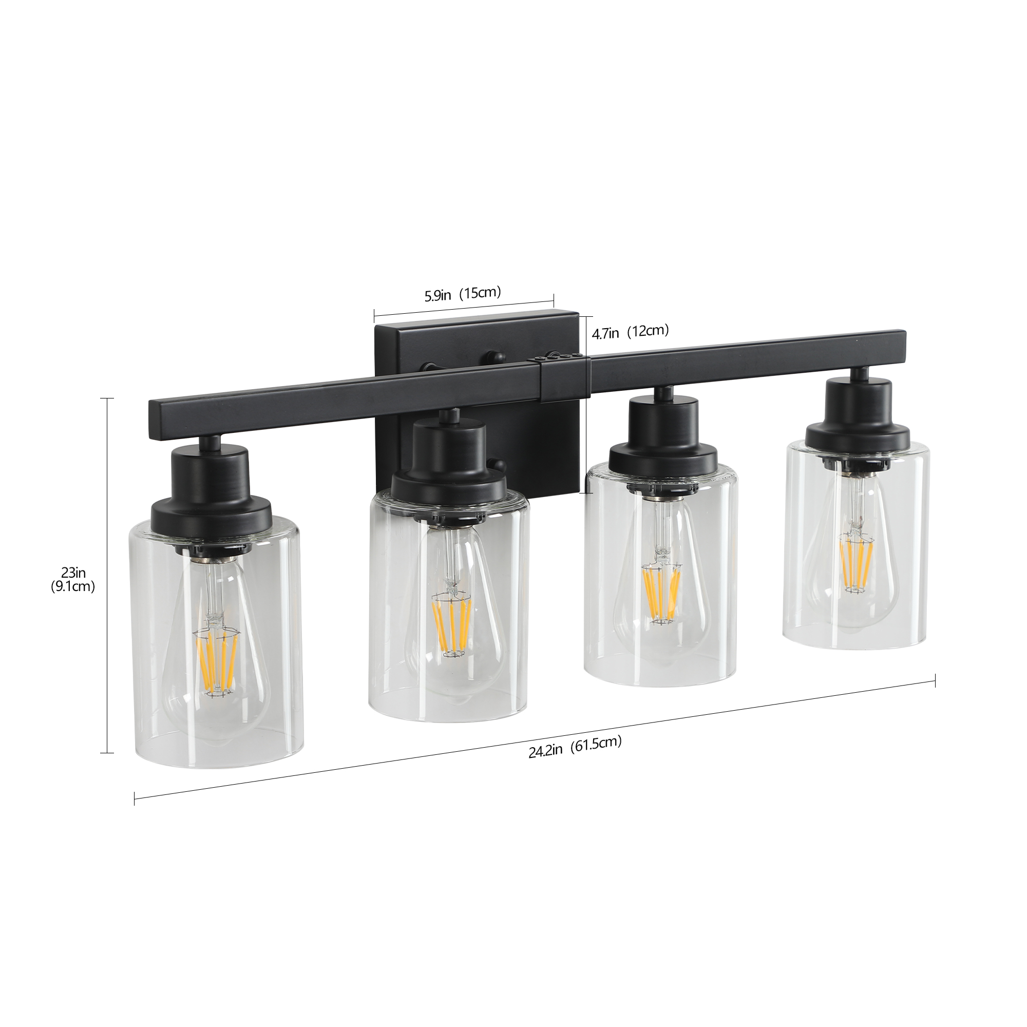Rustic & Farmhouse Design:A combination of black design brings modernity and rustic style, which shows a simple and pure atmosphere and perfectly suits for your home decoration.Premium Material:Our bathroom light fixture is made of high quality metal and glass, compatible with incandescent, LED, CFL and other bulbs of E26 standard medium base .Maximum power 60W, (Bulbs NOT Included).Applicable Scenarios:This 4-light bathroom light fixture perfectly transforms a bathroom into a romantic, rustic relaxing atmosphere for any bathroom and vanity setting in a farmhouse, urban industrial or vintage electric interior.Easy to install:All mounting hardware for quick and easy installation are included in the package.