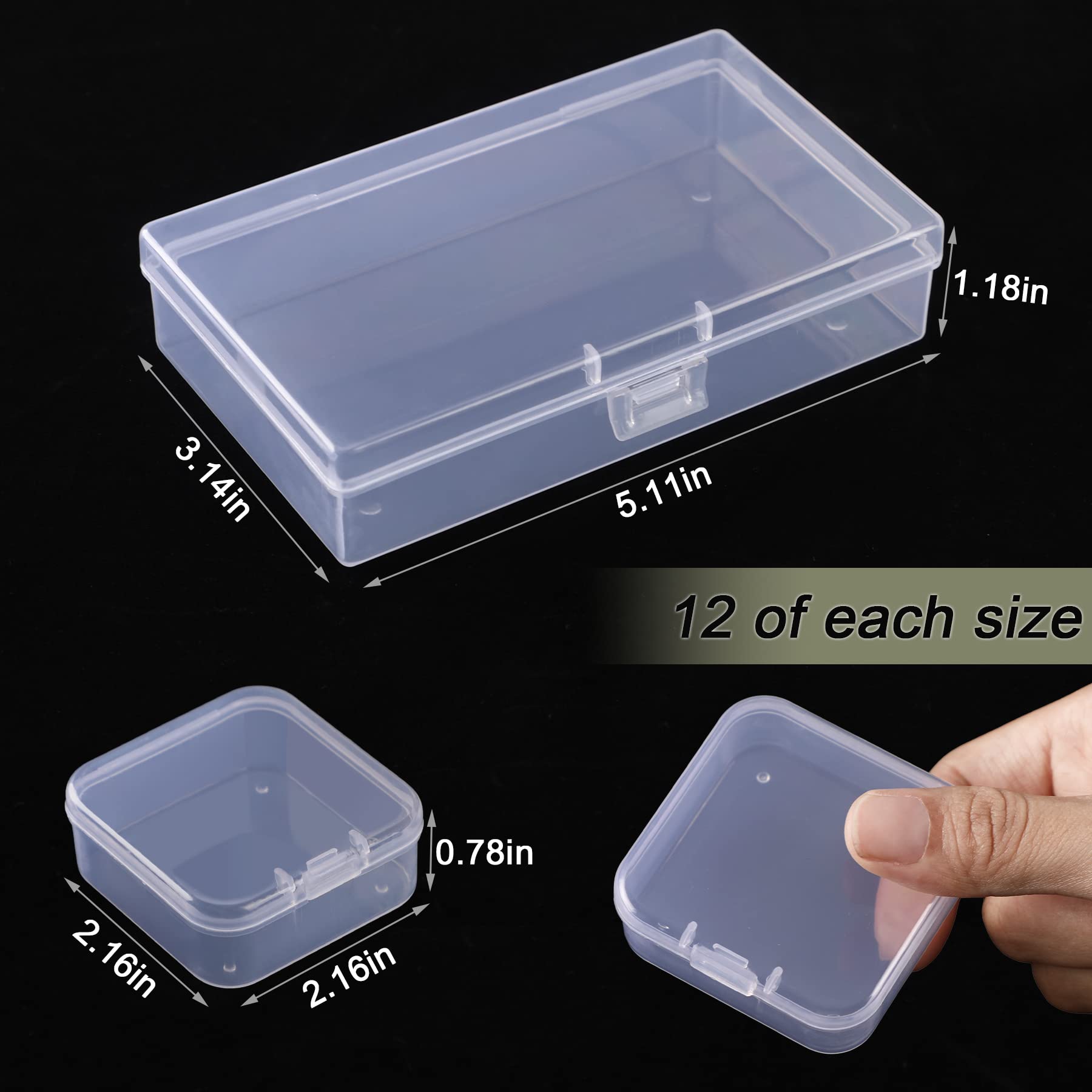 You Will Get: 2 external sizes are 5.11*3.14*1.18 inches (13*8*3CM), 2.16*2.16*0.78 (5.4*5.4*2cm), each size is 12 pieces, a total of 24 pieces of small storage containers to meet your different needs.