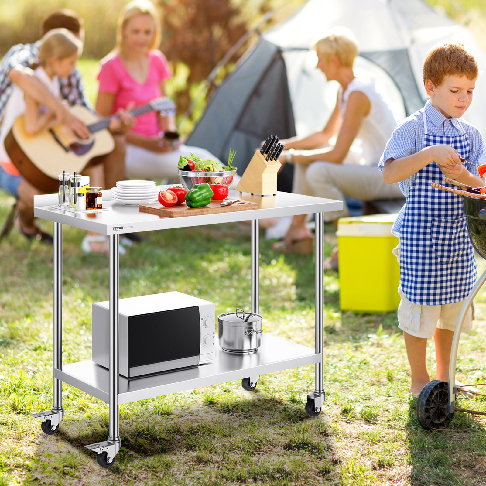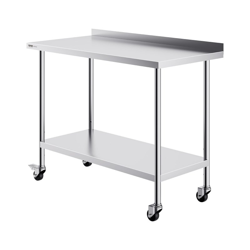 High-Quality Stainless Steel: This work table, measuring 24 x 48 x 40 inch, is made from SUS201 stainless steel for the tabletop, shelves, and legs. It offers superior rust resistance, a sleek appearance, and a smooth surface that is easy to clean with a simple wipe.