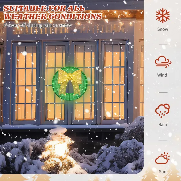 Bring festive cheer to your home this holiday season with our stunning pre-lit outdoor wreath. Designed to add a touch of warmth and elegance to any space, this wreath is the perfect centerpiece for your front door, porch, or gate. Its large size makes it a standout addition to your holiday decor, creating an inviting atmosphere for friends, family, and guests. With weather-resistant materials and sturdy construction, this wreath is built to withstand the elements, ensuring it remains a beautiful part of your celebrations year after year. Easy to set up and store, it's the perfect combination of style and convenience for your seasonal decorating needs.