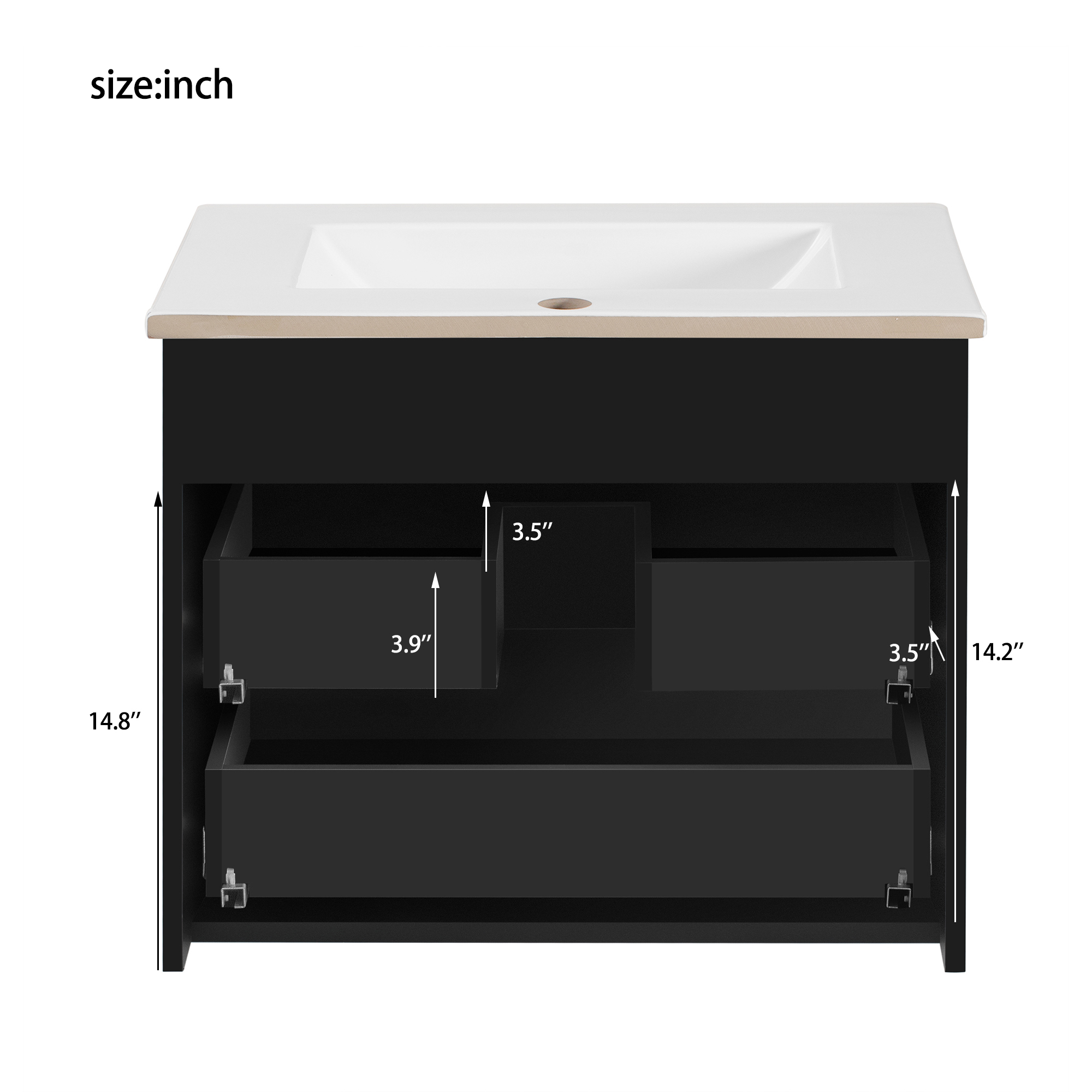 • [A Foundation of Quality and Style] This bathroom cabinet is built upon a foundation of premium materials and thoughtful design. At its heart is a high-quality ceramic basin sink, chosen for its durable, non-porous surface that is exceptionally easy to clean and maintain. The sink is thoughtfully equipped with an anti-spill hole to effectively manage overflow, adding a layer of practical convenience to your daily routine.