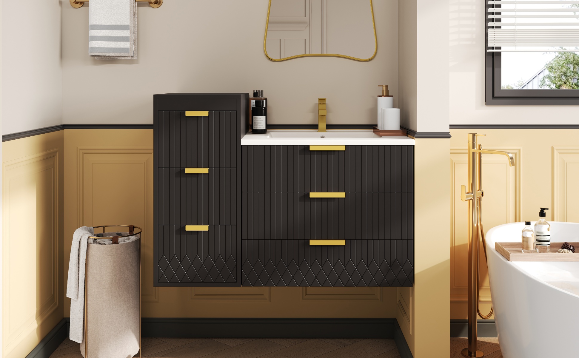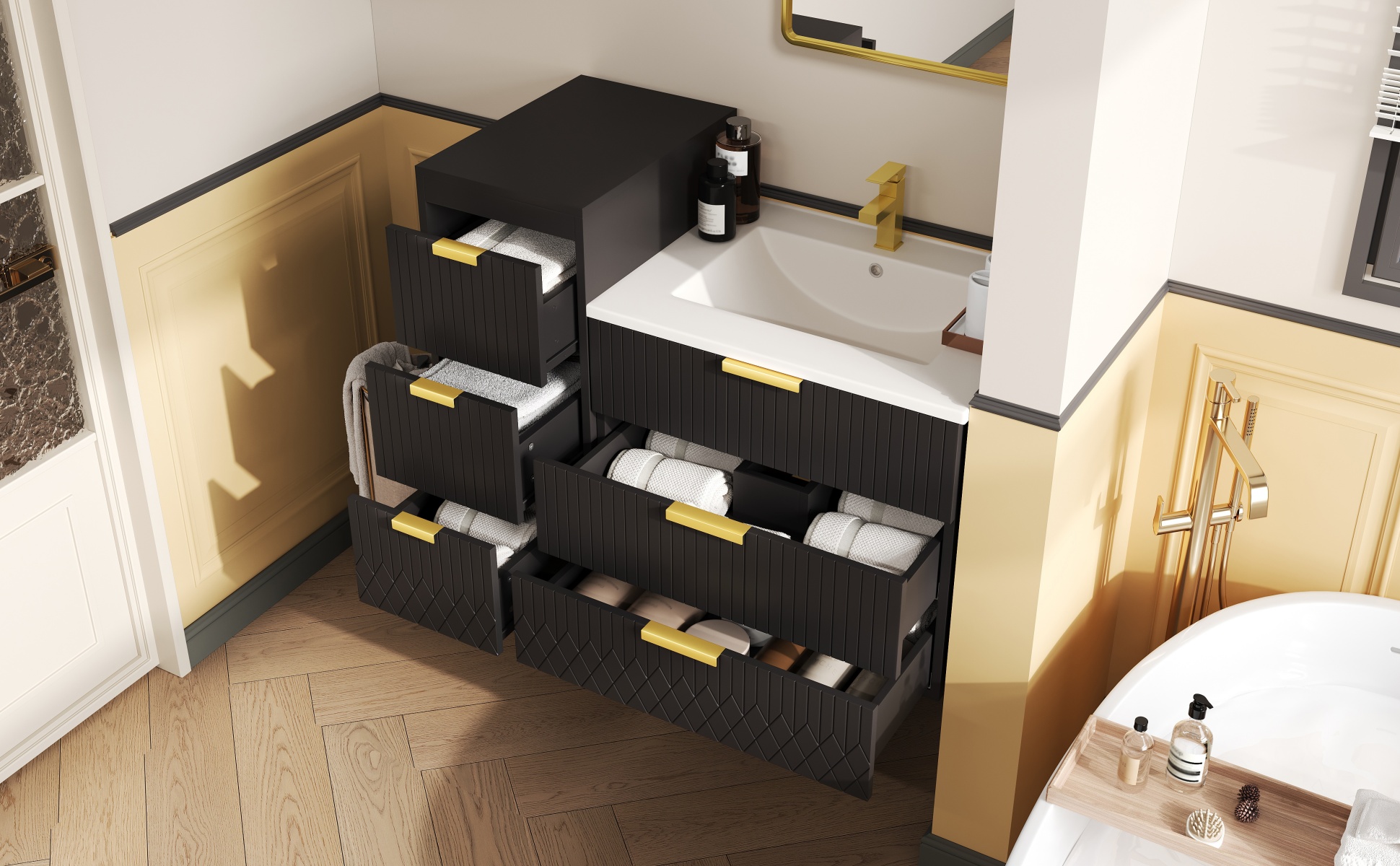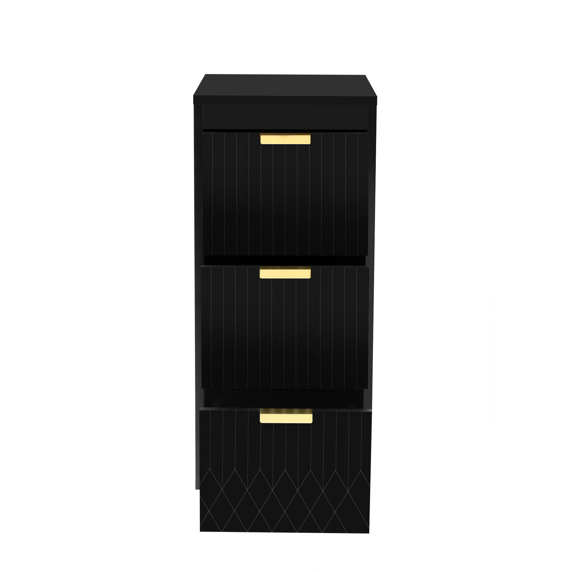 • [Elegance in the Details] Beyond mere functionality, this cabinet showcases a commitment to refined aesthetics. The sleek L-Shape handles are crafted from solid metal, offering a satisfying tactile feel and lasting durability. A subtle stripe carving is elegantly etched across the surfaces, introducing a whisper of texture that catches the light beautifully. This minimalist detail elevates the entire piece, transforming it from a simple storage unit into a deliberate element of your bathroom.