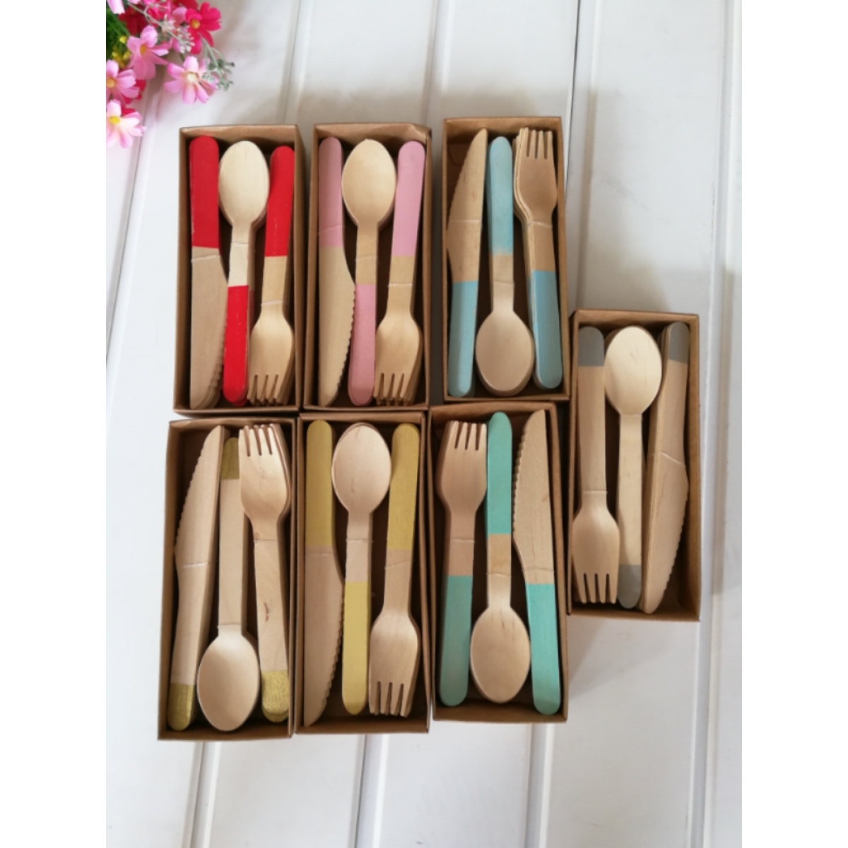 The whole set of knives, forks and spoons includes 8 wooden knives 16cm long, 8 wooden forks 16cm long and 8 wooden spoons 16cm long