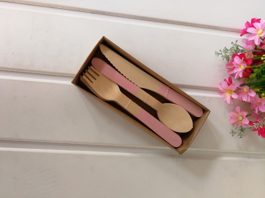 Disposable wooden knife, fork and spoon set.