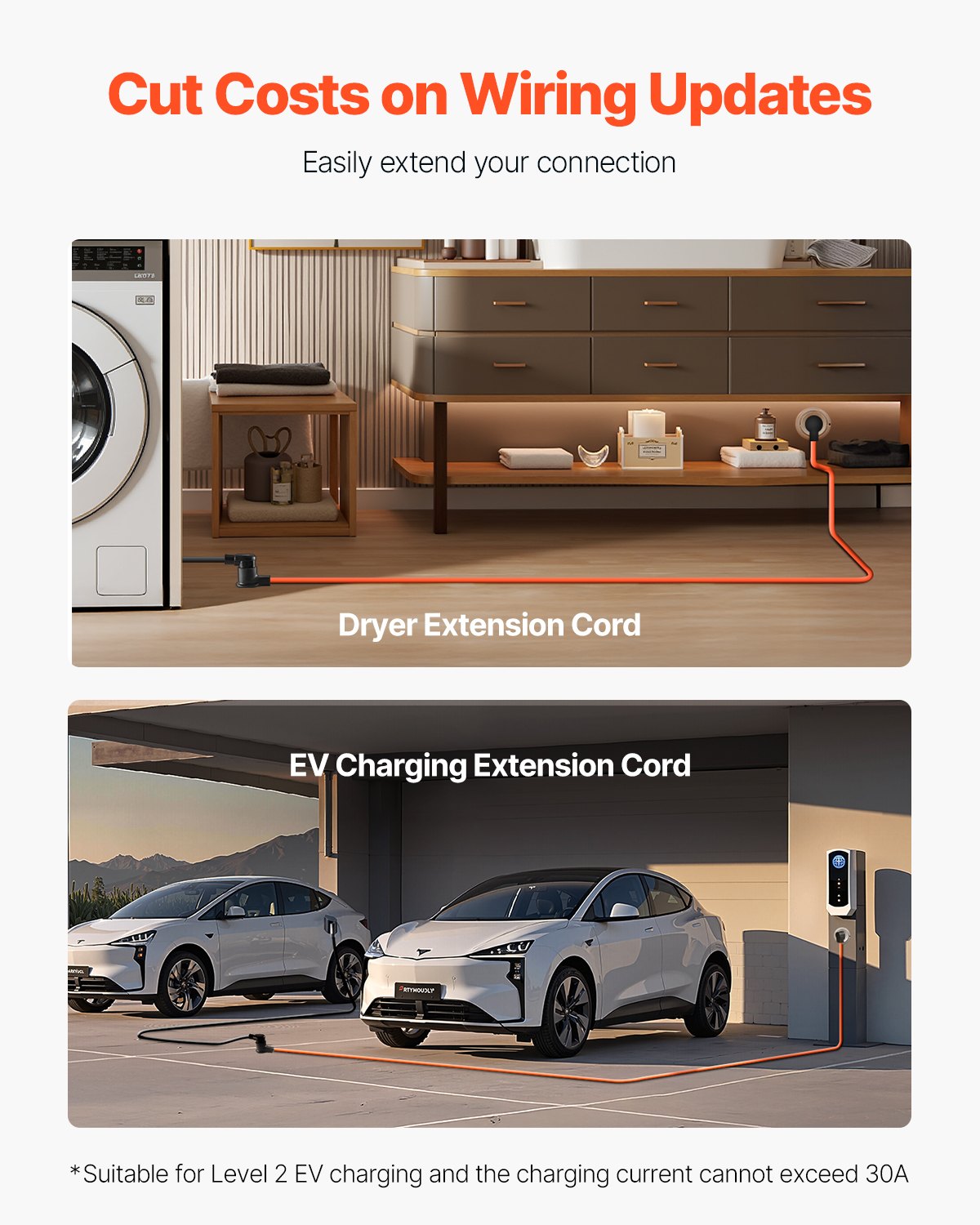 EV Charger Extension Cord: This dryer cord can serve as an extension for your EV charger, suitable for Level 2 EV charging, such as for Tesla Model 3, Model S, Model X, and Model Y (it is recommended to adjust the charging current to 30A or below)