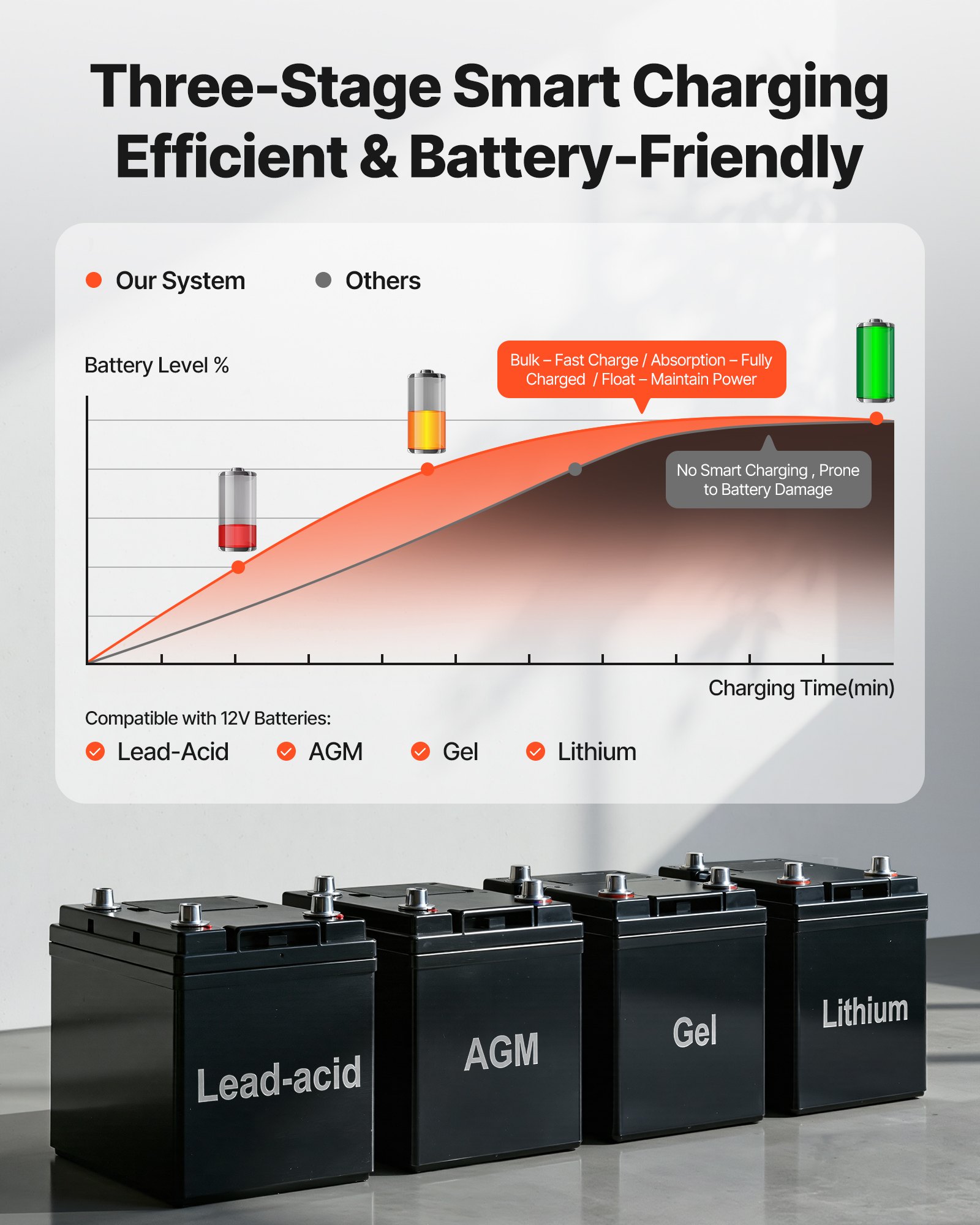 Battery-Friendly Charging: Equipped with 3-stage charging (Bulk, Absorption, Float), this basement protection sump pump inverter automatically optimizes battery performance and service life. Compatible with 12V Lead-acid, AGM, Gel, and LiFePO4 batteries