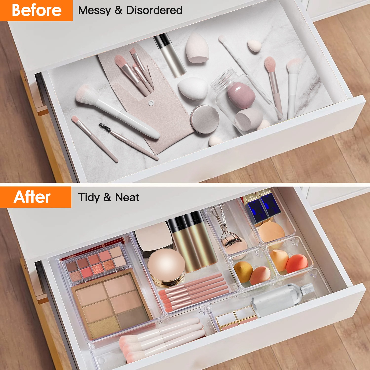 *Clear & Durable*:Made of premium PET,durable and sturdy. Features a minimalist and crystal clear outlook,our storage trays can pefectly fit in every drawer’s style.