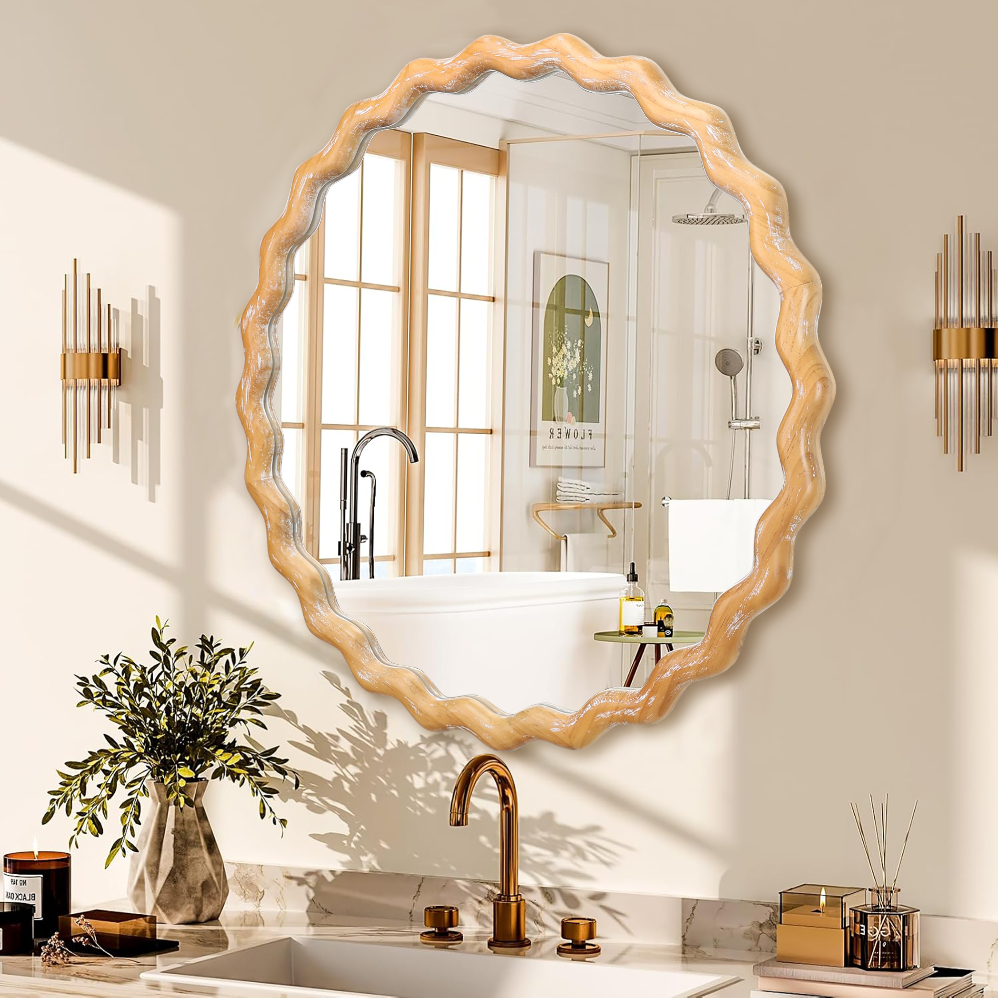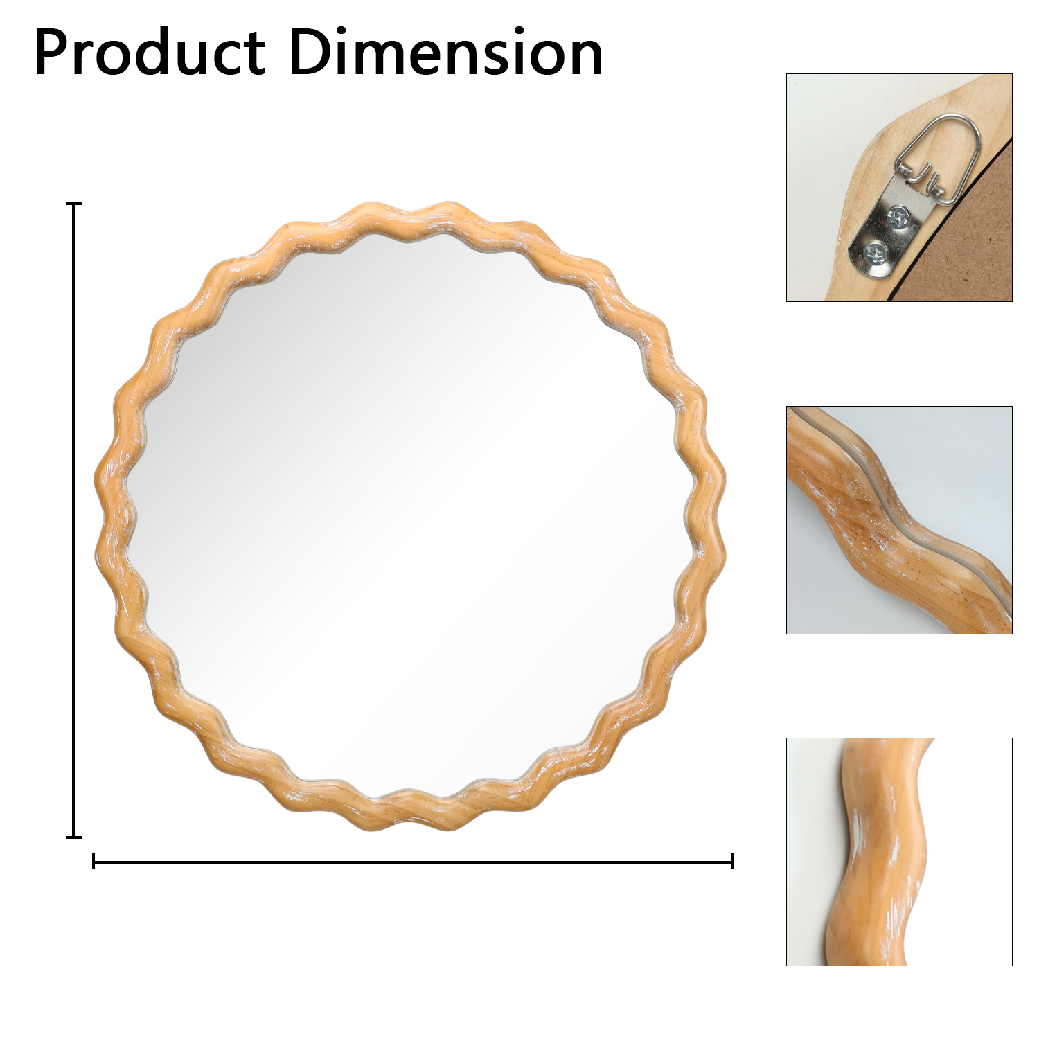 Product Name:27.5 inches Round wavy Wall Mirror for Bathroom Vanity, Wooden Farmhouse Circle Mirrors for Bedroom, Entryway, Living Room, Kithen Whitewash Edge Decorative Mirror for Home, Office
