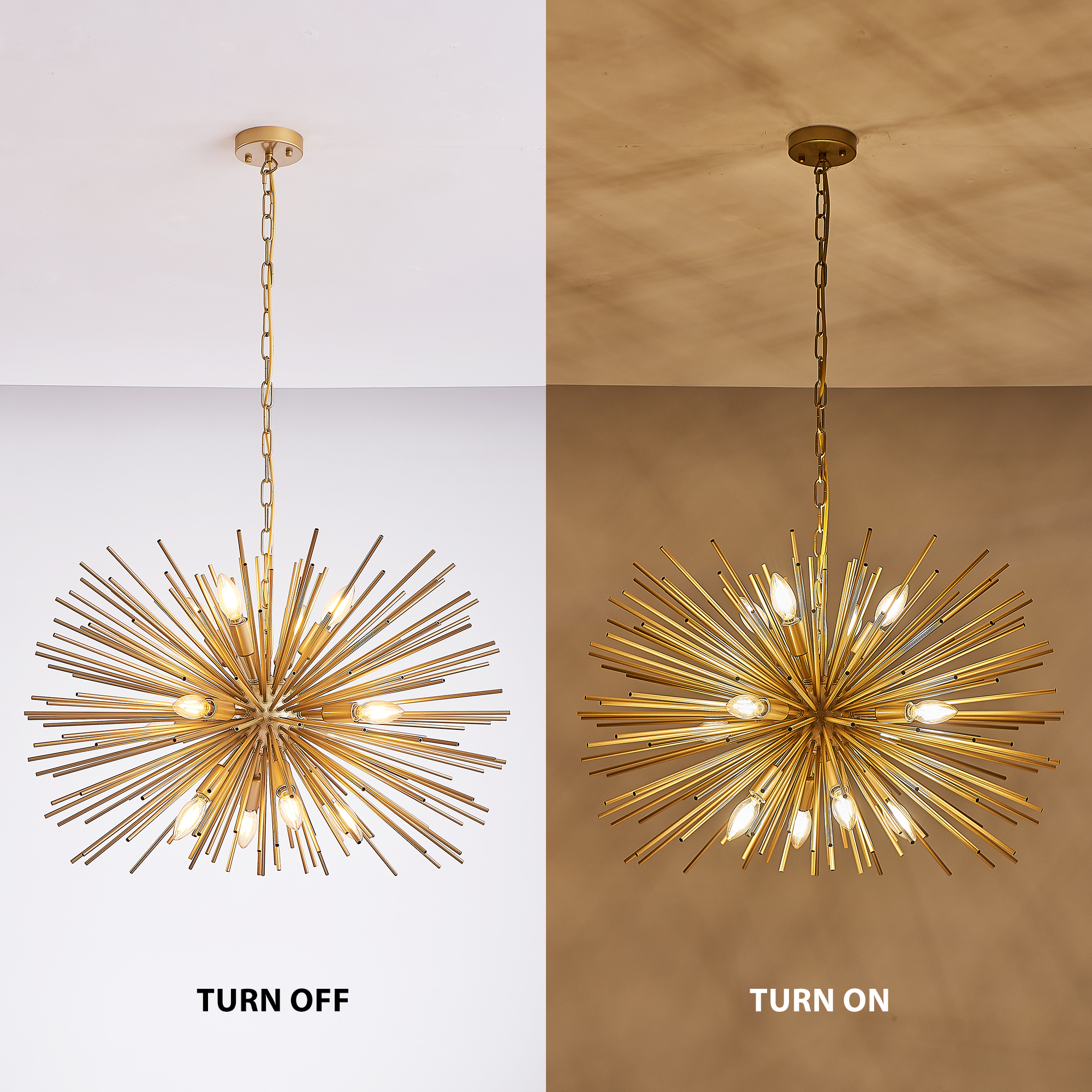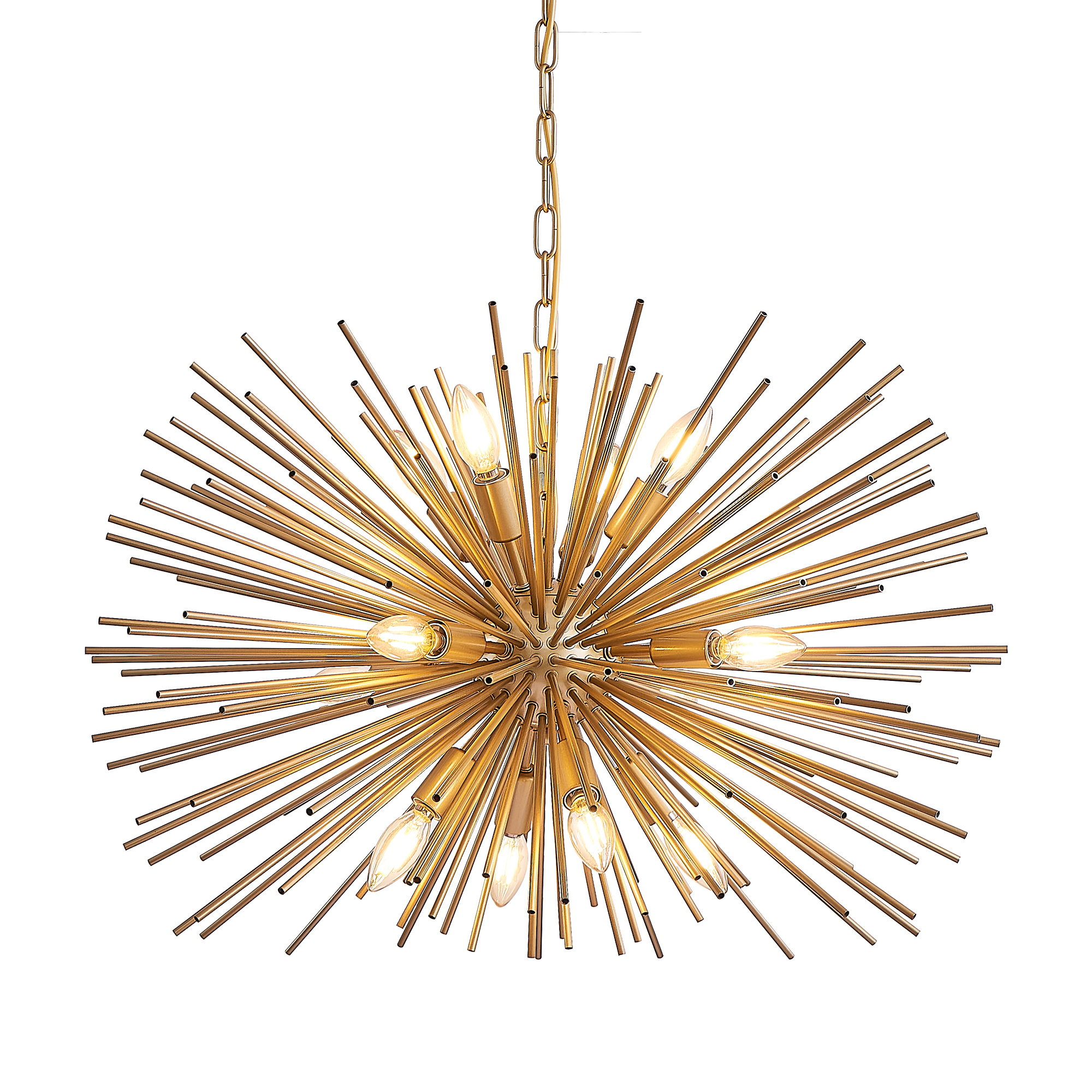 Unique Starburst Design: The eye-catching starburst shape offers a bold, stylish look that makes it a standout feature in any room, adding instant visual appeal and a sense of luxury.12-Light Fixture: Equipped with 12 E12 bulb sockets (bulb not included), this chandelier provides bright, even lighting perfect for larger spaces, such as living rooms, dining rooms, or foyers.Premium Gold Finish: The elegant gold finish creates a sophisticated, timeless look, effortlessly complementing both modern and classic interior designs, especially mid-century and contemporary styles.Versatile and Adjustable: With an adjustable chain suspension, this chandelier can be hung at your preferred height, making it suitable for various ceiling heights and room sizes.Easy Installation: Comes with all necessary hardware and instructions for quick and easy setup, so you can enjoy your stunning new chandelier right away.