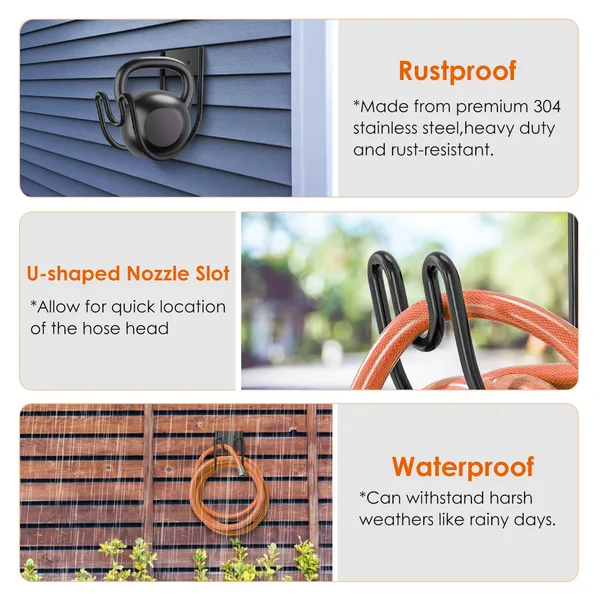 *Heavy Duty & Rust-resistant*:Made from premium 304 stainless steel,our hose hanger is waterproof and rust-resistant,withstand rainy weathers. Specially designed for long-lasting use without easily rusting or corroding,thereby extending its lifespan and reducing costs associated with damage and replacement due to rust.