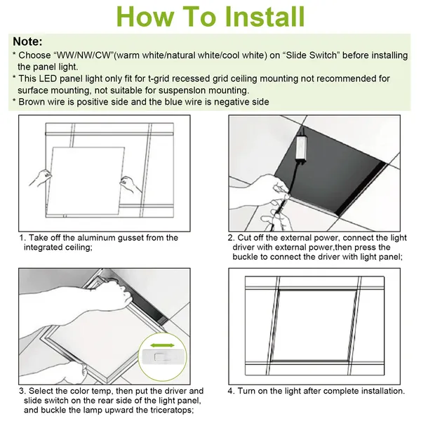 Friendly Reminder: * Choose 'WW/NW/CW'(warm white/natural white/cool white) on 'Slide Switch' before installing the panel light. * If you need to switch the color temperature after installation,you need to disassemble the light and adjust the color temp via the slide switch. * This LED flat panel lights are intended for drop down ceilings. If you need to mount on a flat ceiling without a drop ceiling,please purchase an additional 2x2 surface mount kit(Not Included). * Wire connecting:Brown wire connects with positive pole,blue wire connects with negative pole. *Specifications*: