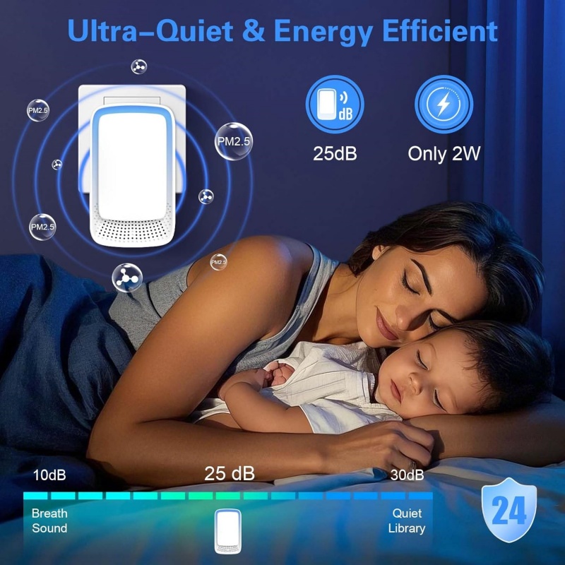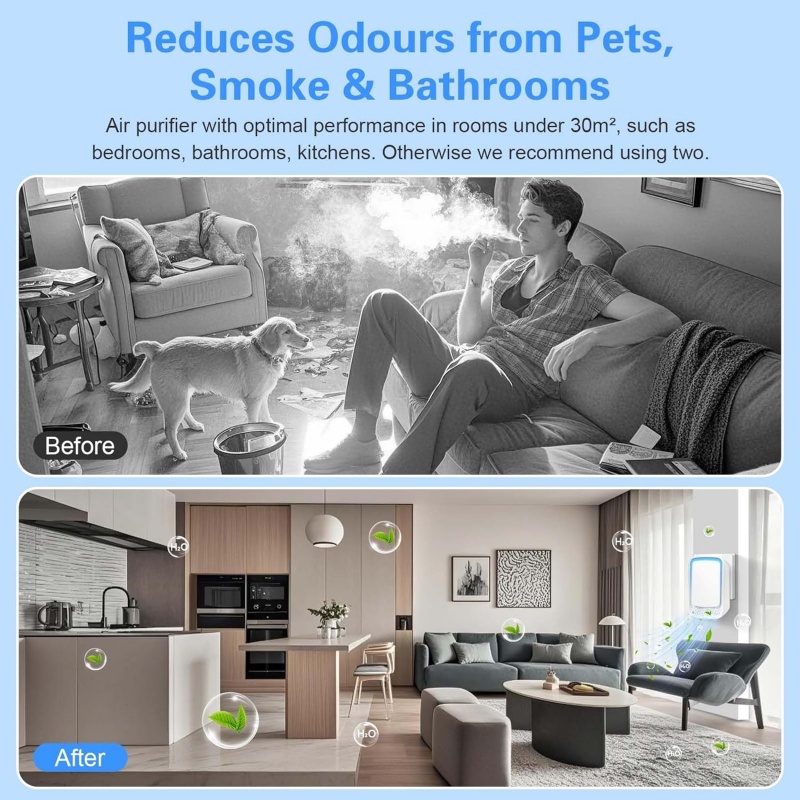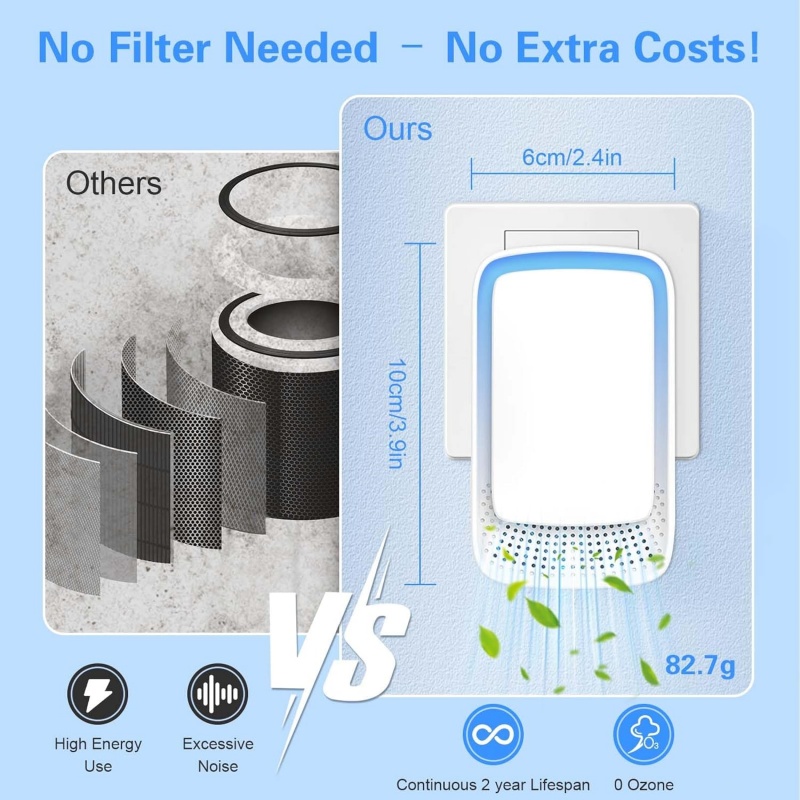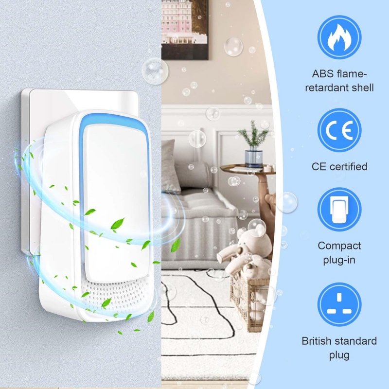 Plug & Play, No Maintenance Required – Simply plug it into any standard UK socket, and air purifier starts working instantly—no installation or filters to replace. A soft blue indicator light lets you know it’s active, making it easy to use. (Note: British standard plug – please check compatibility before purchase.)