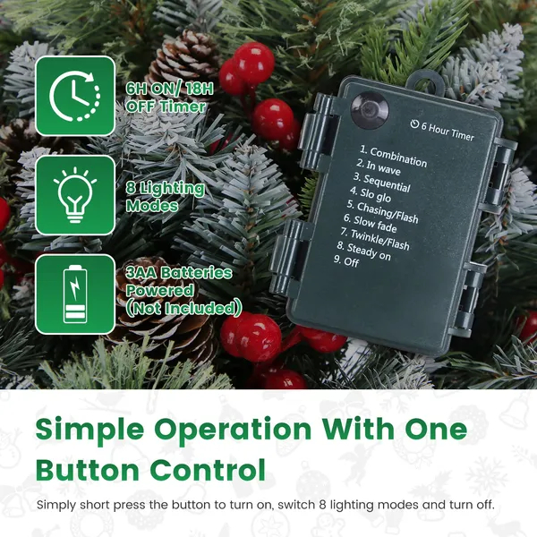 *Simple Operation*:Operation could not be simpler:just insert 3 AA batteries(not included) and use the one-button control to cycle through your favorite lighting effects. No outlets,no messy cords—just hassle-free holiday charm.