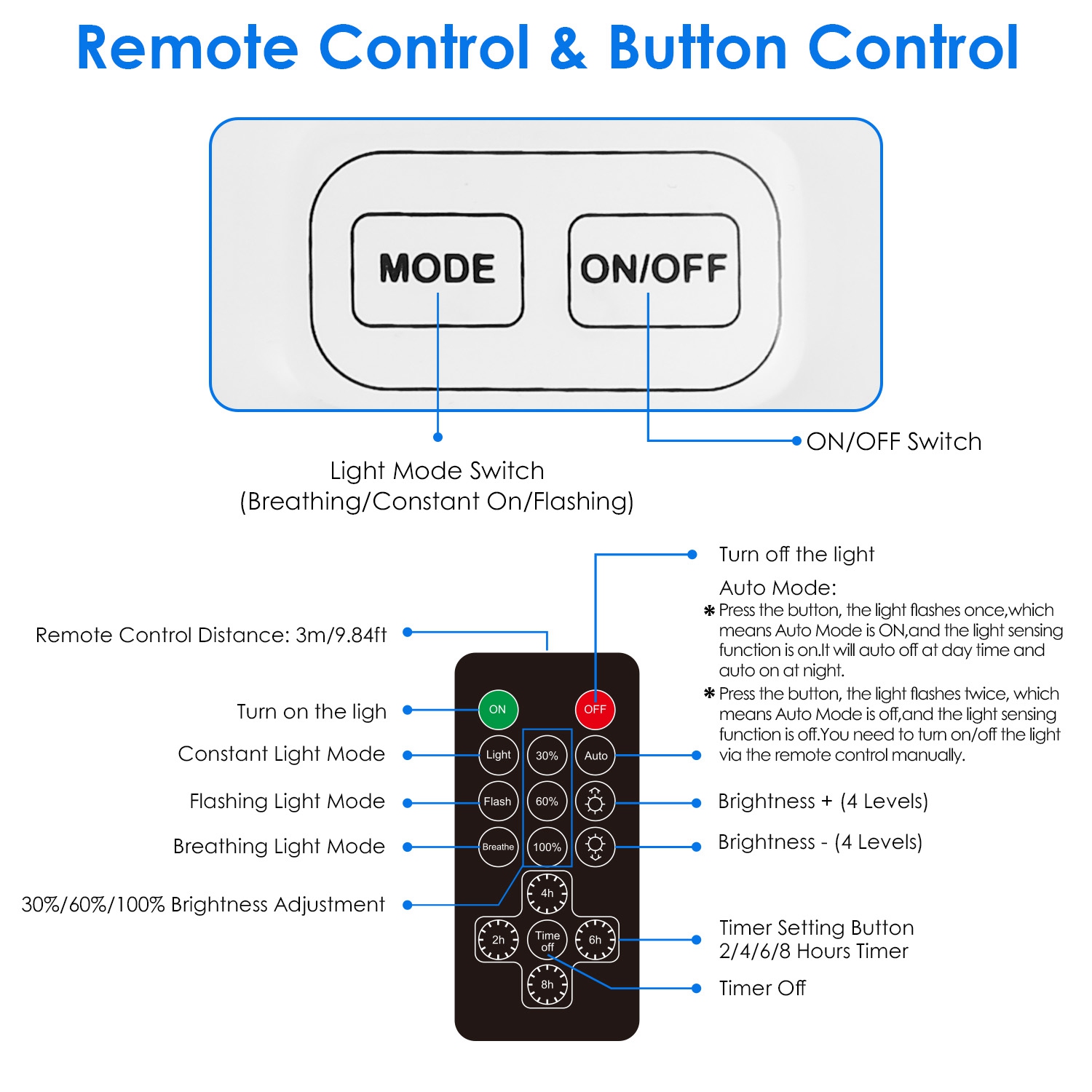 * Remote Control:ON/OFF;Auto Lighting Mode;Light/Flash/Breathe Lighting Mode;4-Level Brightness Adjustment;30%/60%/100% Brightness Adjustment;2H/4H/6H/8H Timer;Timer Off