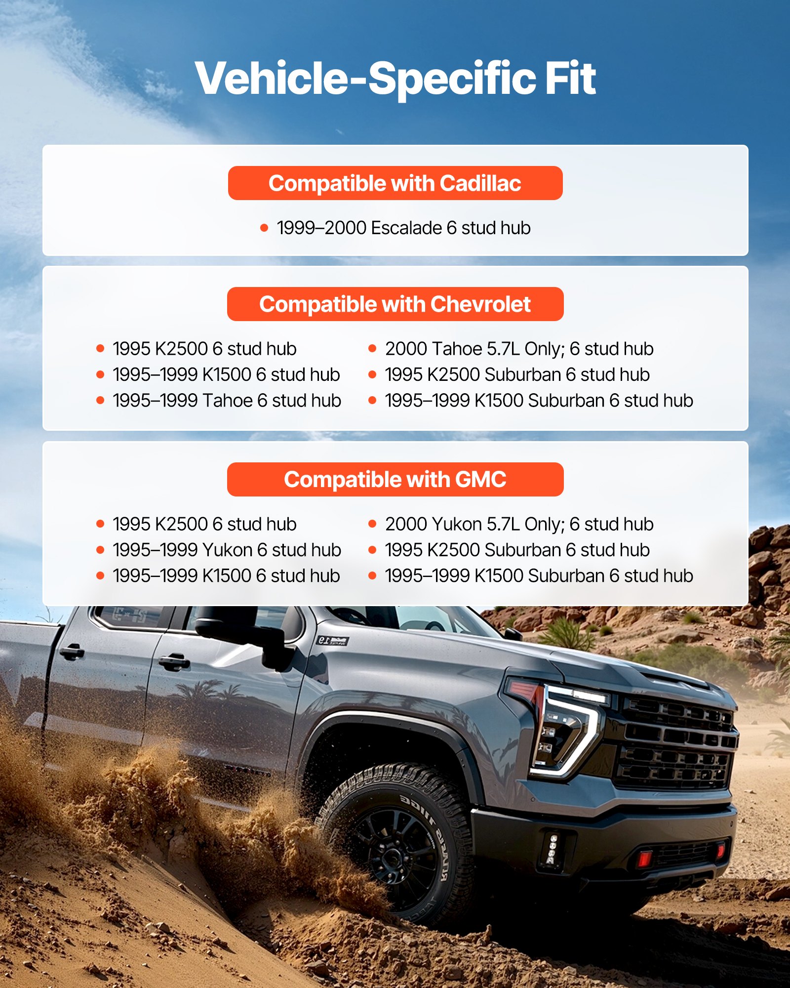 Vehicle Fitment: This wheel hub assembly is tailored for specific models, compatible with 1999-2000 Cadillac Escalade, 1995-1999 Chevy Tahoe, and GMC Yukon vehicles. Note: Please check the fitment chart on the page to confirm compatibility with your car
