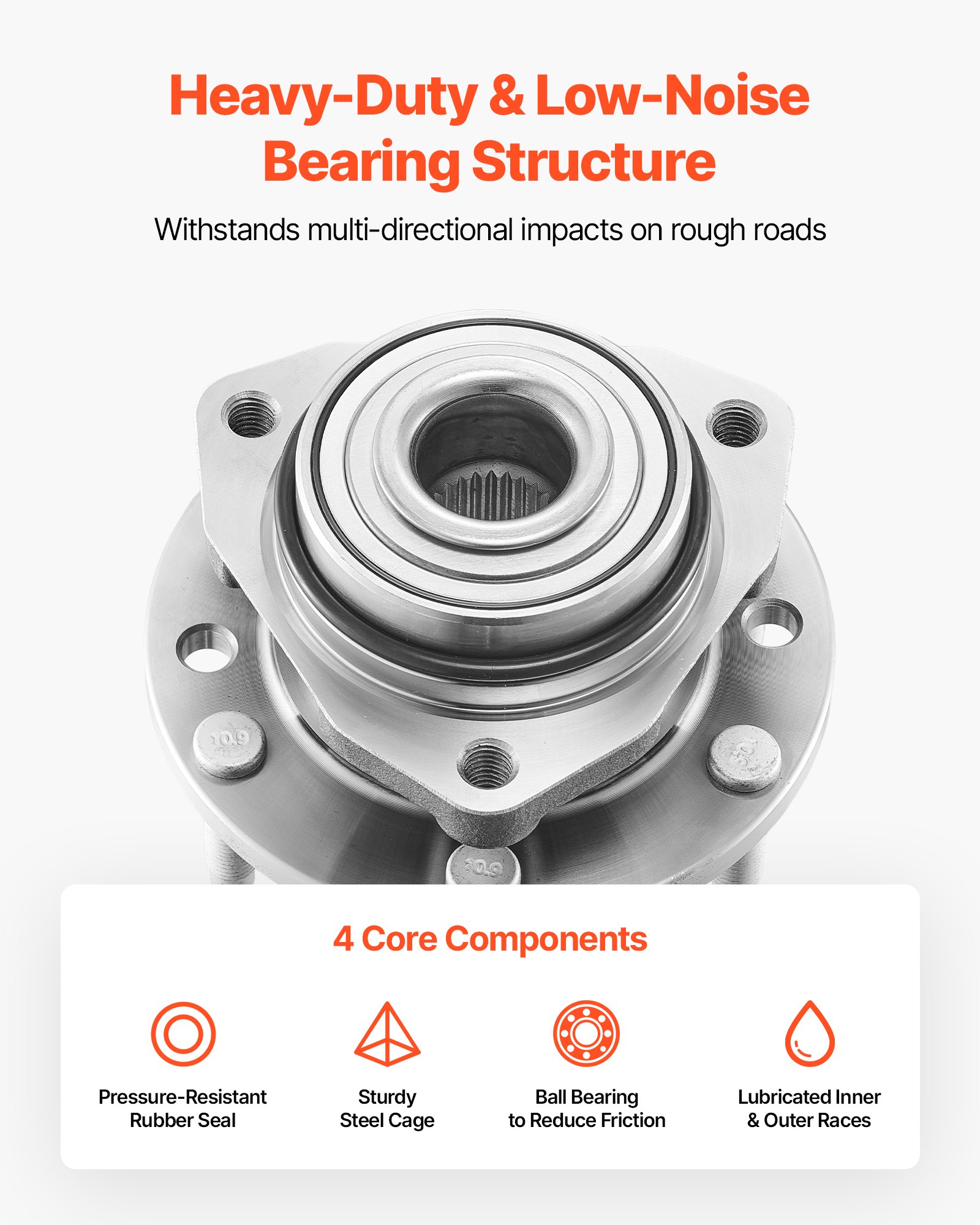 Industrial-Grade Steel Bearing: The wheel bearing is pre-lubricated to minimize friction and wear, and reduce noise. It can withstand multi-directional loads during steering, ensuring reliable handling