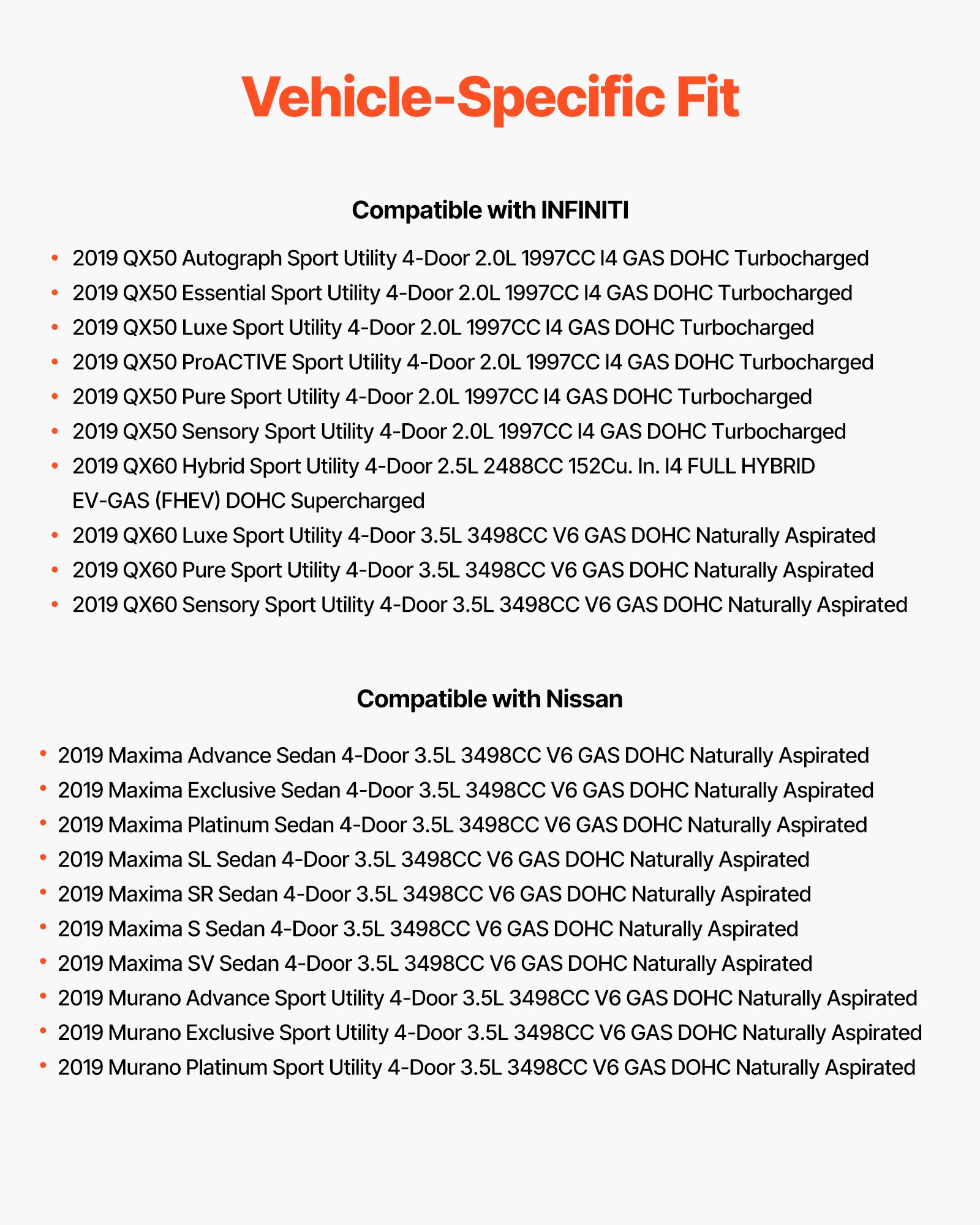 Vehicle Fitment: This wheel hub assembly is tailored for specific models, compatible with 2019 INFINITI QX50/QX60 Sport Utility and Nissan Maxima/Murano vehicles. Note: Please check the fitment chart on the page to confirm compatibility with your car