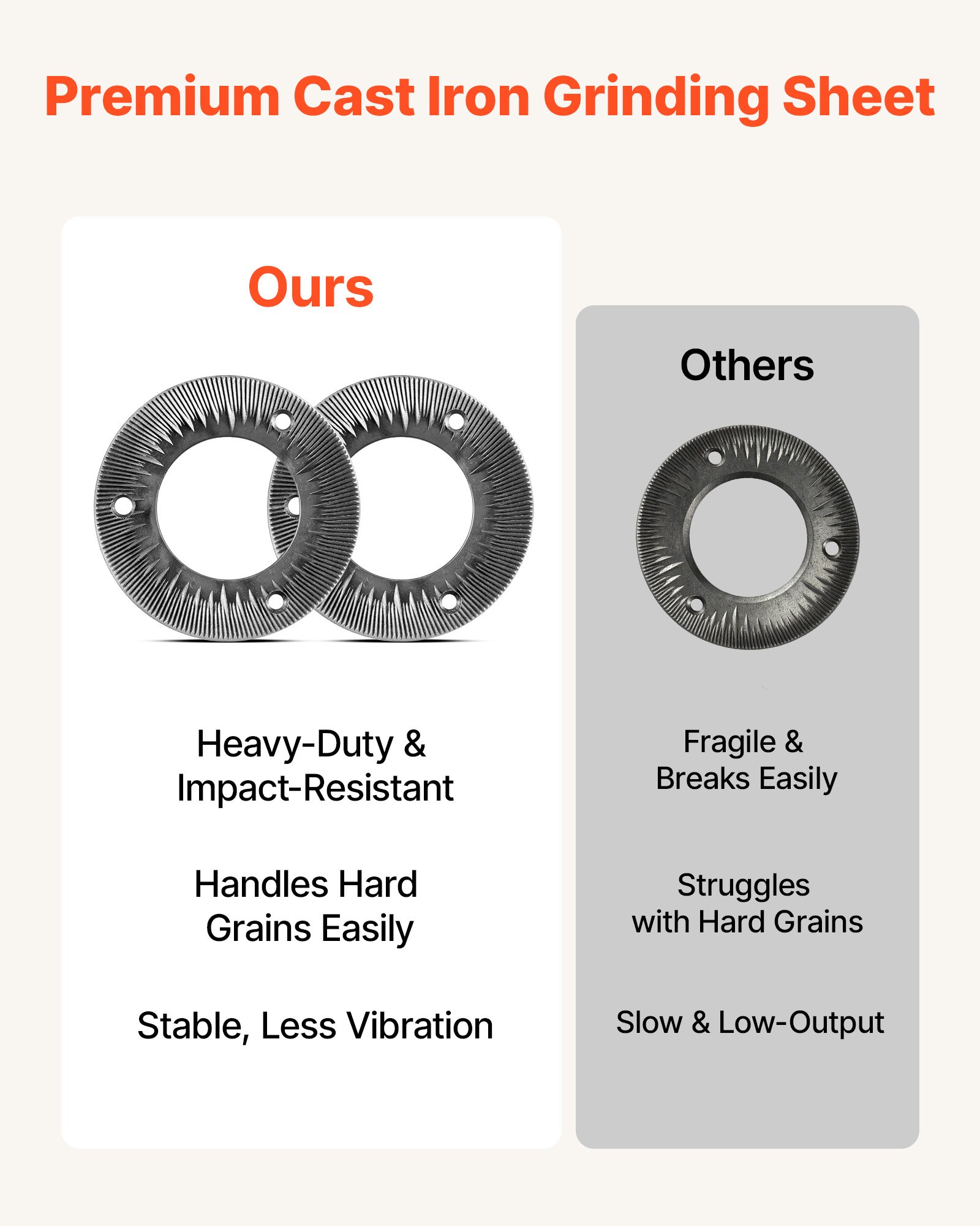 Durable to Use: Made from heavy-duty cast iron, the grinding plates for corn spice mill grinder offers a strong, impact-resistant structure that handles hard grains like corn and wheat with ease, delivering stable and efficient grinding performance