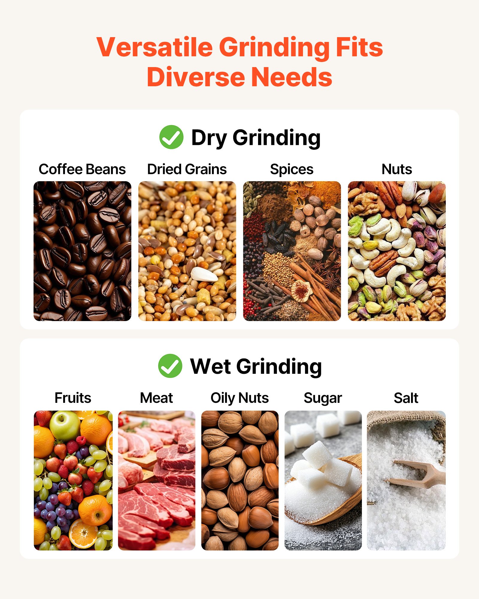Dry & Wet Grinding: VEVOR 2PCS grinding sheets for electric grain mills support both dry and wet grinding. Dry grinding sheet is ideal for coffee beans, grains, spices, and nuts, and wet grinding sheet can handle fruits, meat, oily nuts, sugar, and salt