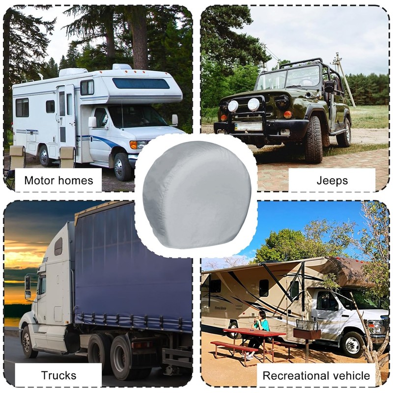 Silver Tire Cover has a silver glue sunscreen waterproof coating, Silver & black Tire Cover has a silver glue sunscreen coating on the inside and a waterproof coating on the outside.