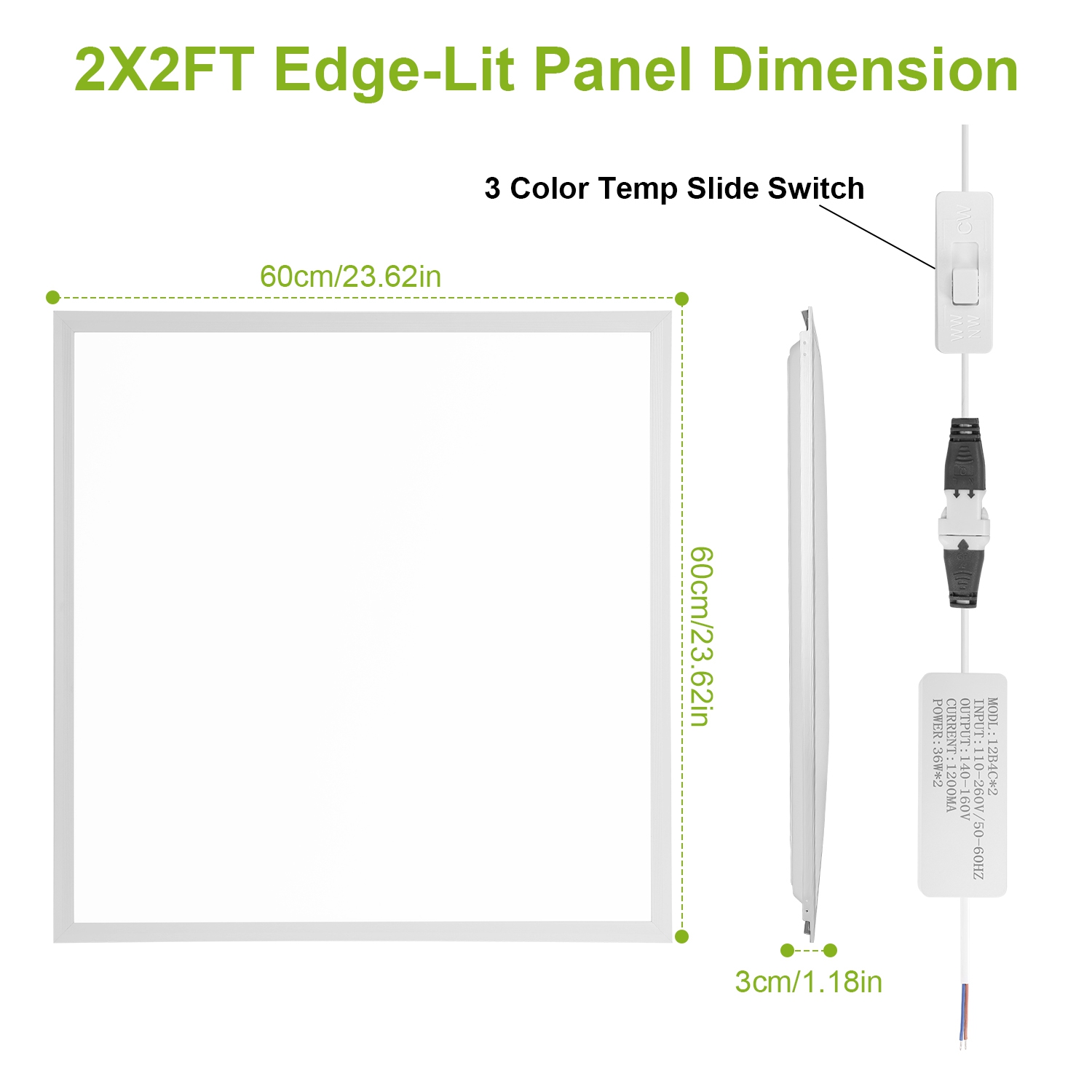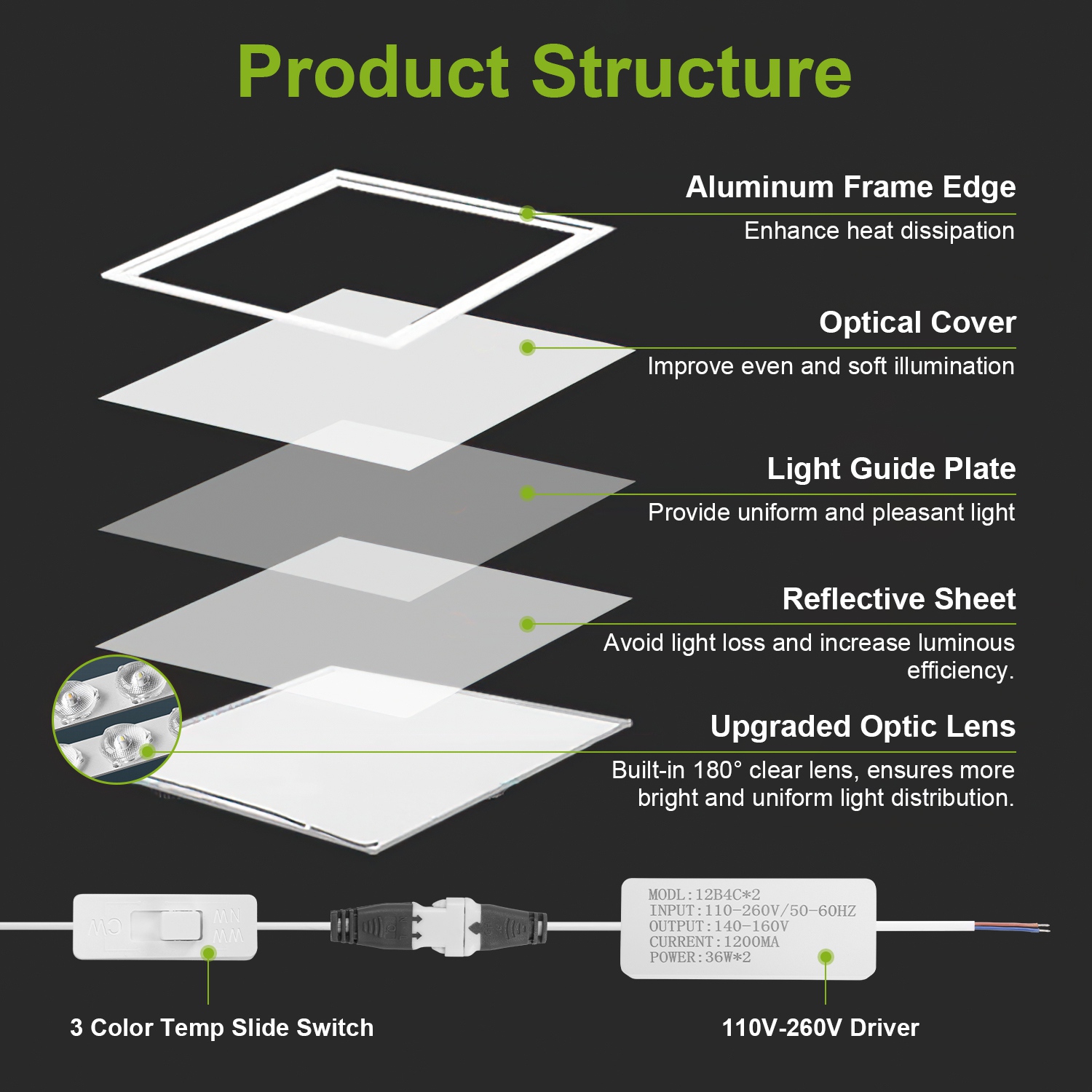 • *3 Color Temperature*:There is a color temperature slide switch on the cable between the driver and light of each 2x2ft LED flat panel light,choose 3000K/4000K/5000K(warm white/natural white/cool white) when installing. Besides,built-in 96Pcs SMD2835 LED beads,our panel light offers total 72W excellent lighting effect equivalent to 150W traditional fluorescent fixtures,saves up to 70% on electricity bill.