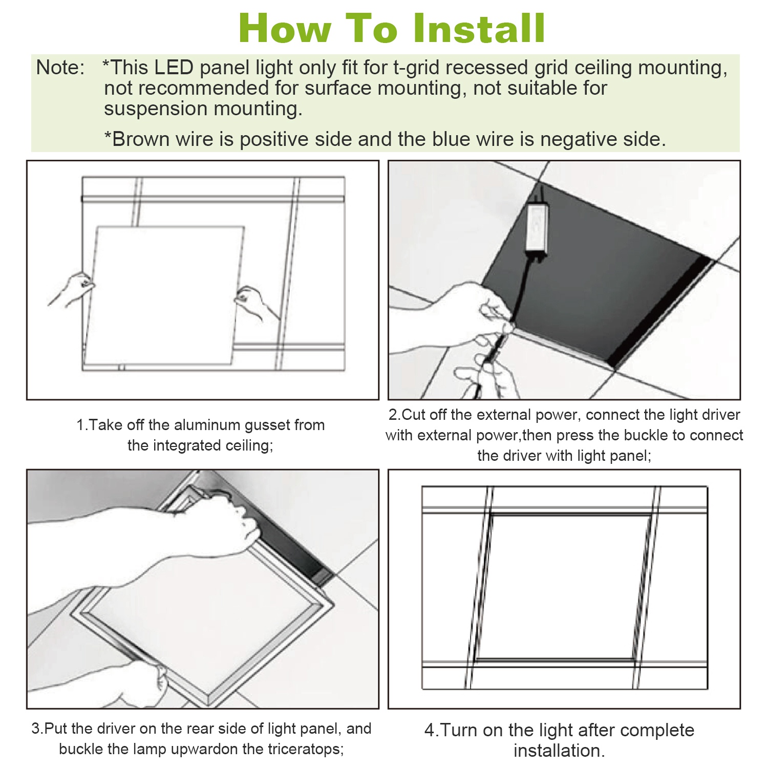 • ** Easy Installation*:Standard size makes it an awesome replacement for a 2×2FT fluorescent troffer fixture,easy to install with included user instruction. Note:This LED panel light only fit for t-grid recessed grid ceiling mounting,not suitable for suspension or surface mounting.