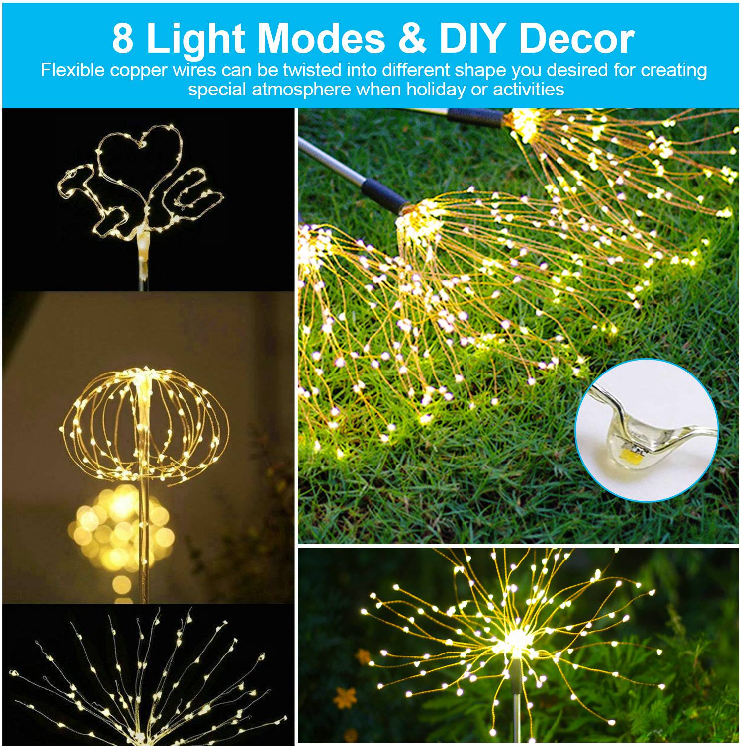 **240 LEDS DIY DECORATIVE LIGHTS*:Come with 2 solar starburst lights,each with 120 LEDs;Features 8 lighting modes changeable and its copper wires can be twisted into different shape,which is amazing to decorate your garden for creating the funny and special atmosphere you want when holiday or activities,such as Christmas,Birthday party,Halloween and so on.