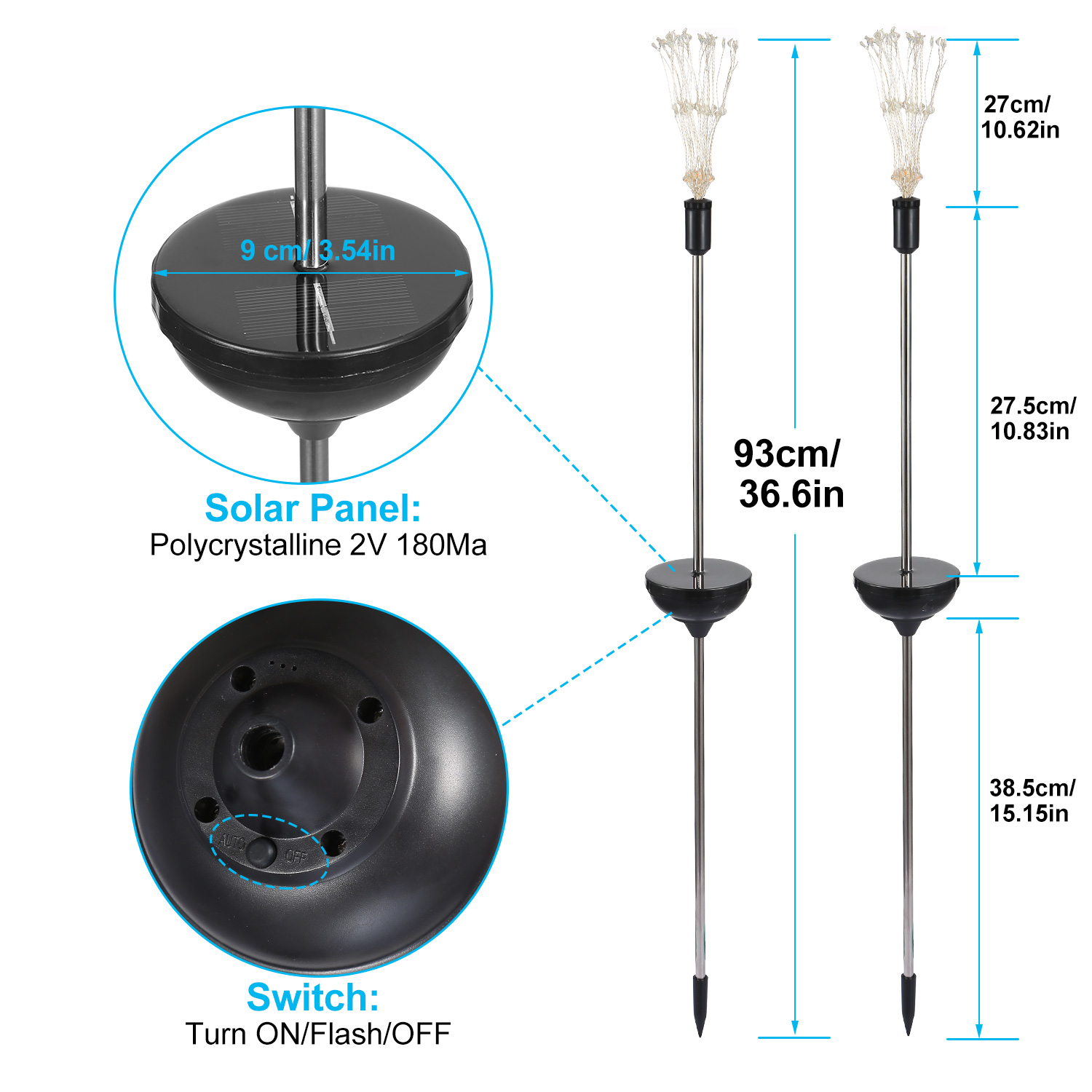 **IP65 WATERPROOF*:Our solar firework lights are heatproof and IP65 waterproof,which are made from premium aluminum alloy and ABS plastic. They won't be rust to ensure the long-lasting life and brightness of the lights.