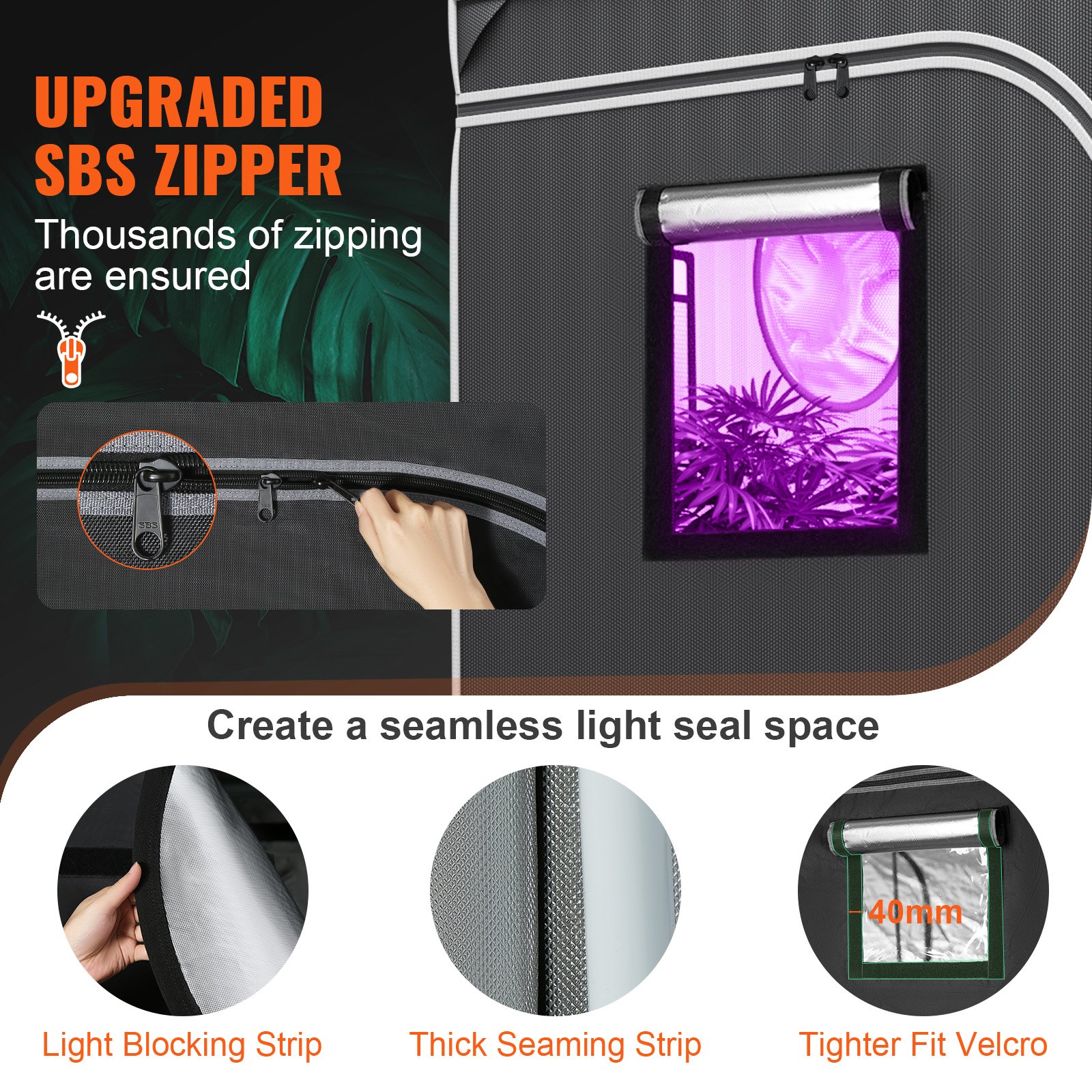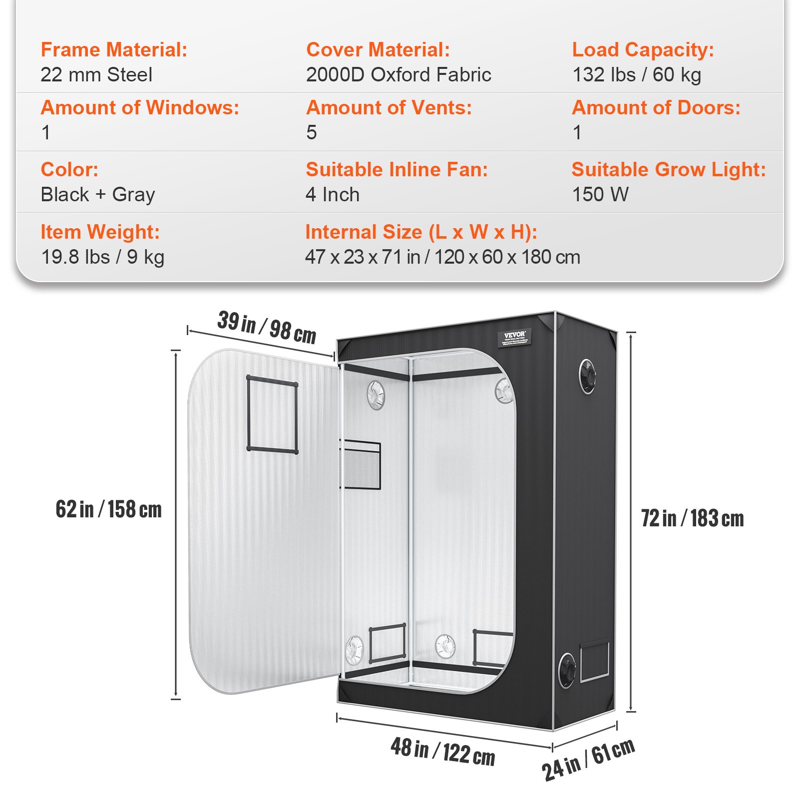 Built for Quick Installation: Are you ready to watch your plants flourish? VEVOR's advanced grow tent is made of robust 22 mm steel, forming a stable structure that can hold up to 132 lbs. It features metal connectors that are easy to assemble without the need for additional tools, saving time. Additionally, the tent has extra thickened triangular layers that prevent it from breaking, ensuring durability. Light up the Room: Our indoor grow tent has been upgraded with many details to provide a lightproof environment. We've added wider and thicker strips at every seam to block out light, and a premium SBS zipper ensures smooth and durable use, even after multiple openings and closings. A Cut from A Different Fabric: Our growing tent is made of high-quality tear-proof 2000D Oxford Fabric, which has higher density and provides more excellent light blockage than 600D. The tent's inner layer is made of 100% Reflective Mylar, providing your plants with a perfect growing environment. Use with Ease: Our 2 x 4 ft growing tent has visual windows that allow you to observe your plants at any time. The windows are surrounded by 40mm Velcro to prevent light penetration. We've also included a detachable floor tray and tool bag for easy maintenance and instant use of the tent. Versatile Uses: Embark on an indoor planting journey with VEVOR's hydroponic grow tent, perfect for garages, balconies, and homes. Achieve the perfect planting effect with VEVOR's 150 W grow light and 4 inch inline duct fan. Don't wait any longer, start your indoor planting journey today!