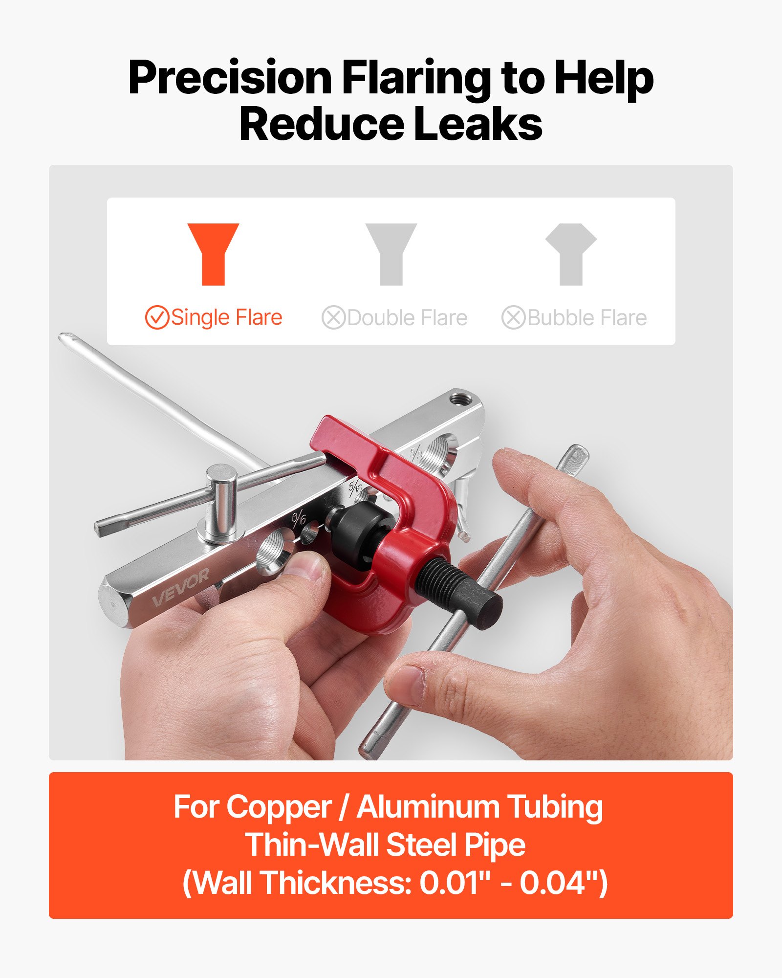 Wide Tube Compatibility: Featuring a 45° cone design that precisely forms single flares on brake lines, transmission cooling lines and HVAC piping. Compatible with 3/16", 1/4", 5/16", 3/8", 1/2", 5/8" O.D. copper, aluminum and thin-wall steel tubing