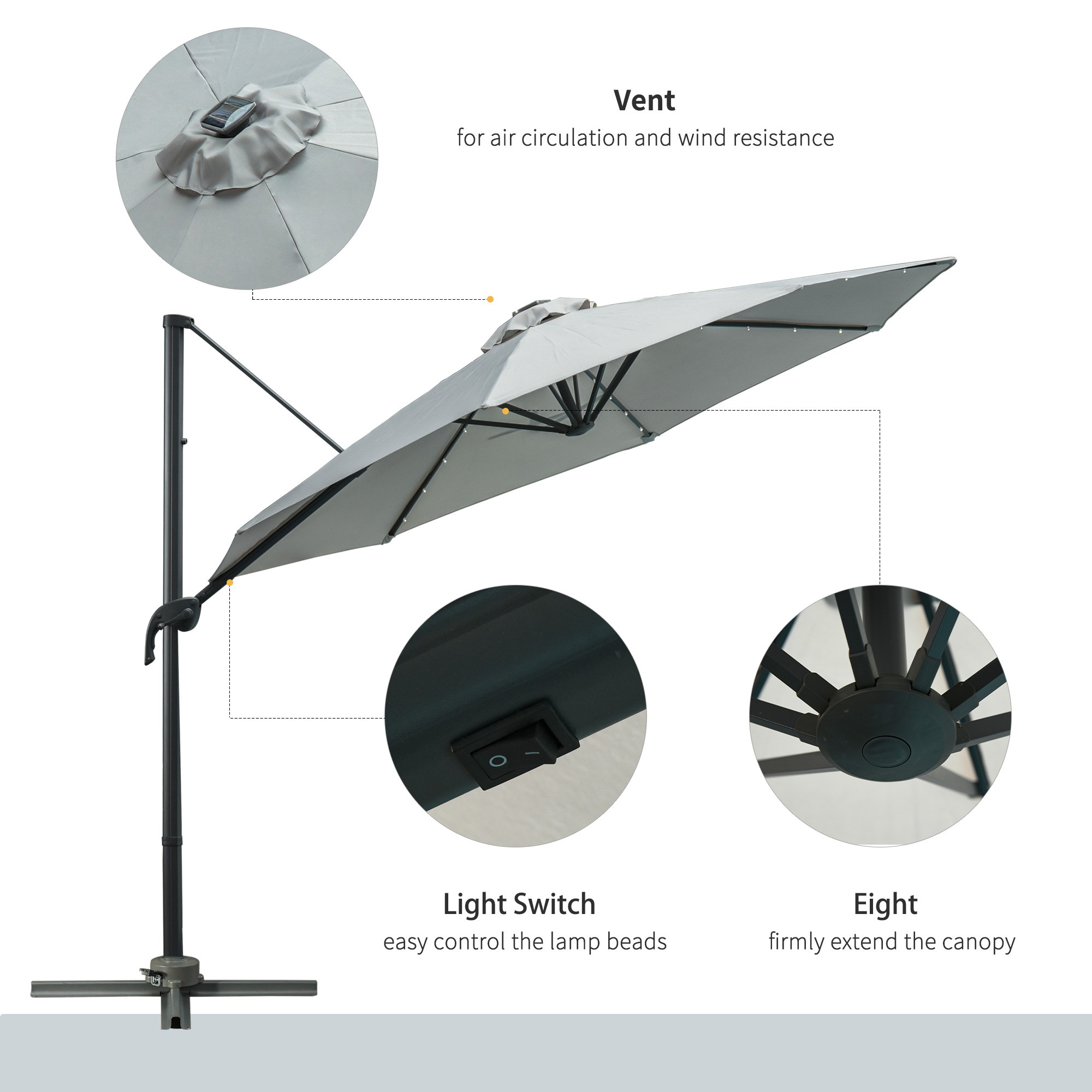Keep yourself protected whilst enjoying the sun all-day long with this large Cantilever parasol from . The polyester canopy provides protection from direct sunlight and heat. Using a crank mechanism for effortless opening and closing, the canopy can rotate a full 360 degrees to keep you covered all-day long. Powered by panel solar, the LED lights on the ribs can provide you more lights at night. The perfect blend of beauty and function.