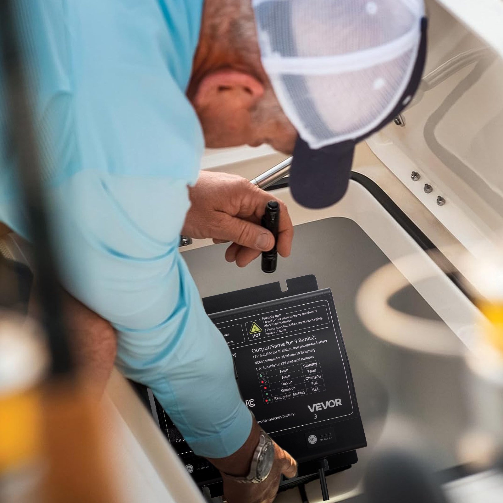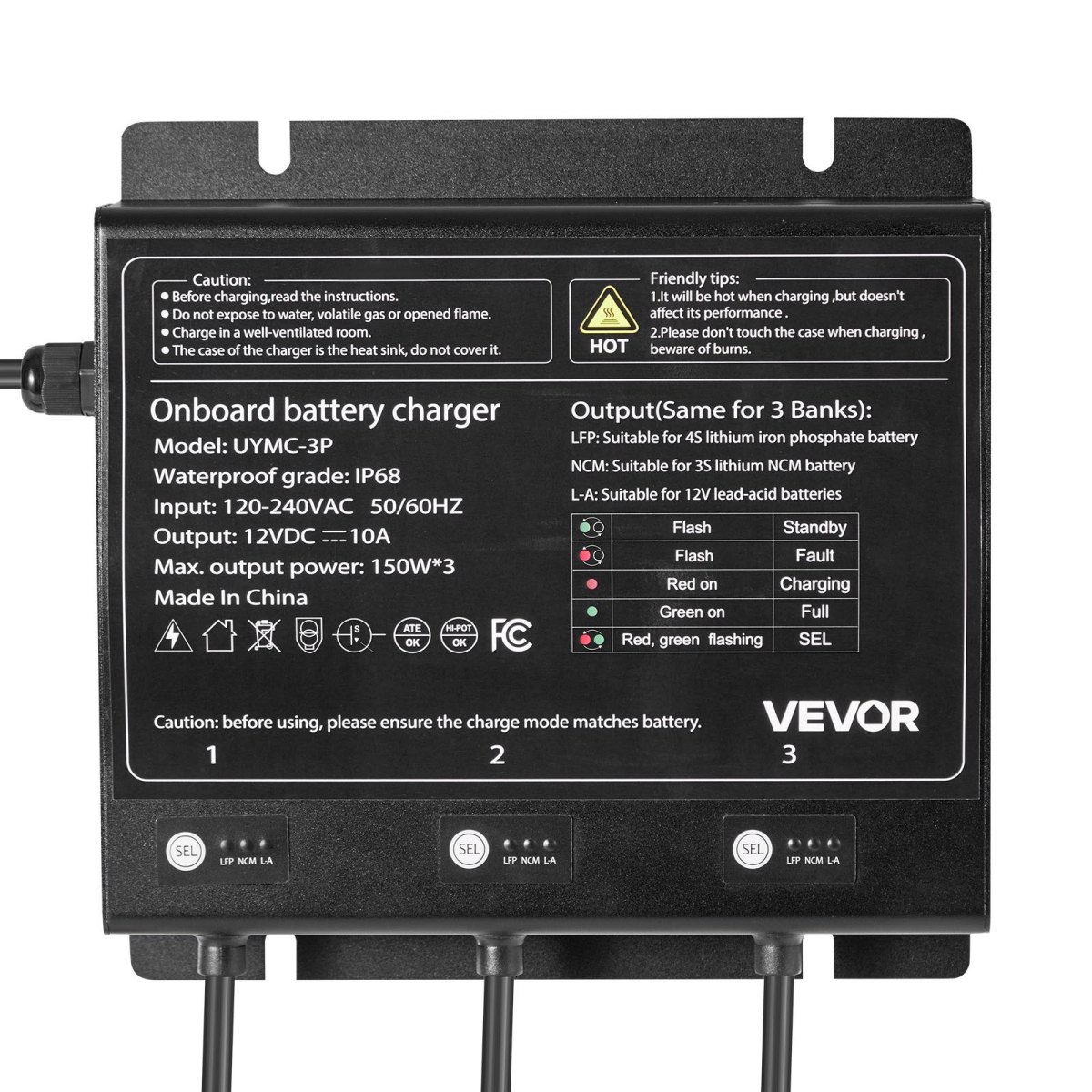 Marine Battery Charger: This marine battery charger provides a stable 3-bank 12V/10A output, compatible with lead-acid and lithium-ion batteries. Three charging modes (LFP, NCM, L-A) ensure efficient, secure charging for various battery types