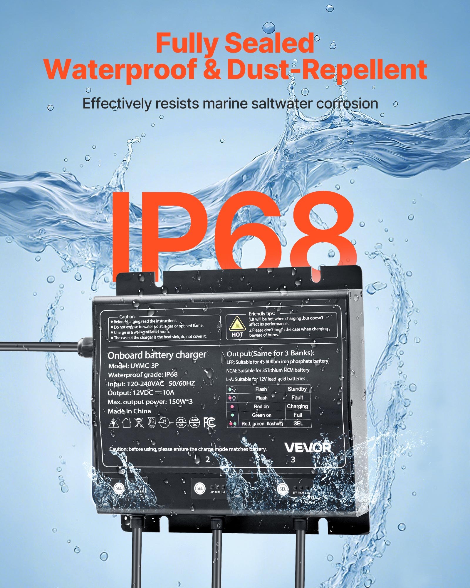IP68 Waterproof & Dust-Repellent: This boat battery charger provides IP68-rated resistance to water, dust, and salt, making it ideal for marine environments. It ensures reliable performance and shields onboard power systems