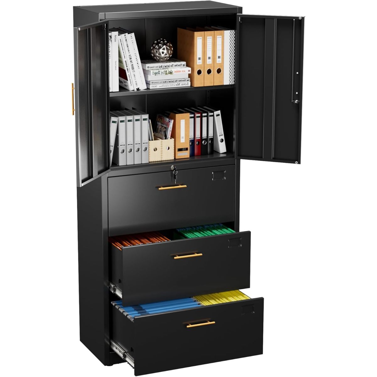 Novel and Upgraded Design for Versatile Storage: The lateral file cabinet with 3 drawer combines a robust metal storage cabinet with adjustable shelf to accommodate items of varying heights, along with 3 lateral drawers featuring 6 adjustable hanging bars for seamless organization of A4, Letter, or Legal-size folders. This innovative design optimizes space and flexibility for home, office, garage, or school use;