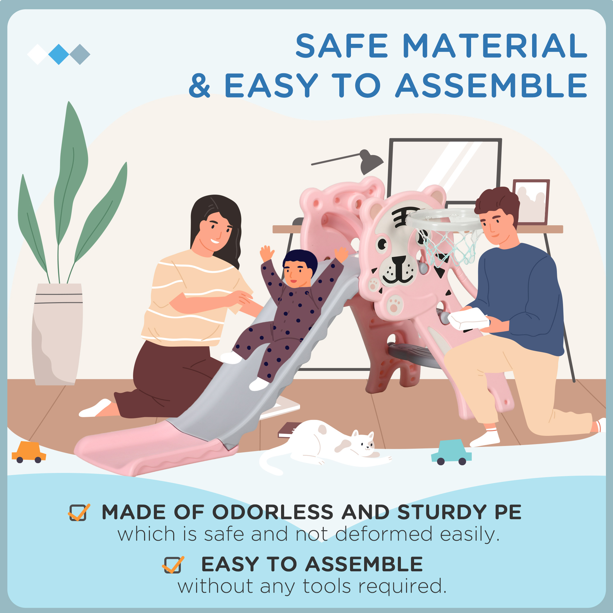 Introducing this exciting kids slide from , turning your home into a wonderful playground. A charming tiger-themed design with a blue body, it adds a fun and playful touch to your child's play area. More than just a slide, there's a basketball hoop on the side for extra fun and games. Assembly is a breeze, taking just 10 minutes. Elevate their playtime with this practical side – where safety, creativity and fun merge into a delightful experience.